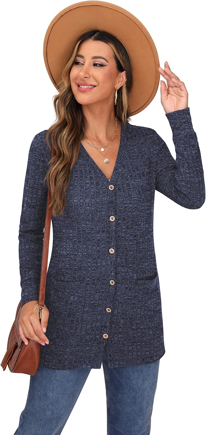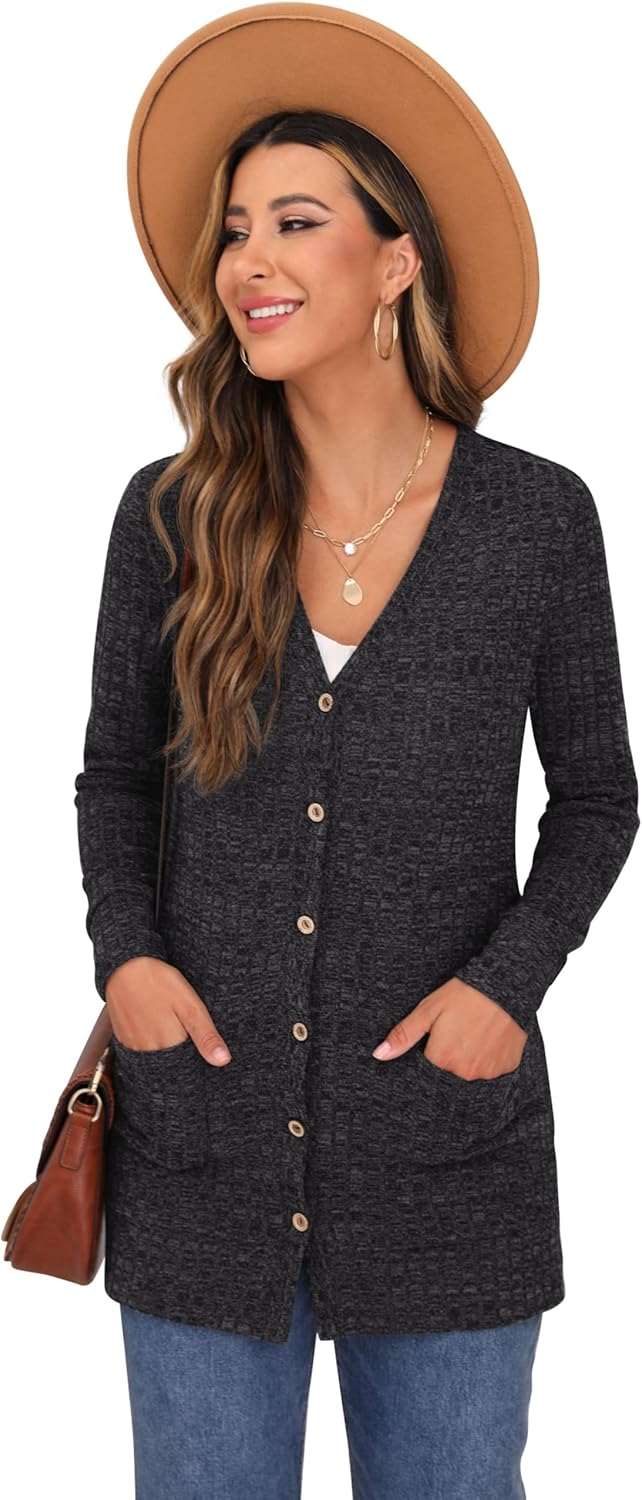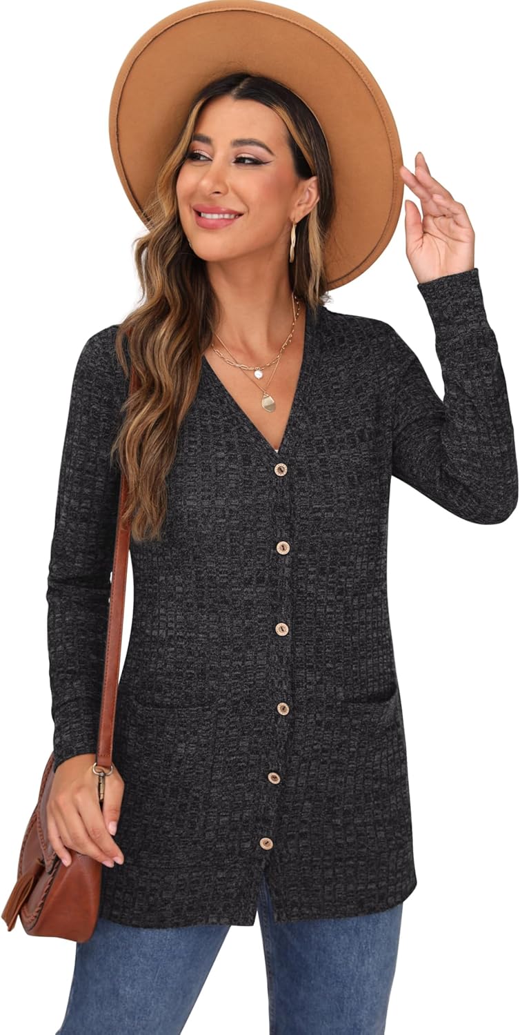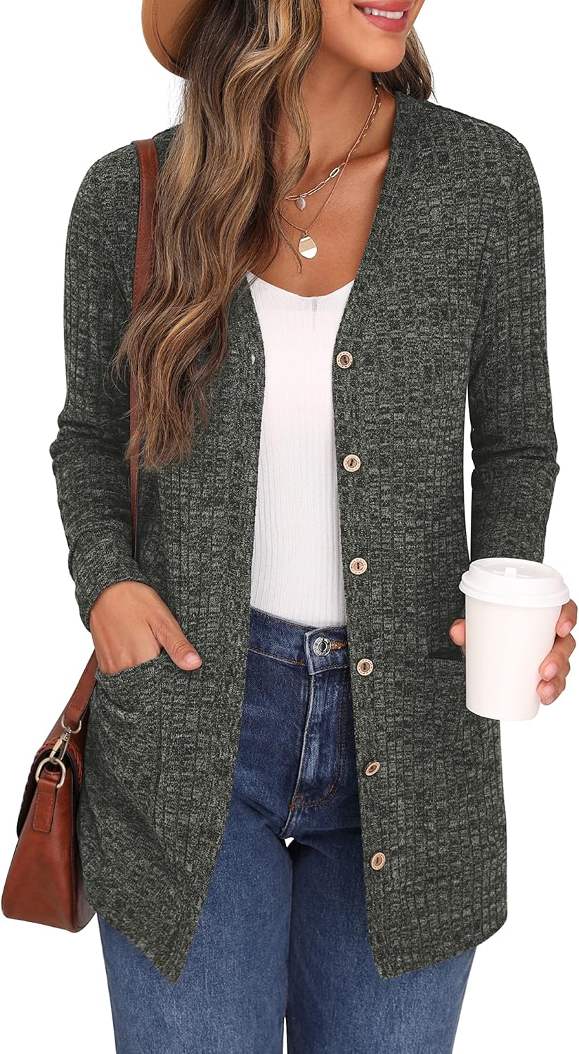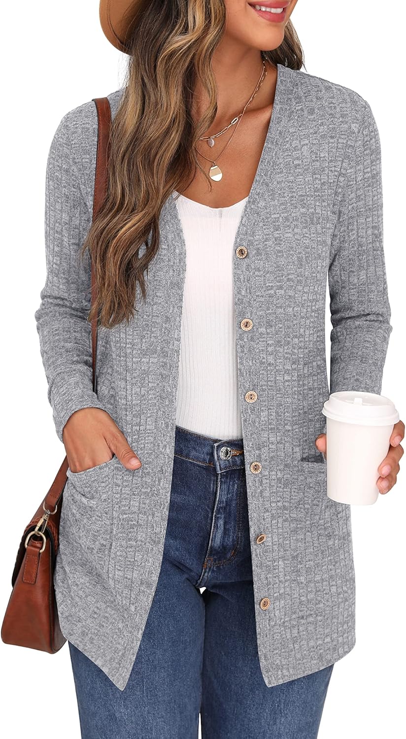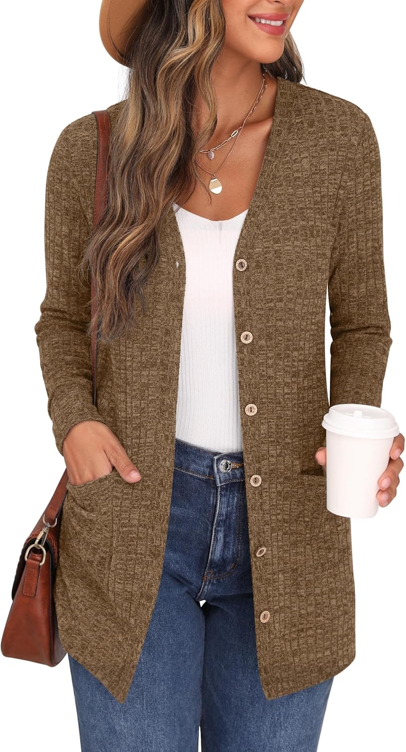 Cardigan Long Sleeve Open Front Cardigans Button Down V Neck Ribbed Knit Lightweight Outerwear with Pocket