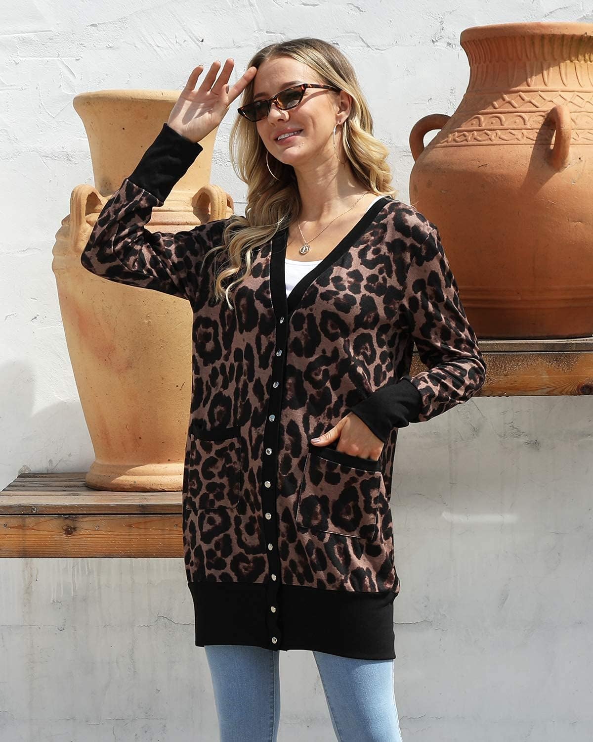 Features: long sleeve, leopard print, solid color, snap button down, cover up, below hip length, relaxed fit, v neck, open front, loose fit, casual and boyfriend style, two side pockets