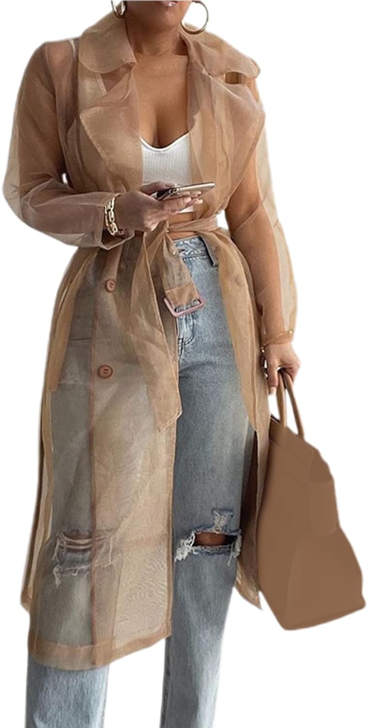 See Through Trench Coat Lace Up Summer Spring Solid Sheer Mesh Long Sleeve Button Coat Shirt Outerwear Cardigan Long Jacket