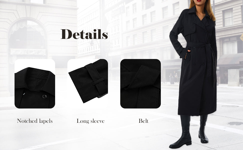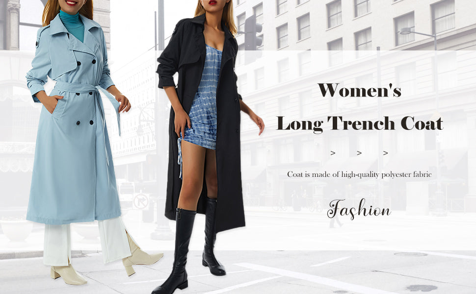 Features: Notched lapel and button closure, elegant classical long trench coat with slits and belt under, long, warm coat, windproof, popular, high-density fabric lining full lining, durable, our classic double-breasted trench coat comes in a variety of colors, so you can find a trench coat that complements your skin tone and personal style. Our women's waterproof coats also have two deep pockets that you can use to store your essentials.