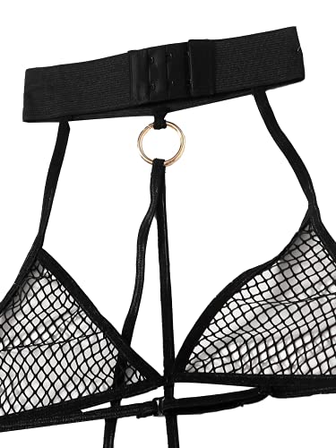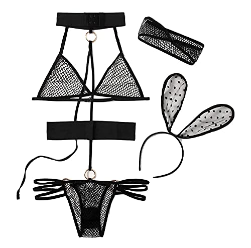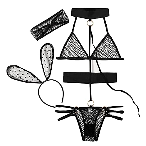 Women's Sexy Bunny Cosplay Lingerie Naughty Fishnet Teddy Bodysuit Bandage Bikini Roleplay Costume Mesh Bra Panty Sets Black