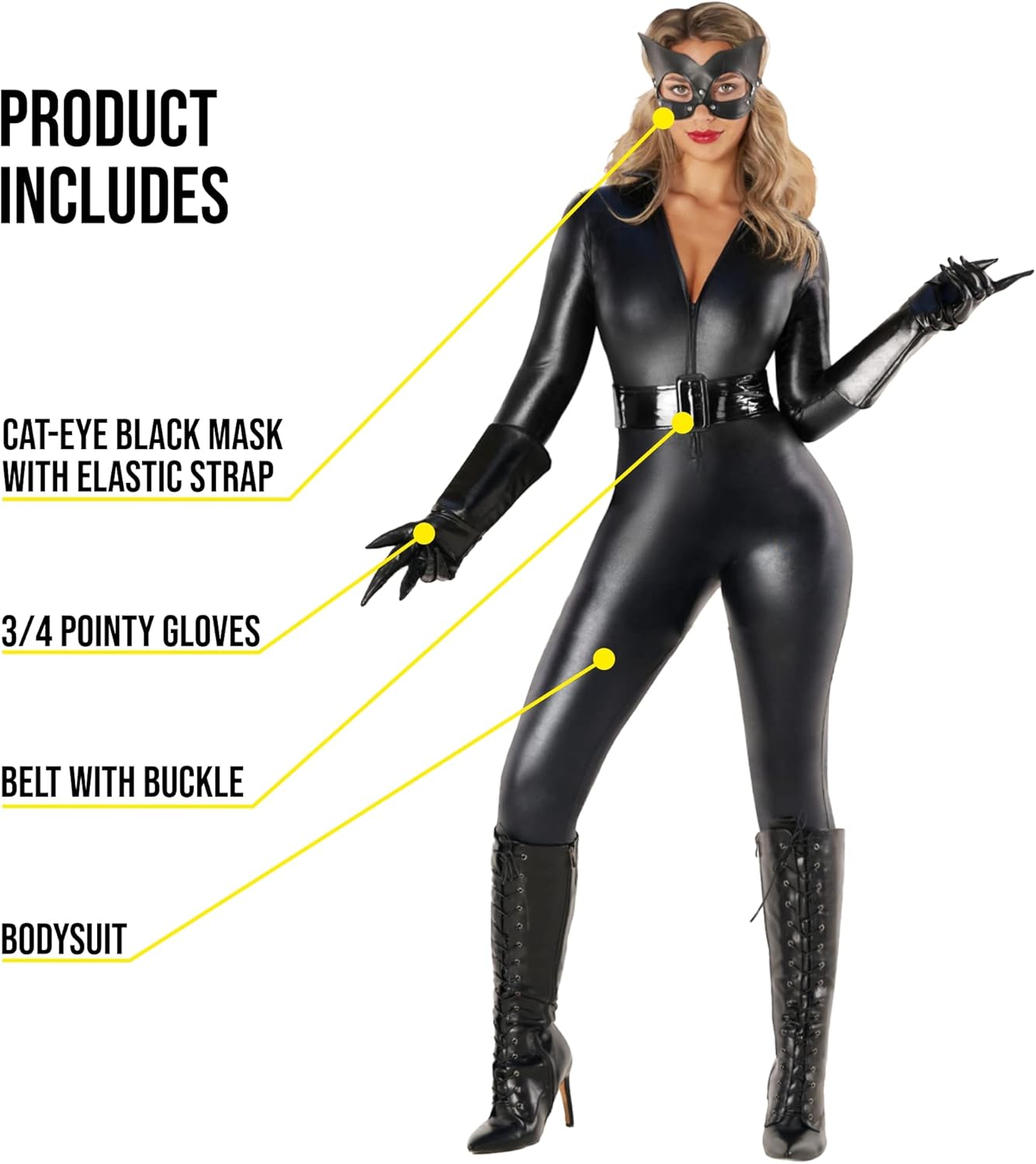 Complete black cat transformation: This all-in-one adult cat costume includes a sleek, stretchy black catsuit for women, an adjustable belt with functional buckle, 3/4 length pointed gloves, and a signature cat-eye mask for a dramatic, ready-to-wear look.