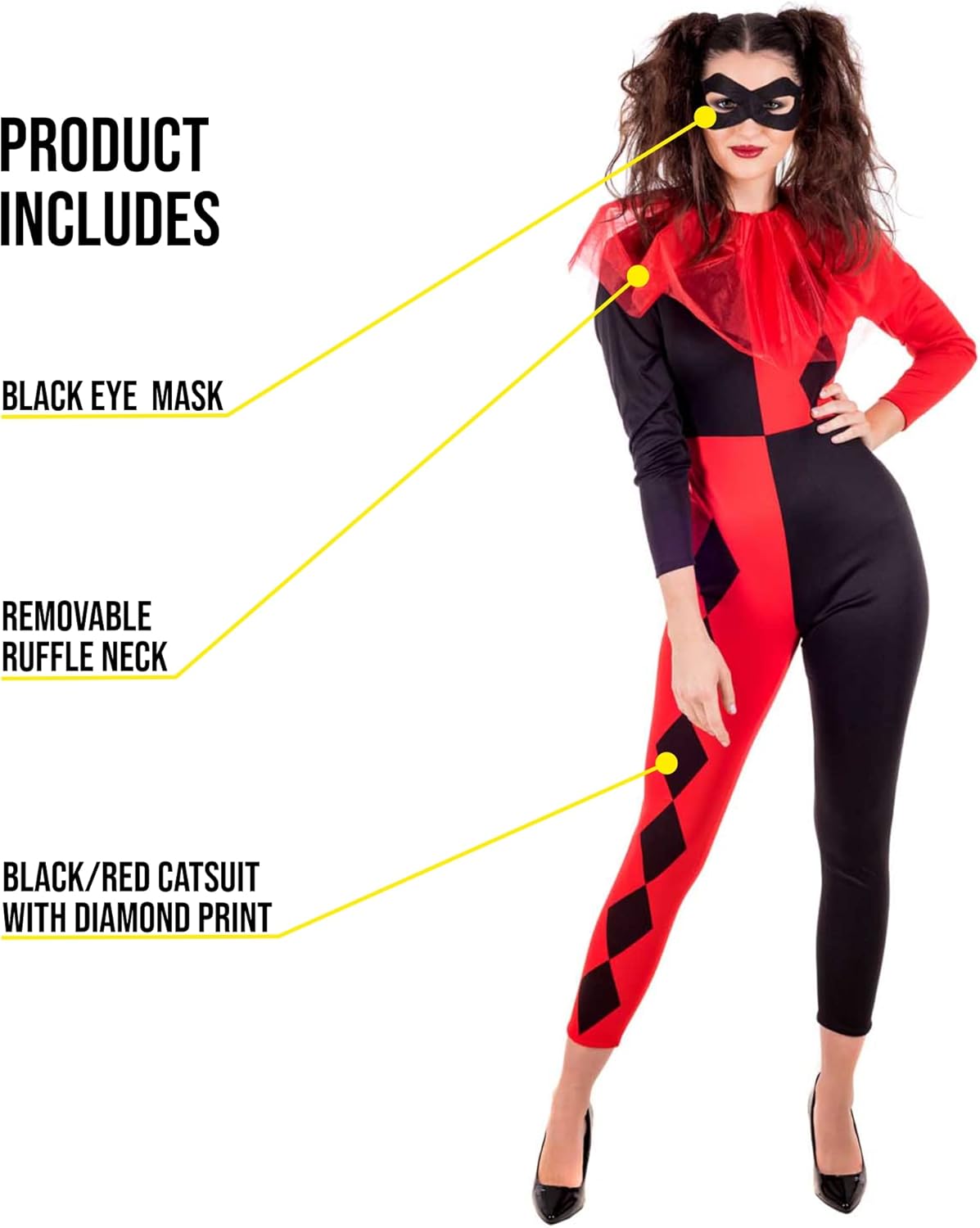 Jester halloween costume women includes a black & red all in one cat suit with diamond print detail, red neck ruffle & black eye...