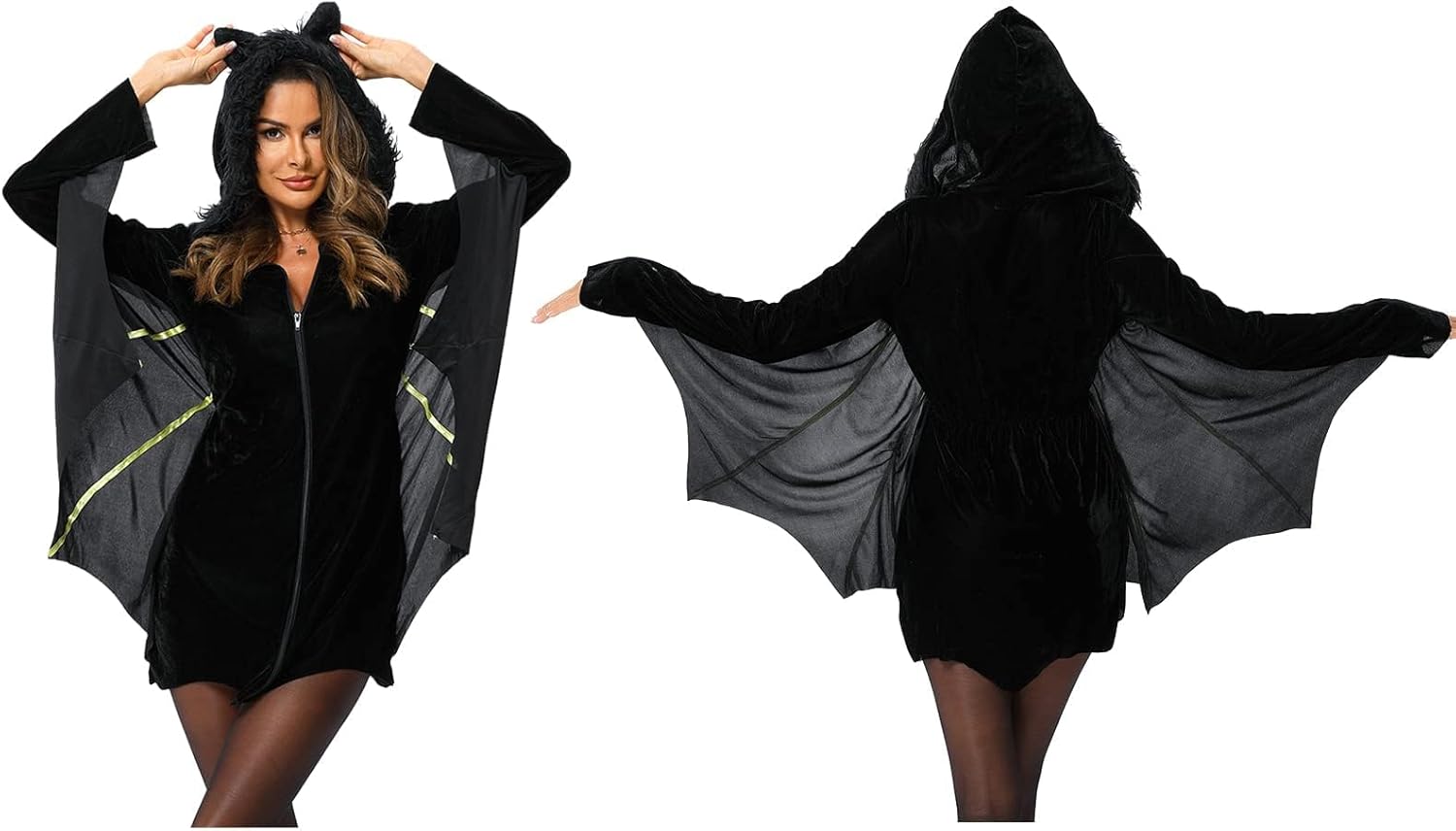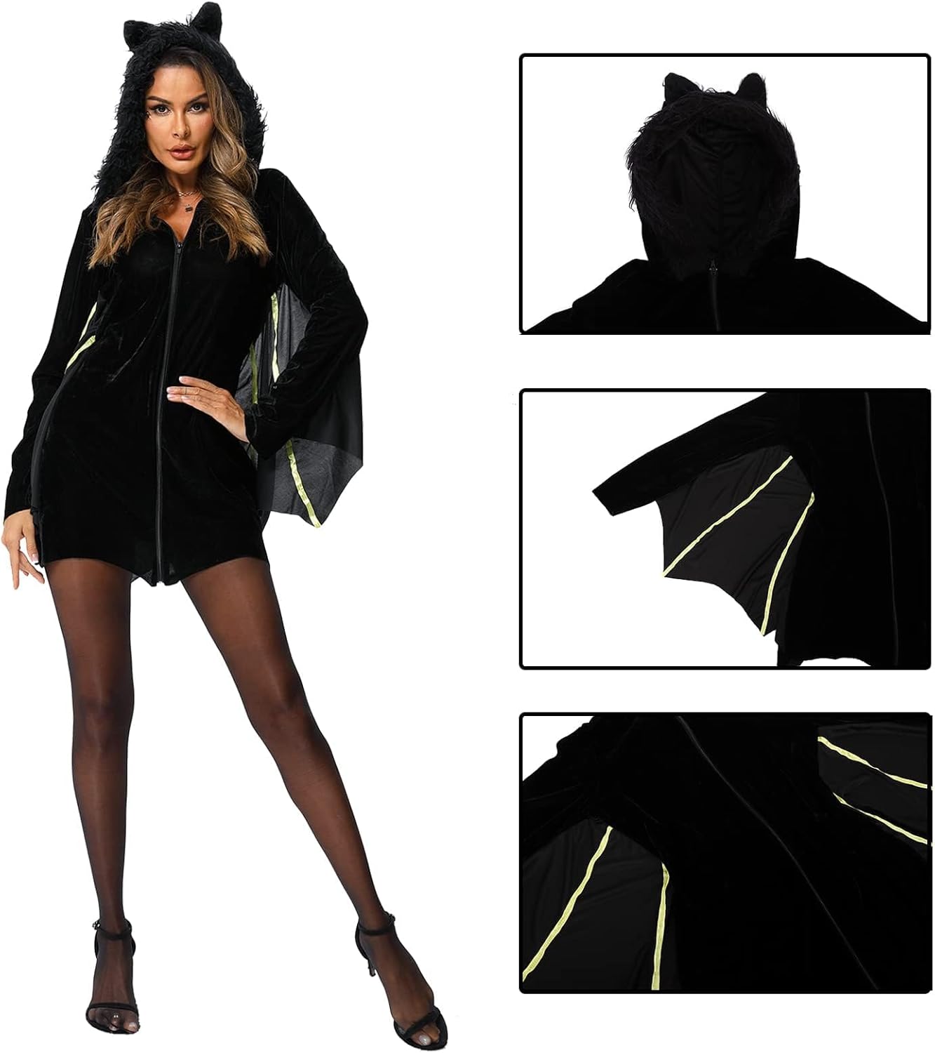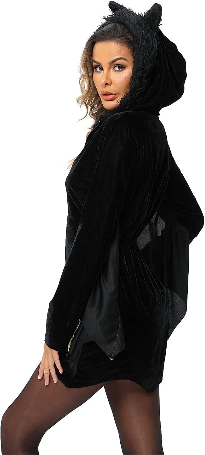 【Vampire Bat Costume】: Womens bat costume includes one hooded dress with attached wings. Black plush and pressed velveteen body jumpsuit hide you in the dark to scare your friends! Giving them a surprise strike must be fun!