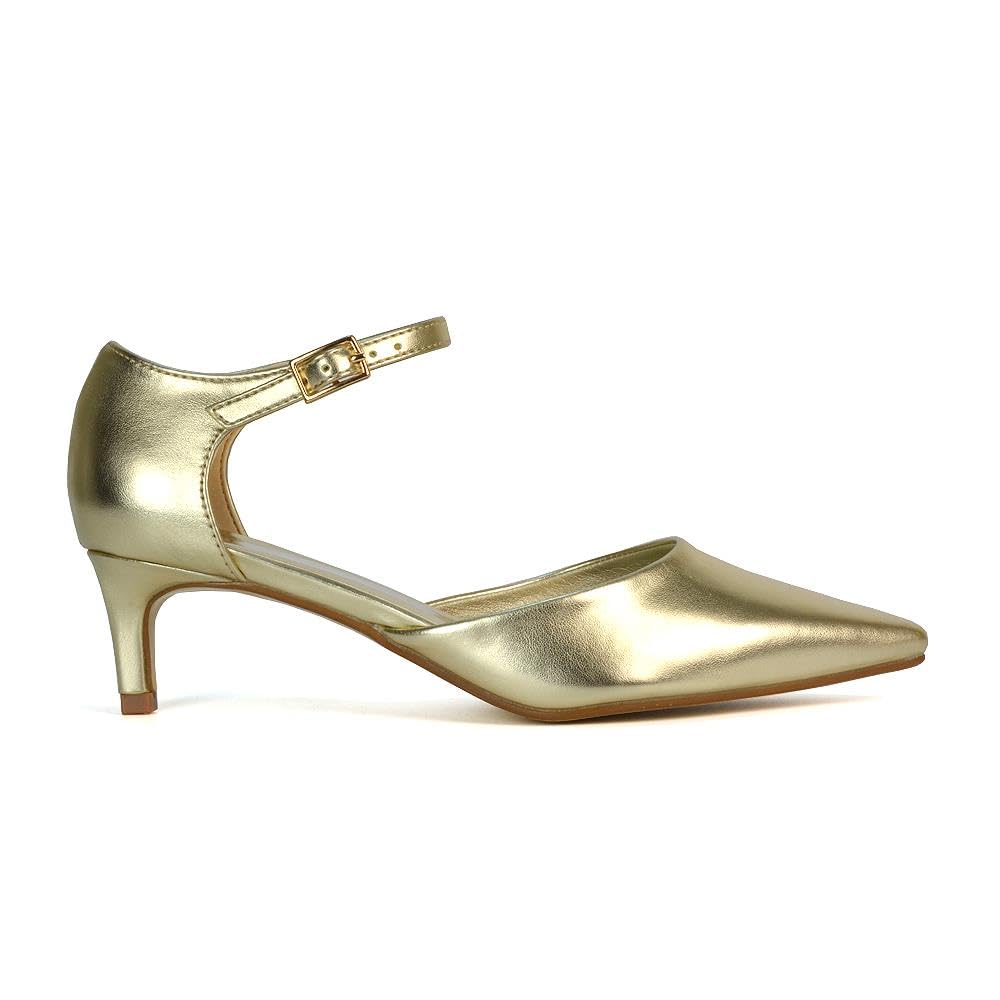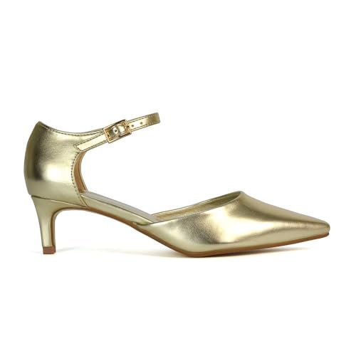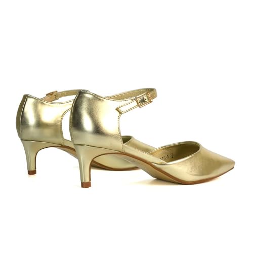 Women's Classic Low Kitten Stiletto Heel Ladies Gold Metallic 2 Piece Ankle Strap Court Shoes