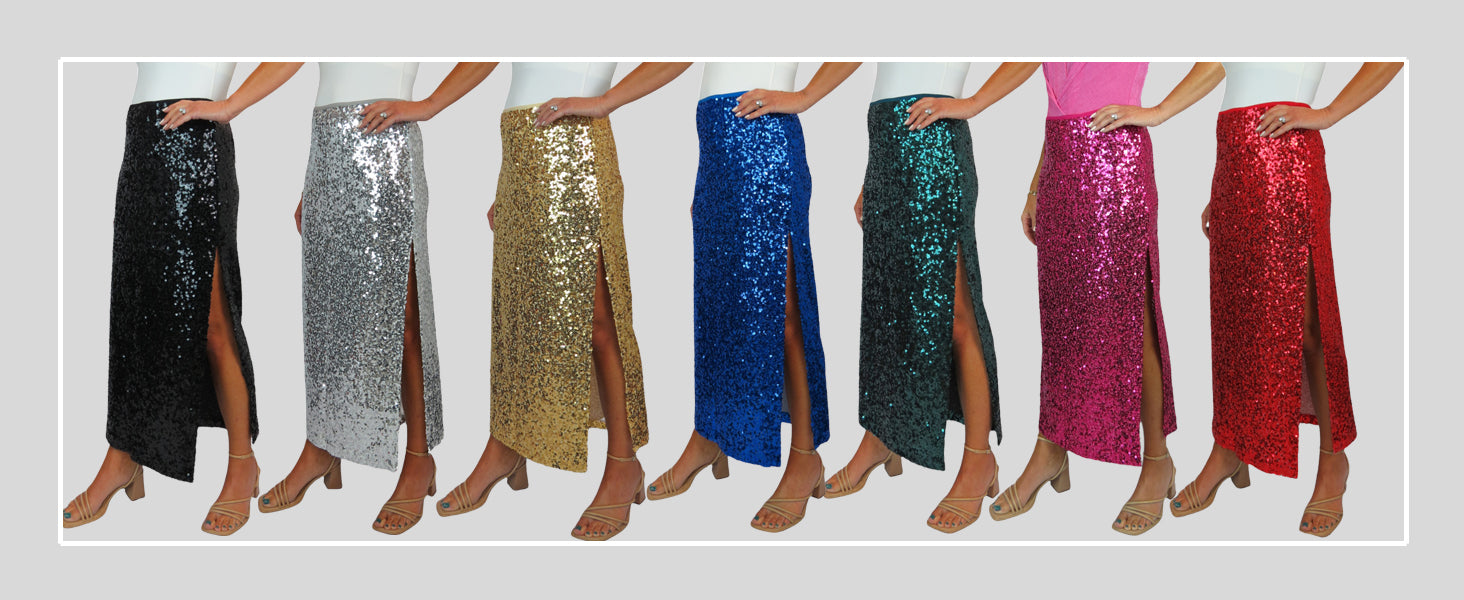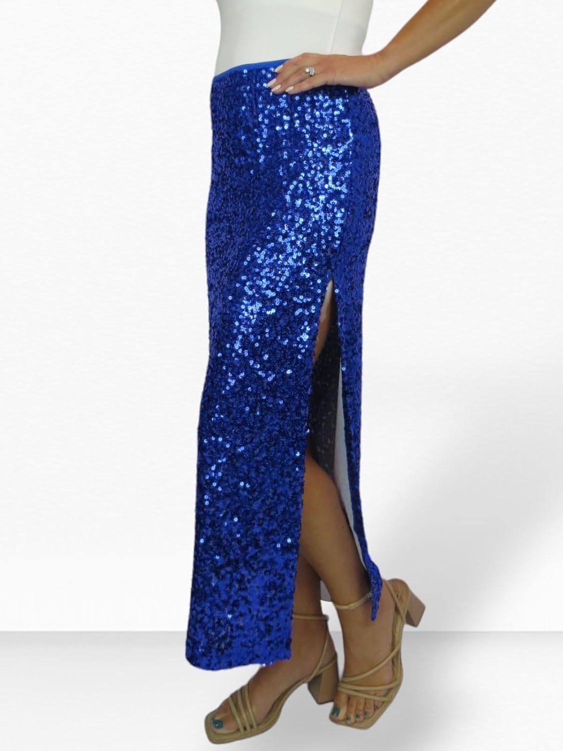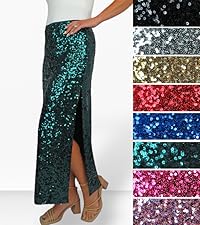 Design: Our Women's elegant maxi-length skirt made from a luxurious stretch all-over sequin fabric, creating a stunning visual impact. The skirt has an open side leg slit starting 12" (30 cm) from the waist, and length is approximately 35.5" (90 cm).