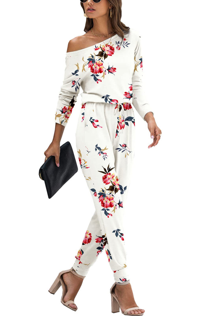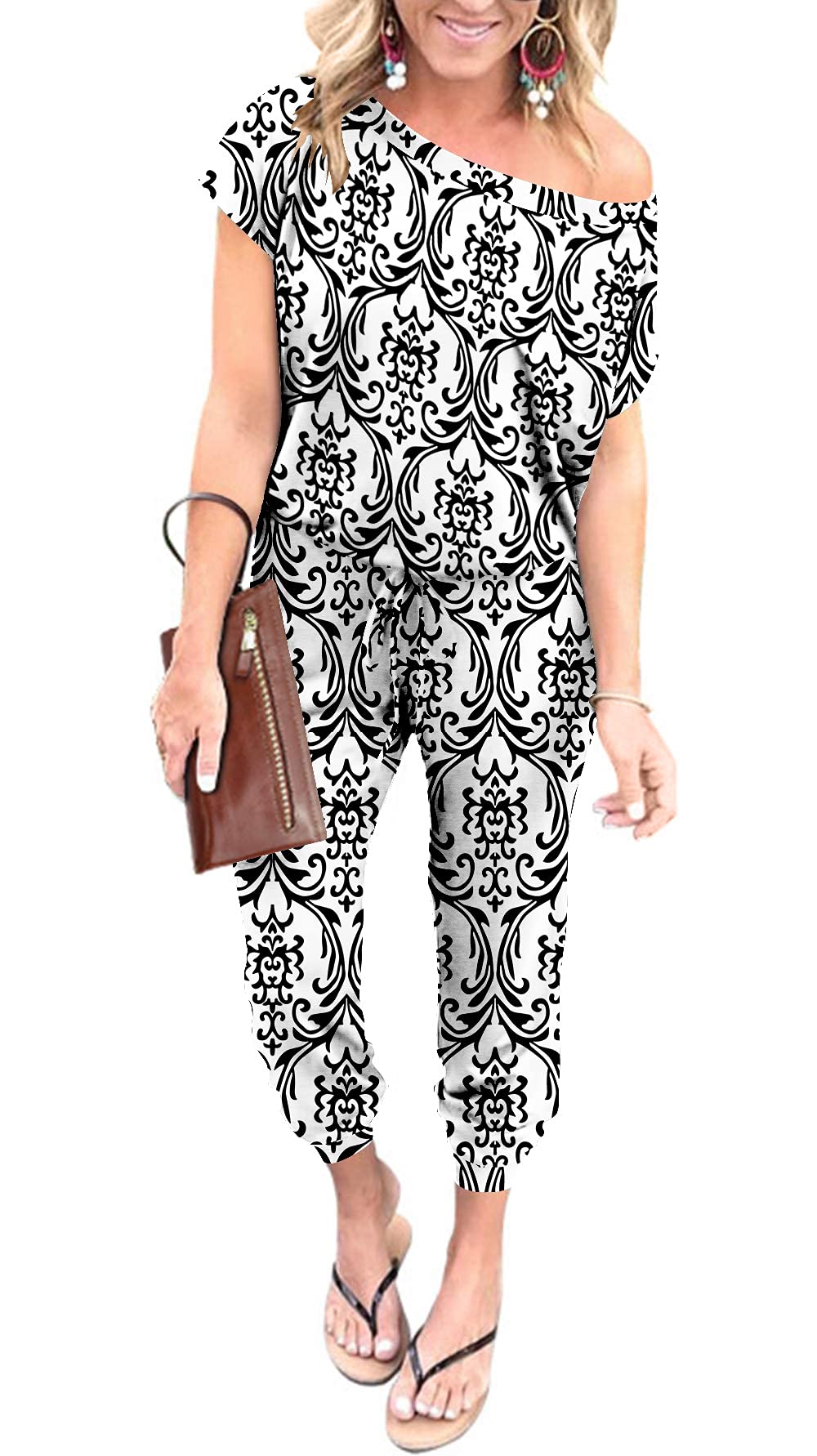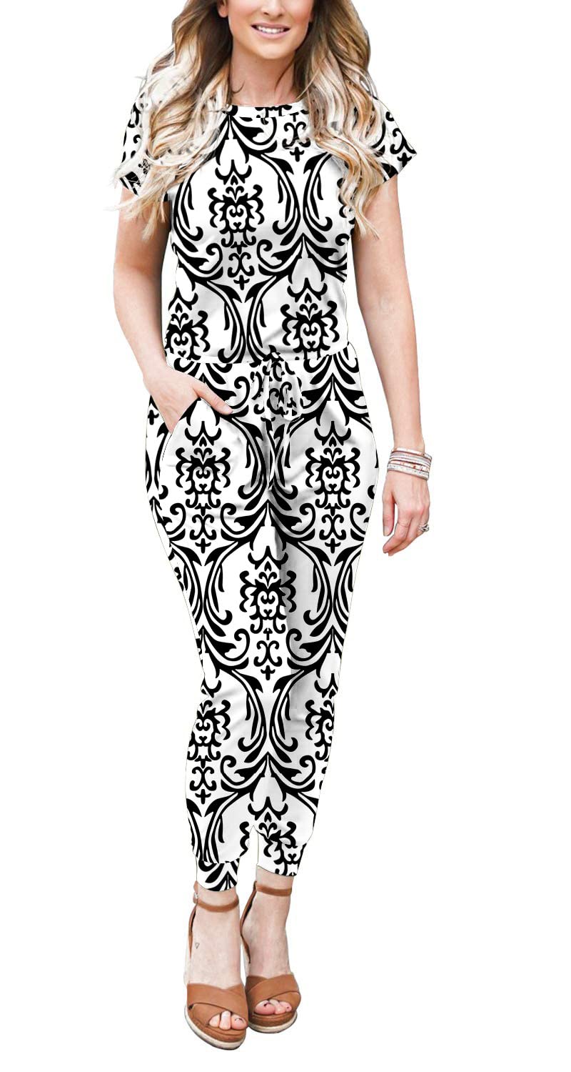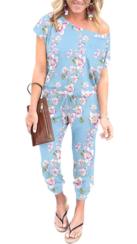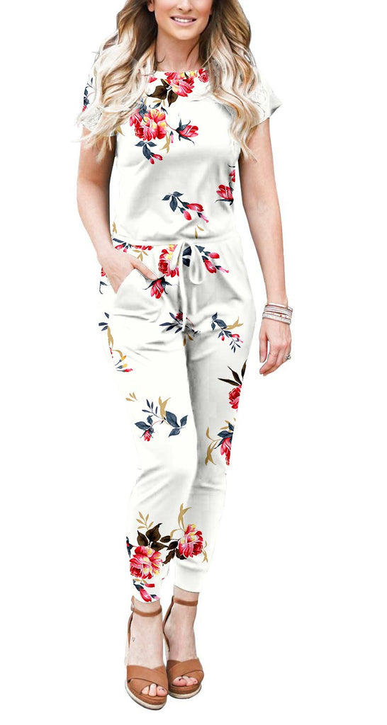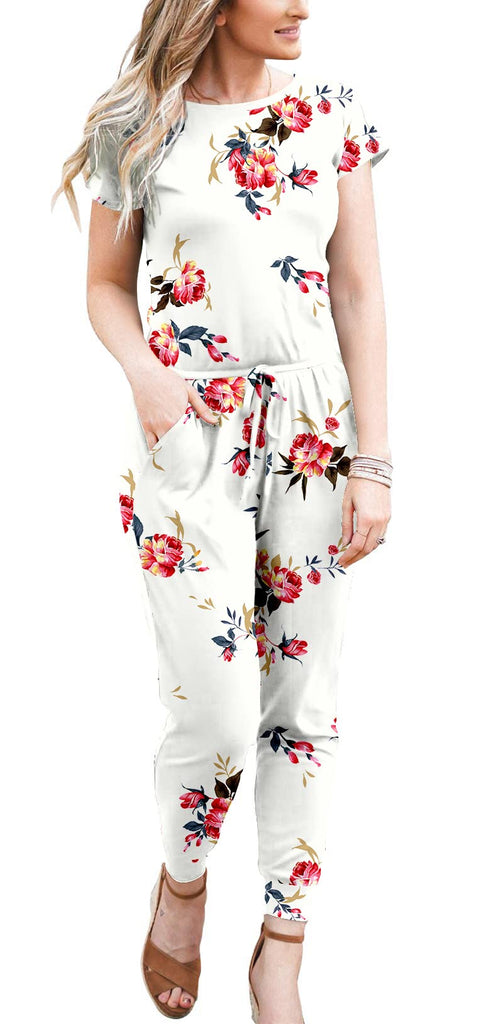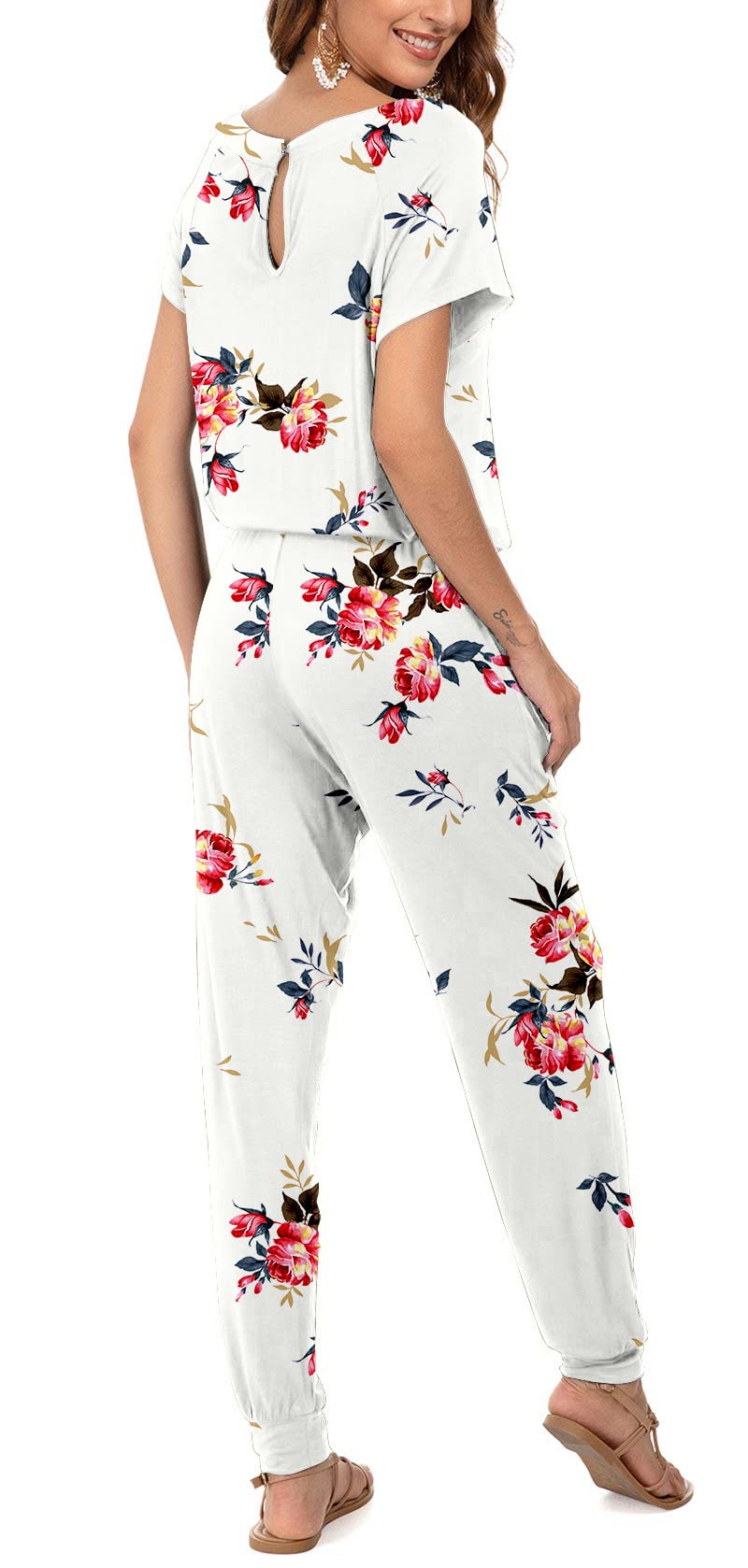 Womens Jumpsuits One Piece Casual Off Shoulder Playsuit Short Sleeve Overalls Elastic Waist Stretchy Romper with Pockets X-Large,Floral White