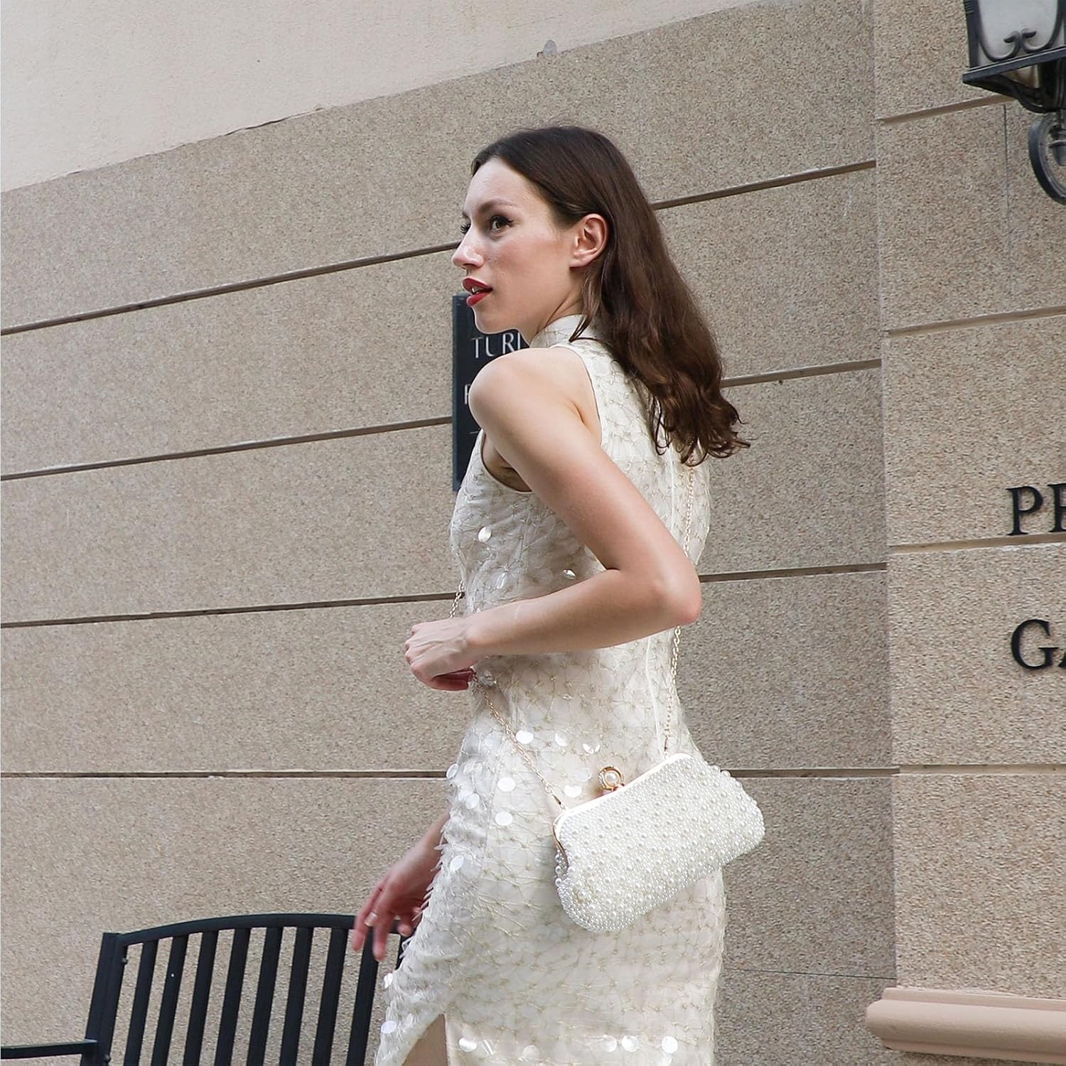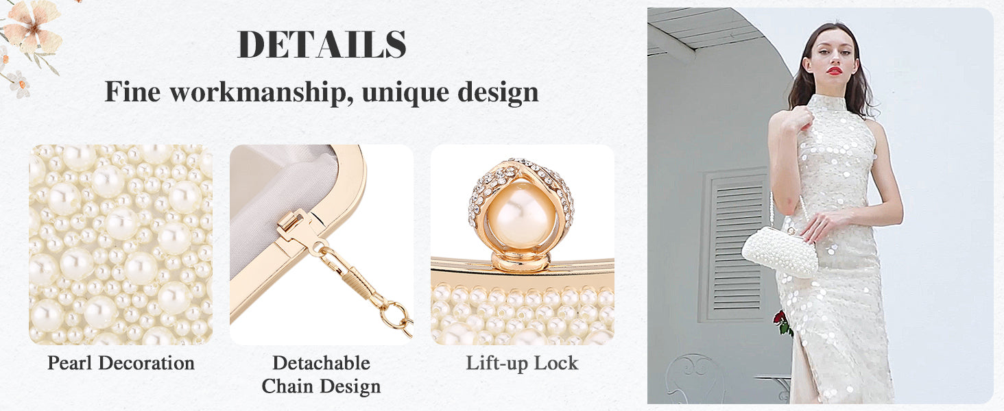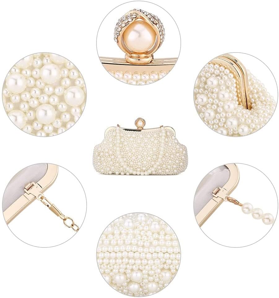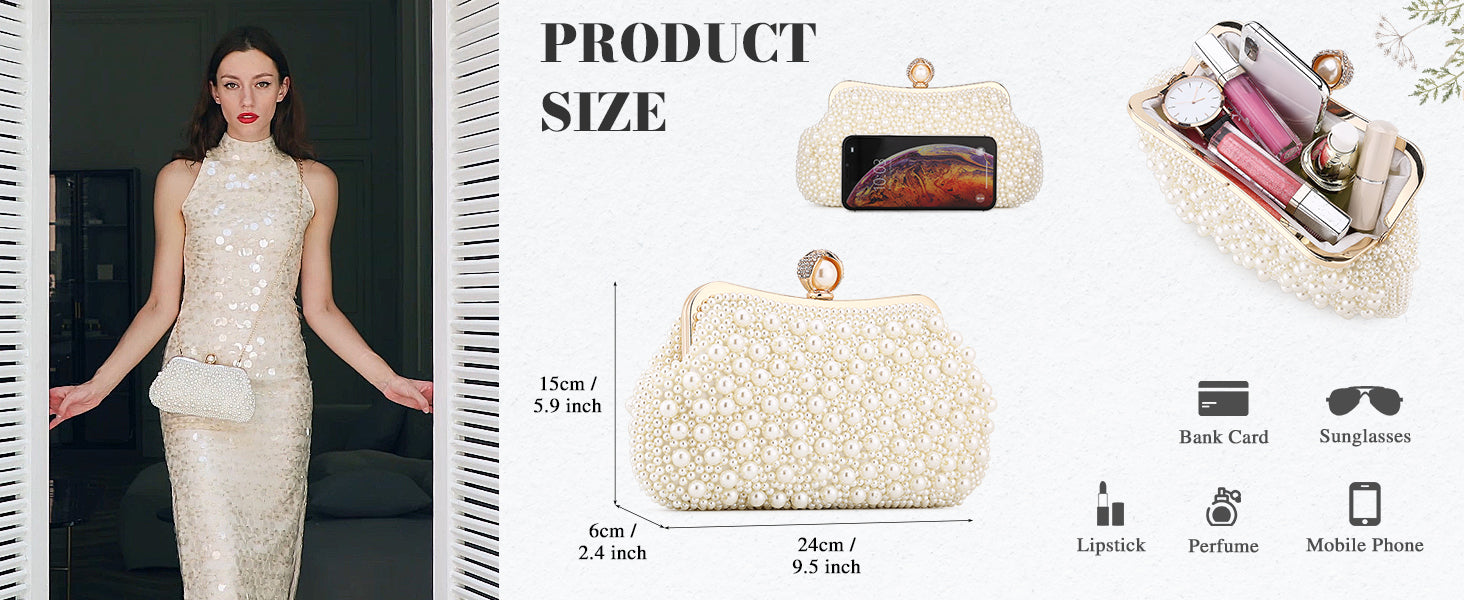Design - With the beautiful pearls and rhinestones on the opening, the evening bag becomes elegant and glamorous. The metallic part combined with decent craftsmanship. The fine craft makes the clutch look graceful and elegant.