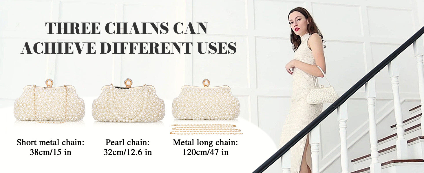 Multifunctional shoulder strap - This pearl evening bag is available with 3 shoulder straps - a short strap made of pearls, a short metallic shoulder strap and a long metallic shoulder strap - which are of different lengths and are suitable for different methods of wearing.
