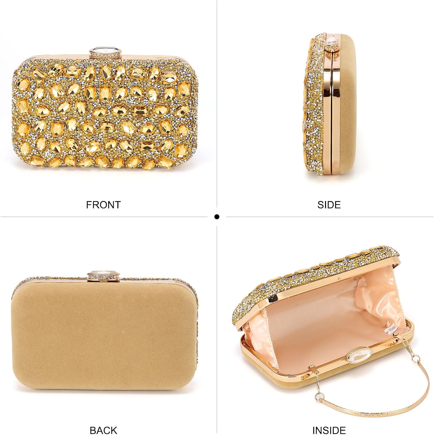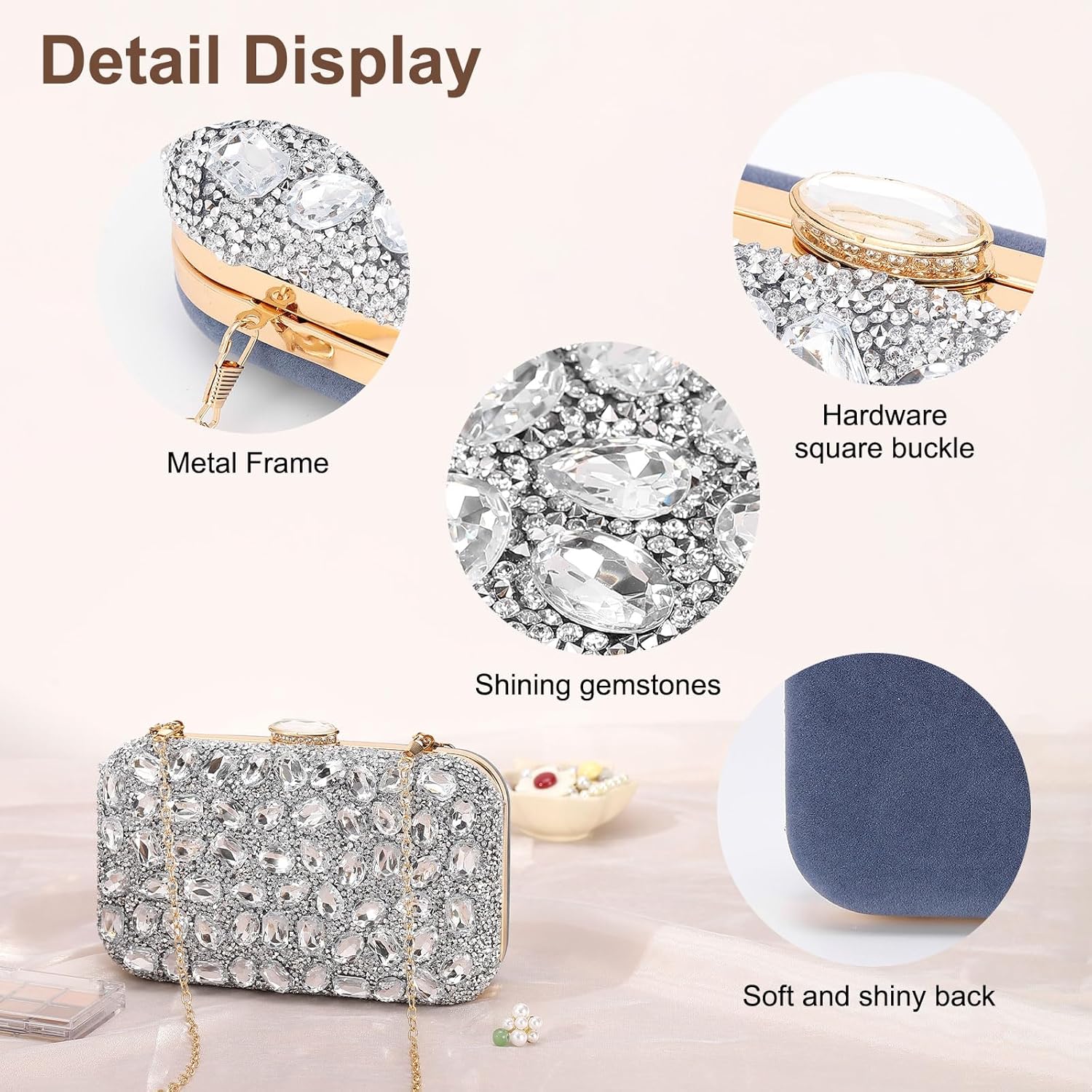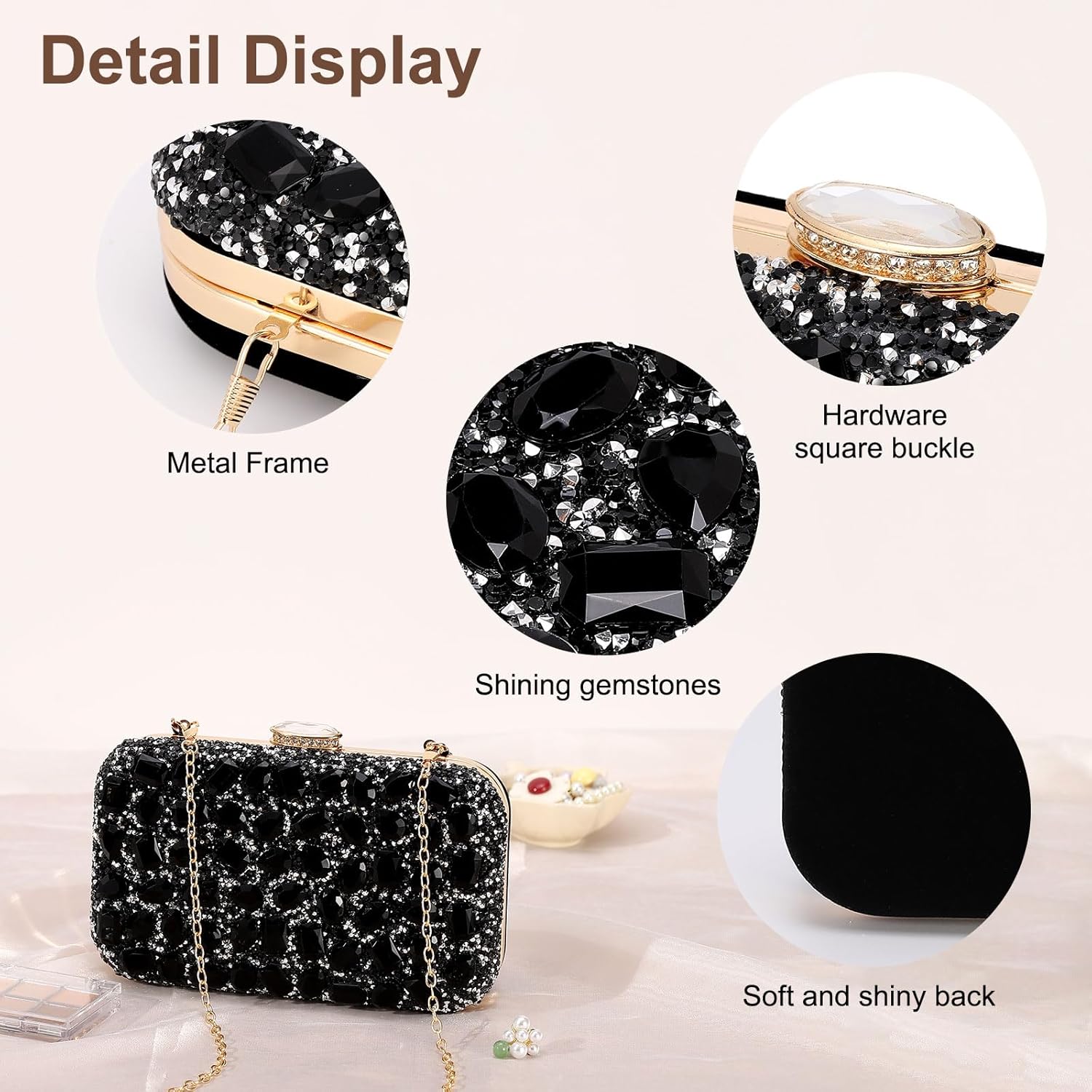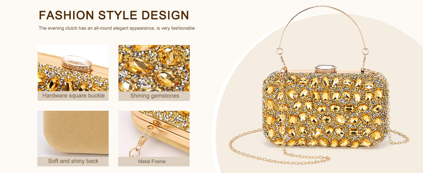 [Appearance Design]: The front of our clutch is inlaid with thousands of crystal rhinestones and sparkling gemstone. The back of the evening bag is made of soft solid color polyester. Mixed with solid color sparkly.