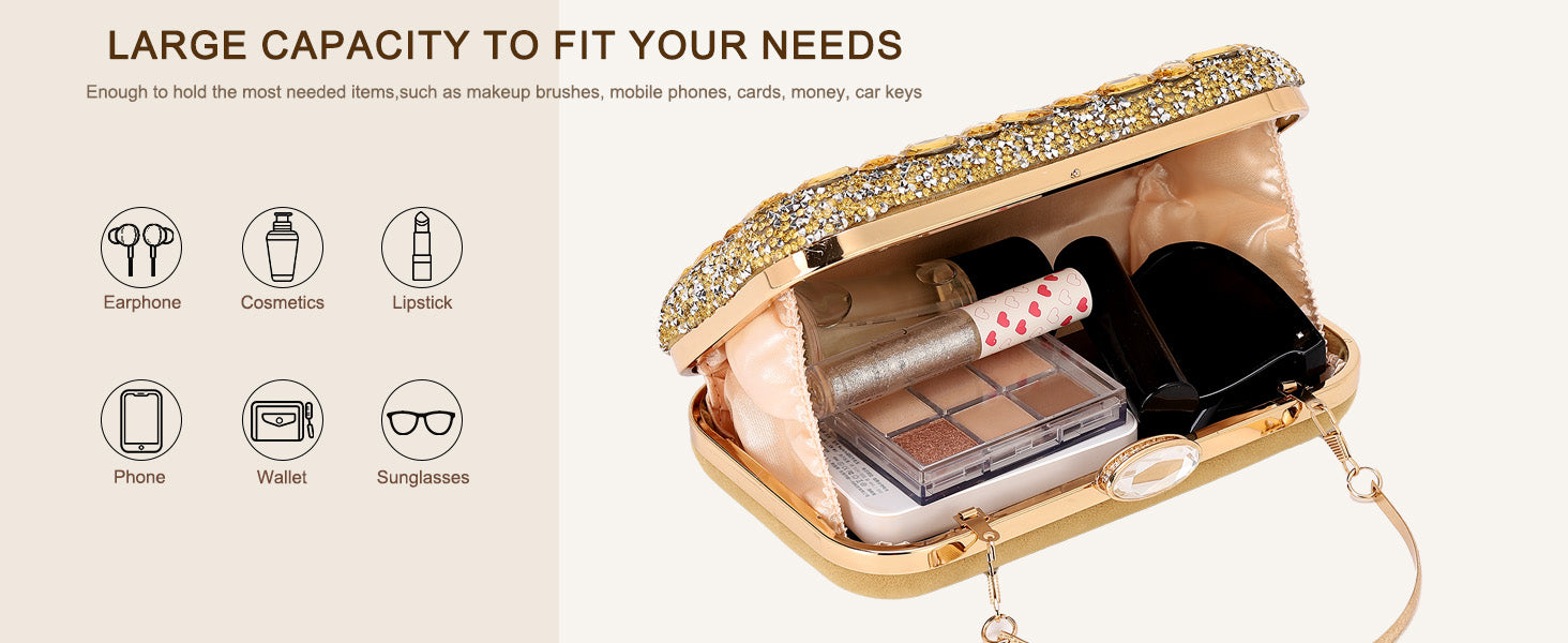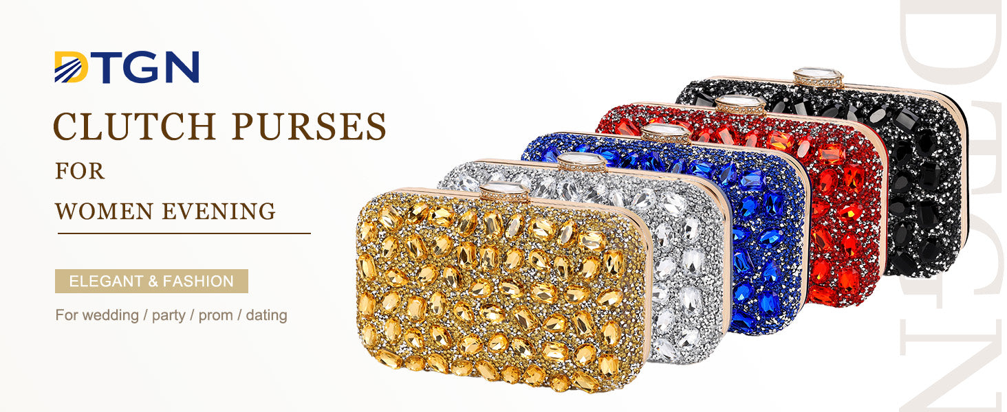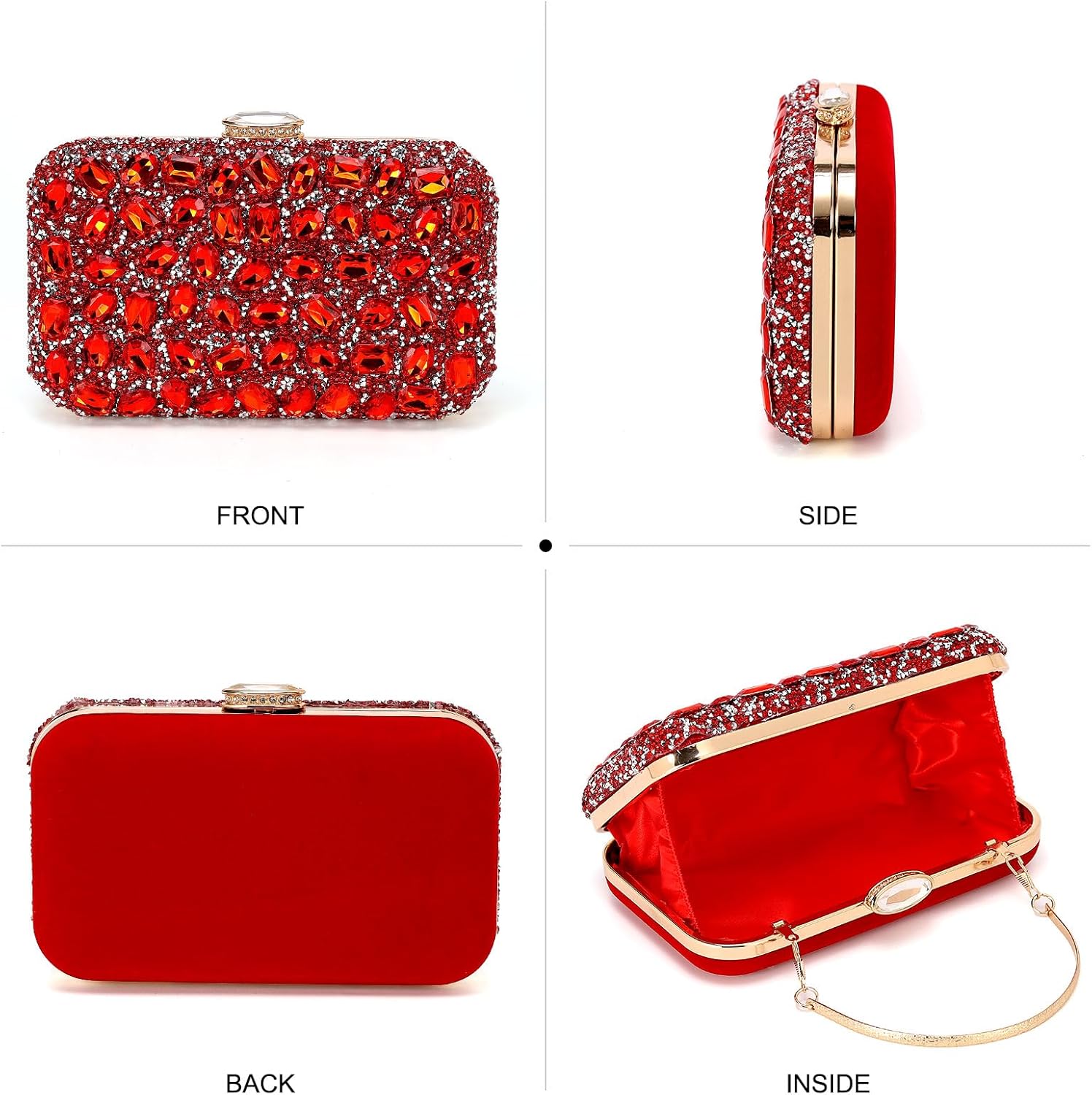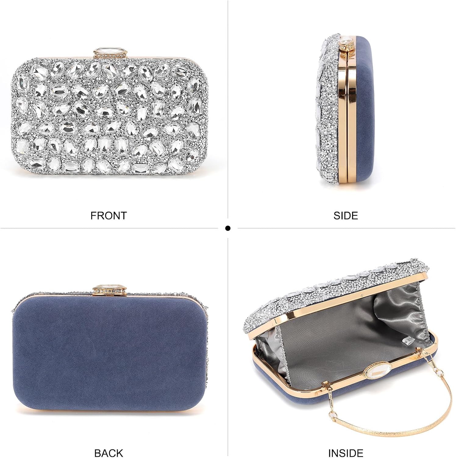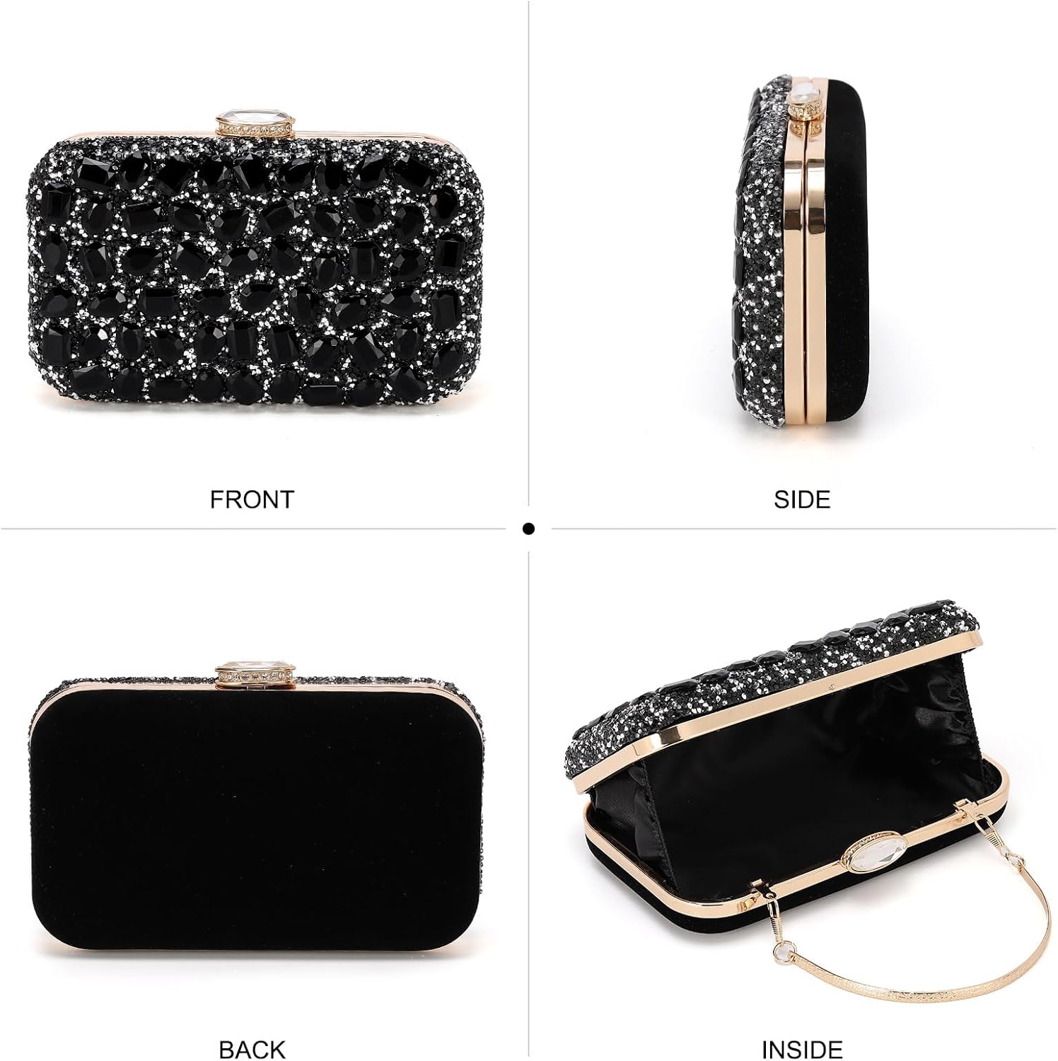 [Appearance Design]: The front of our clutch is inlaid with thousands of crystal rhinestones and sparkling gemstone. The back of the evening bag is made of soft solid color polyester. Mixed with solid color sparkly.