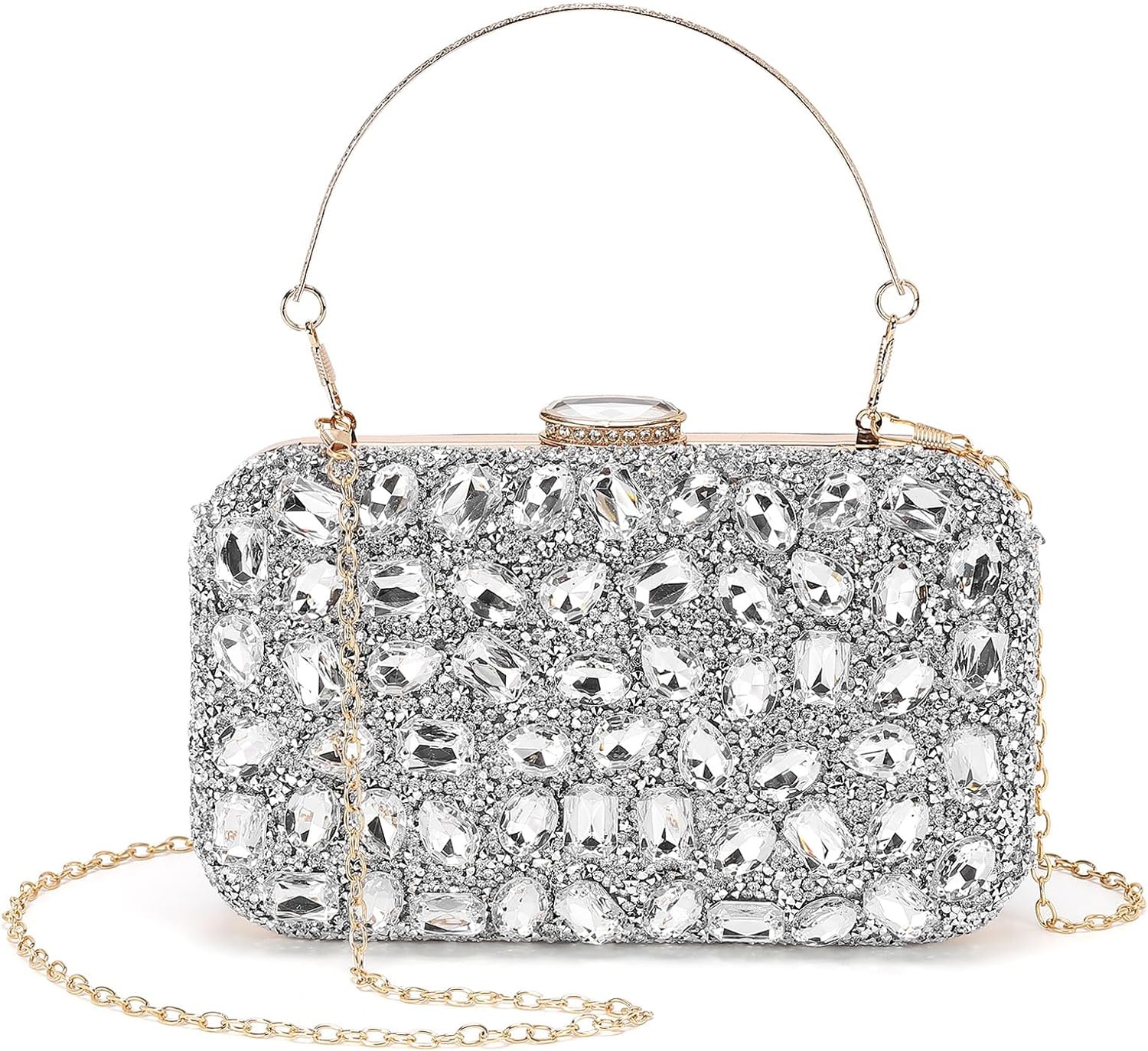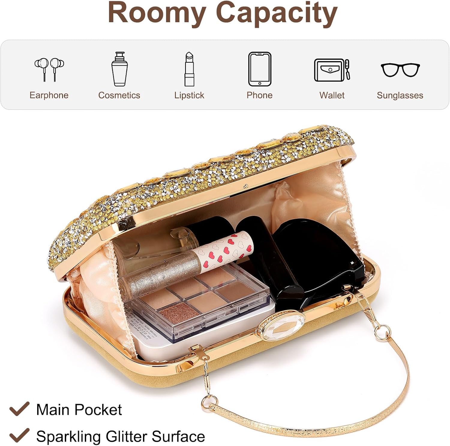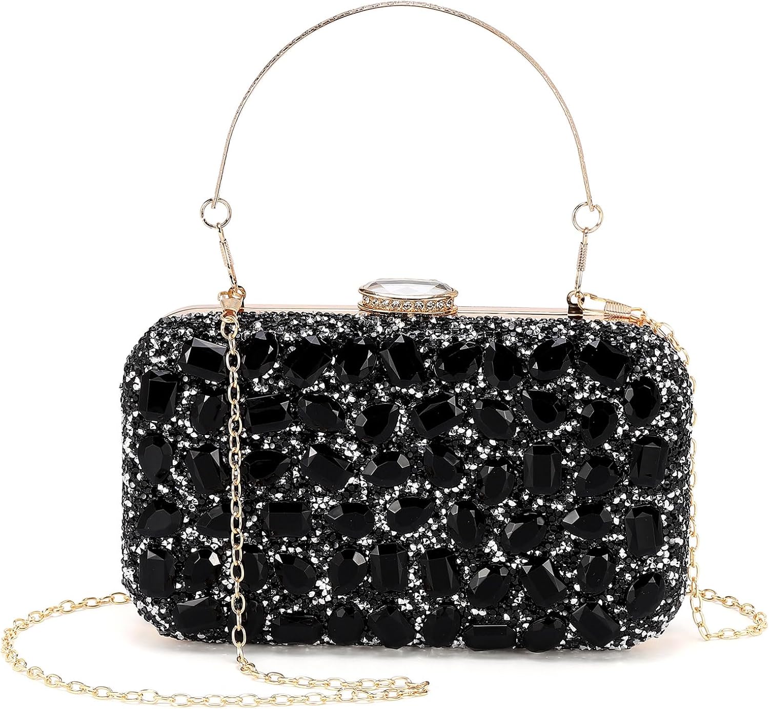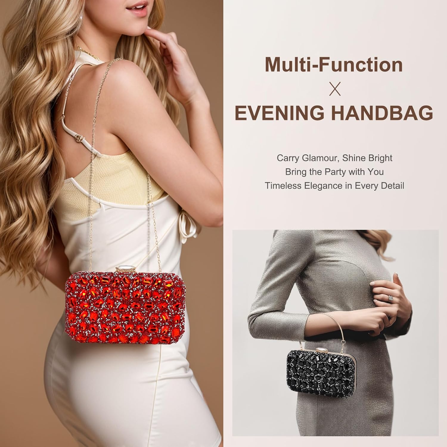 [Appearance Design]: The front of our clutch is inlaid with thousands of crystal rhinestones and sparkling gemstone. The back of the evening bag is made of soft solid color polyester. Mixed with solid color sparkly.