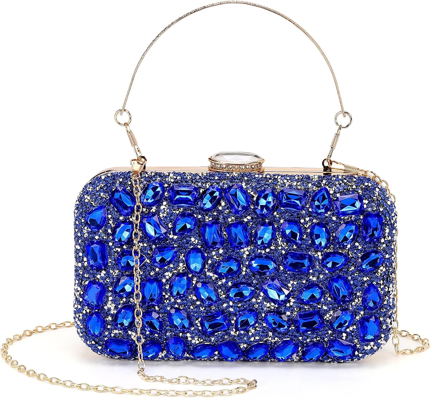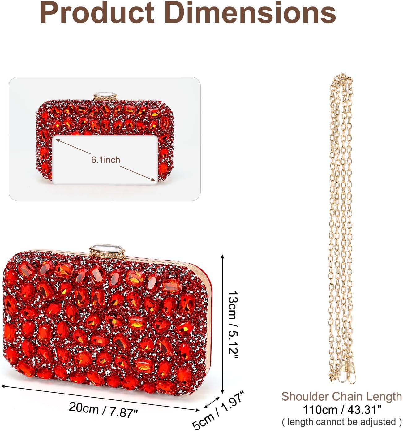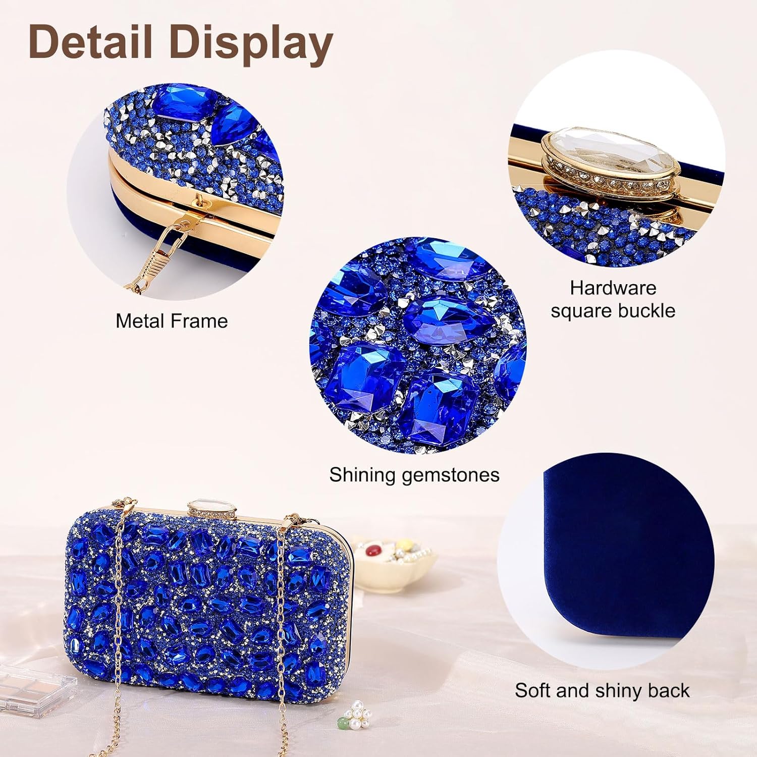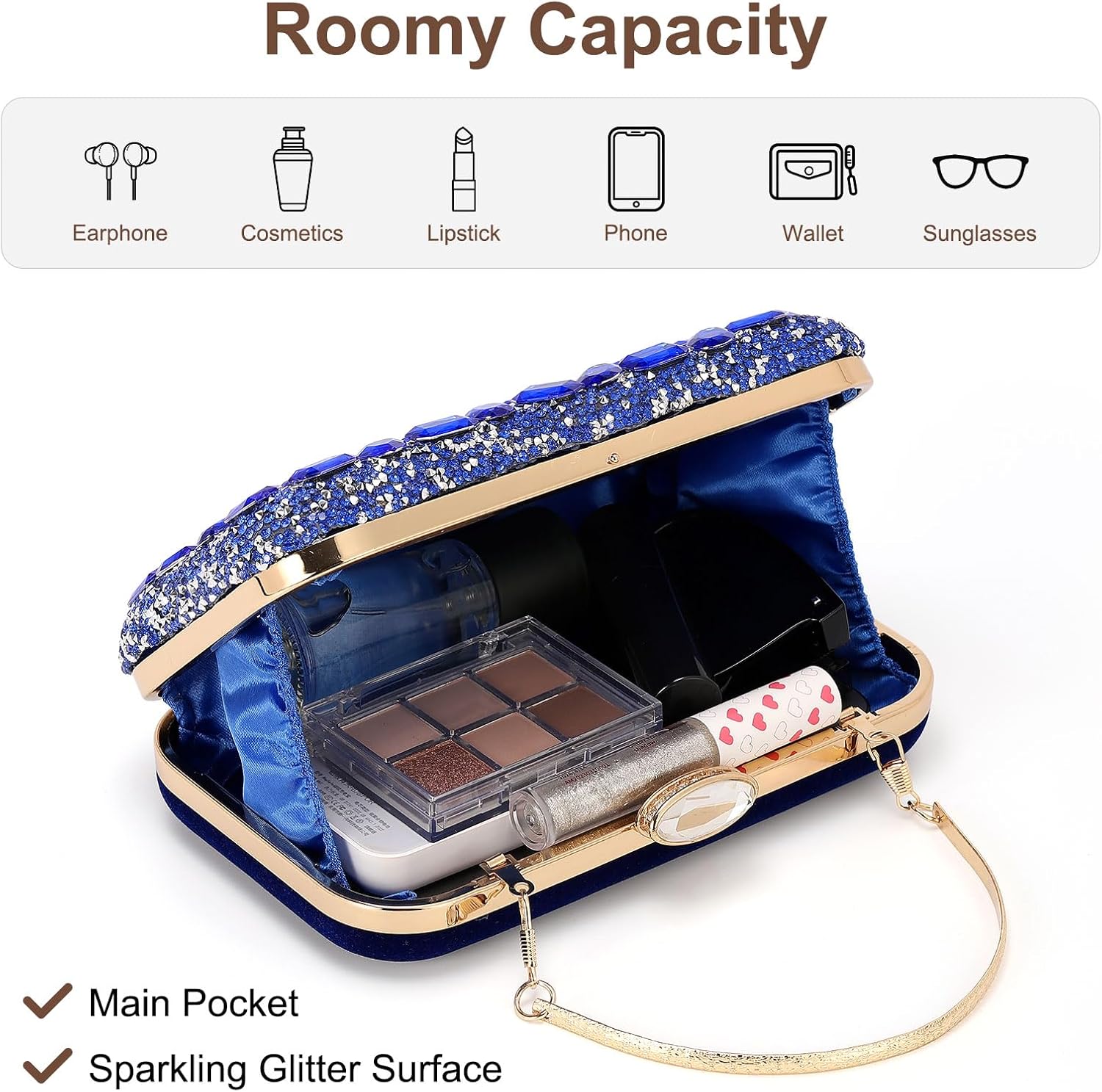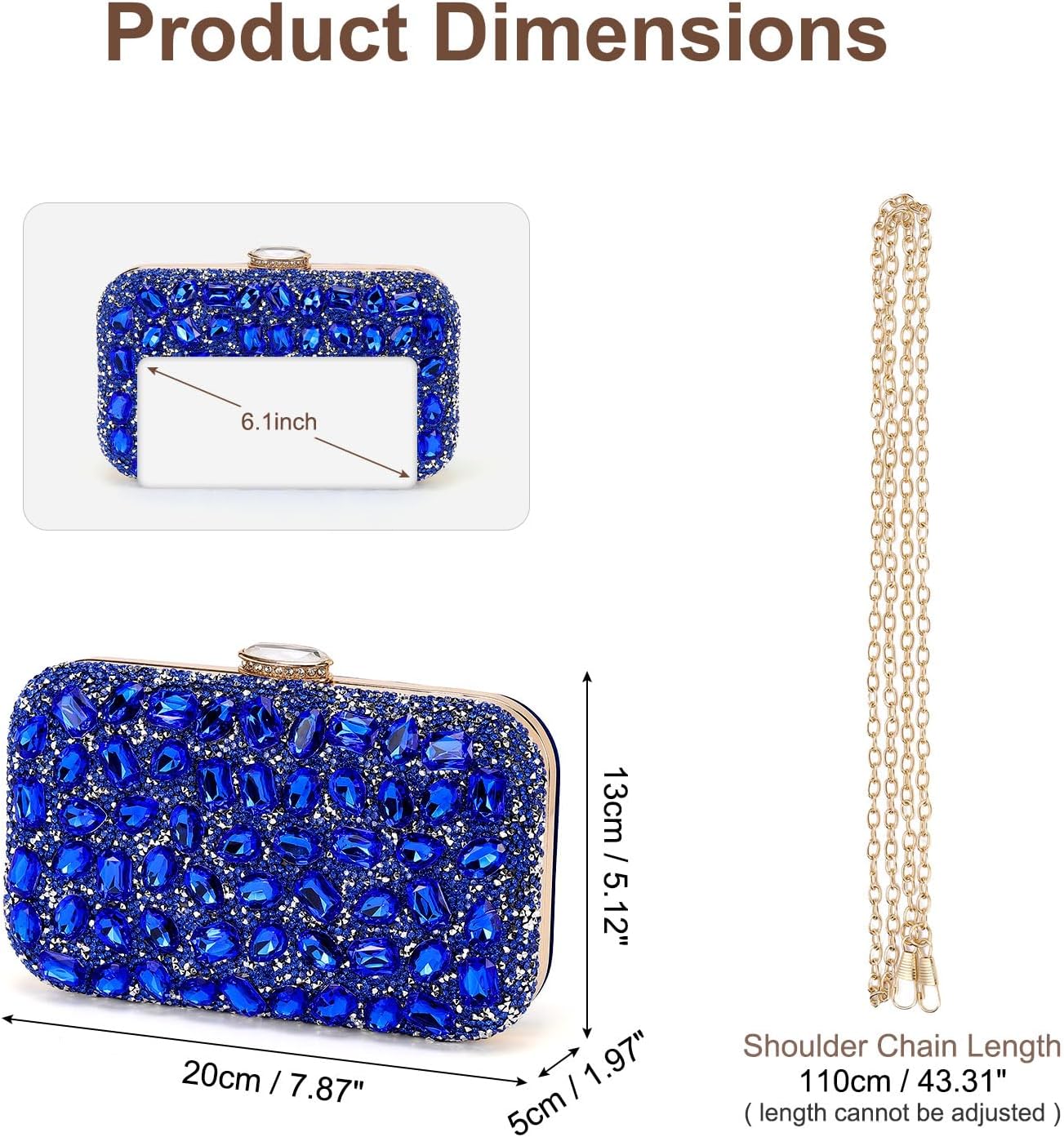 [Capable]: The Clutch Purse Size(LxWxH) is 20 x 5 x 13 cm / 7.87 x 1.97 x 5.12 inches, lightweight at only 0.89 pound. The Clutch purse material crystal rhinestone, Its color is Blue, Shoulder strap length is 110 cm / 43.31 inch. The evening bag is enough to hold the most needed items, such as makeup brushes, mobile phones, cards, money, car keys, and small wallets, ensuring you are prepared for any occasion.