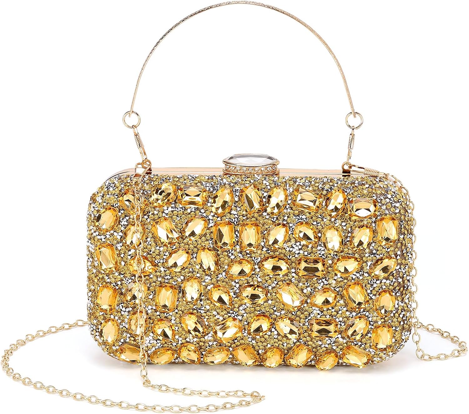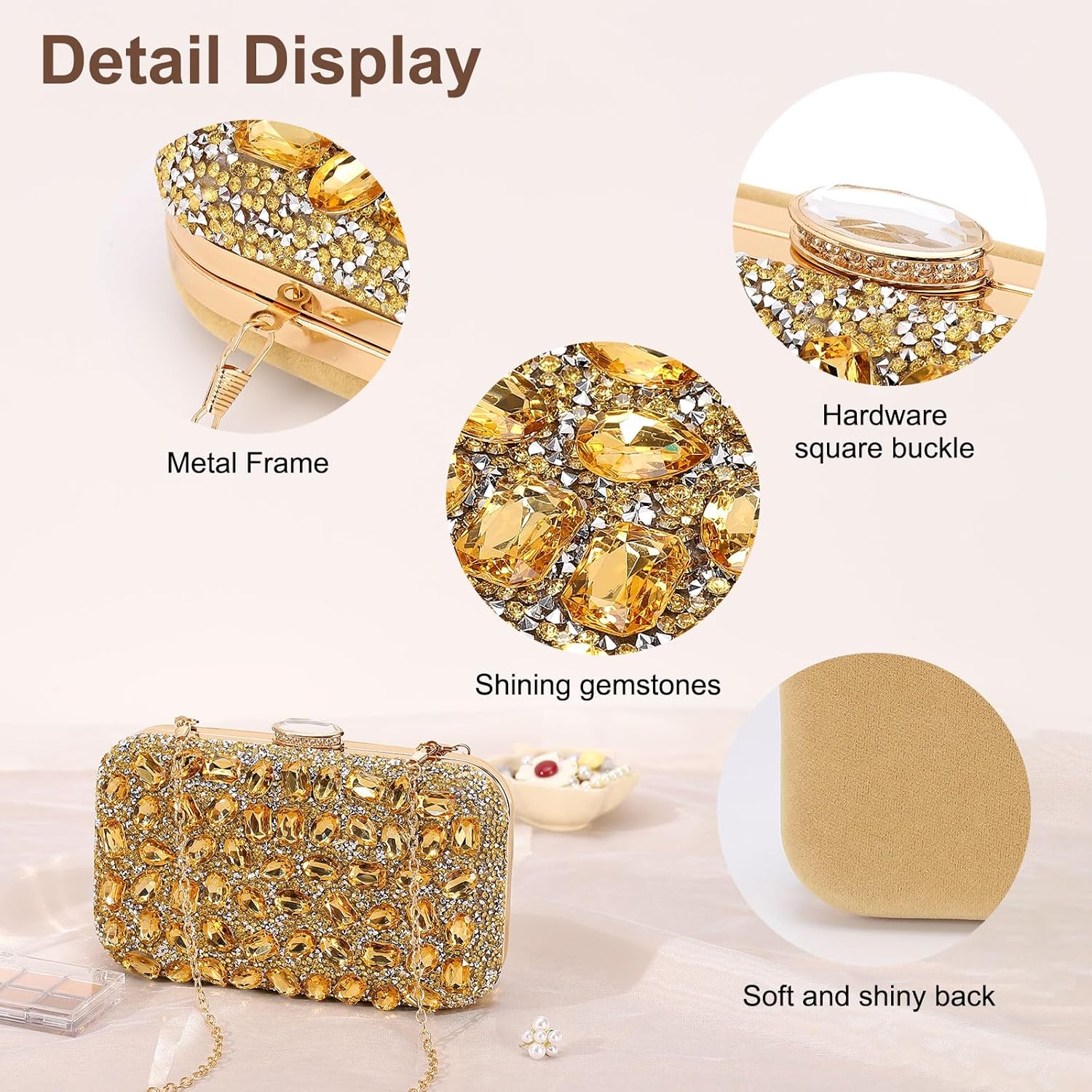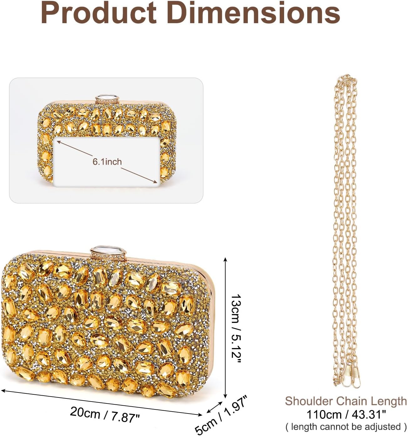 [Chic Design]: This elegant clutch is made of colorful gemstone and sparkling crystals, with a gold metal frame and a snap button design on the top, exudes a charming and elegant atmosphere. We upgraded the reinforcement process to ensure that the crystals and gemstone inlaid on the surface of the clutch will not fall off