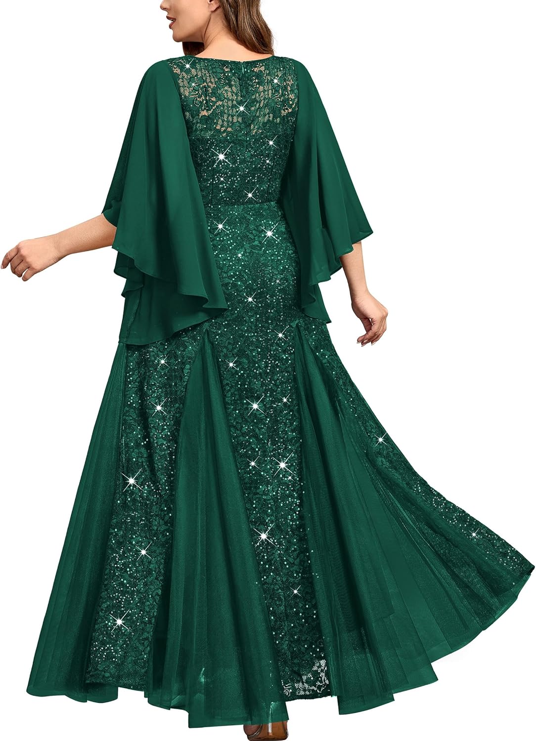 Plus Size Elegant Butterfly Sleeve Chiffon Floral Sequin Lace Contrast Mesh Mermaid Hem Evening Party Long Dress