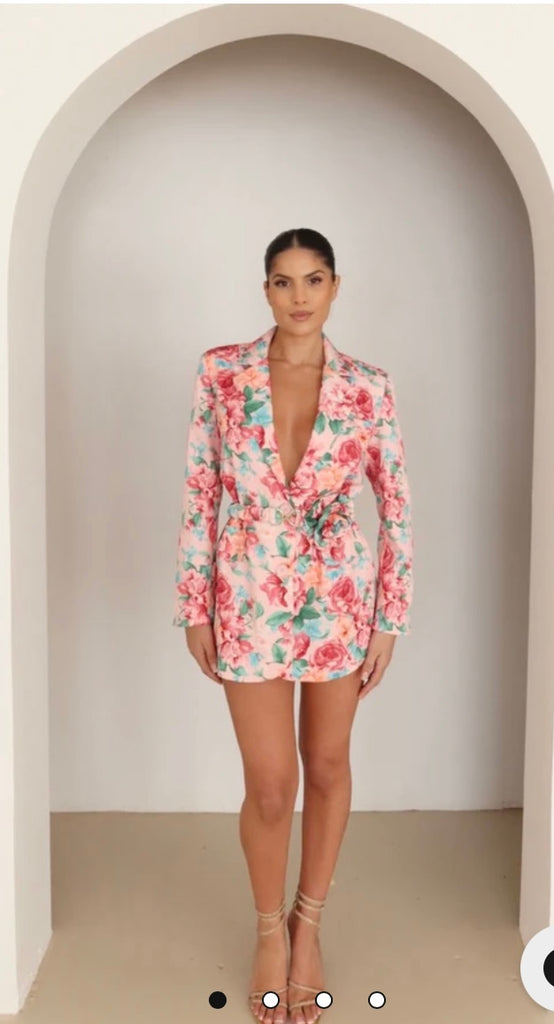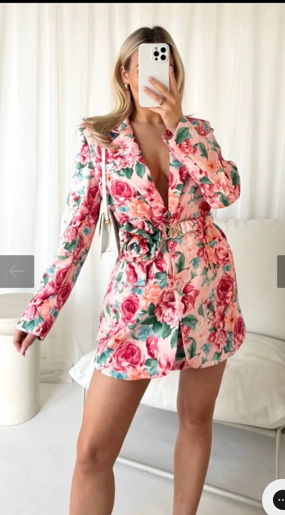 Pink floral rose belted blazer dress