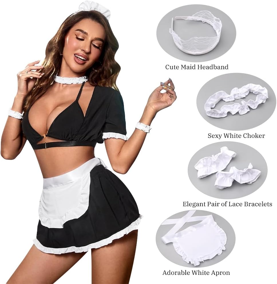 ๐๐ PACKAGE CONTENT: 1*Halter bra, 1*Crop Top, 1*Headband, 1*Neckband, 1*Apron, 1*Mini Dress, 1*G-String, 2*Bracelets. If you have any questions, please donโt hesitate to contact us. We will do our best to solve your problems.