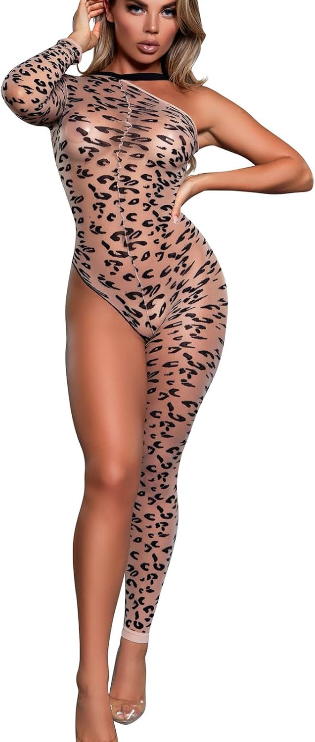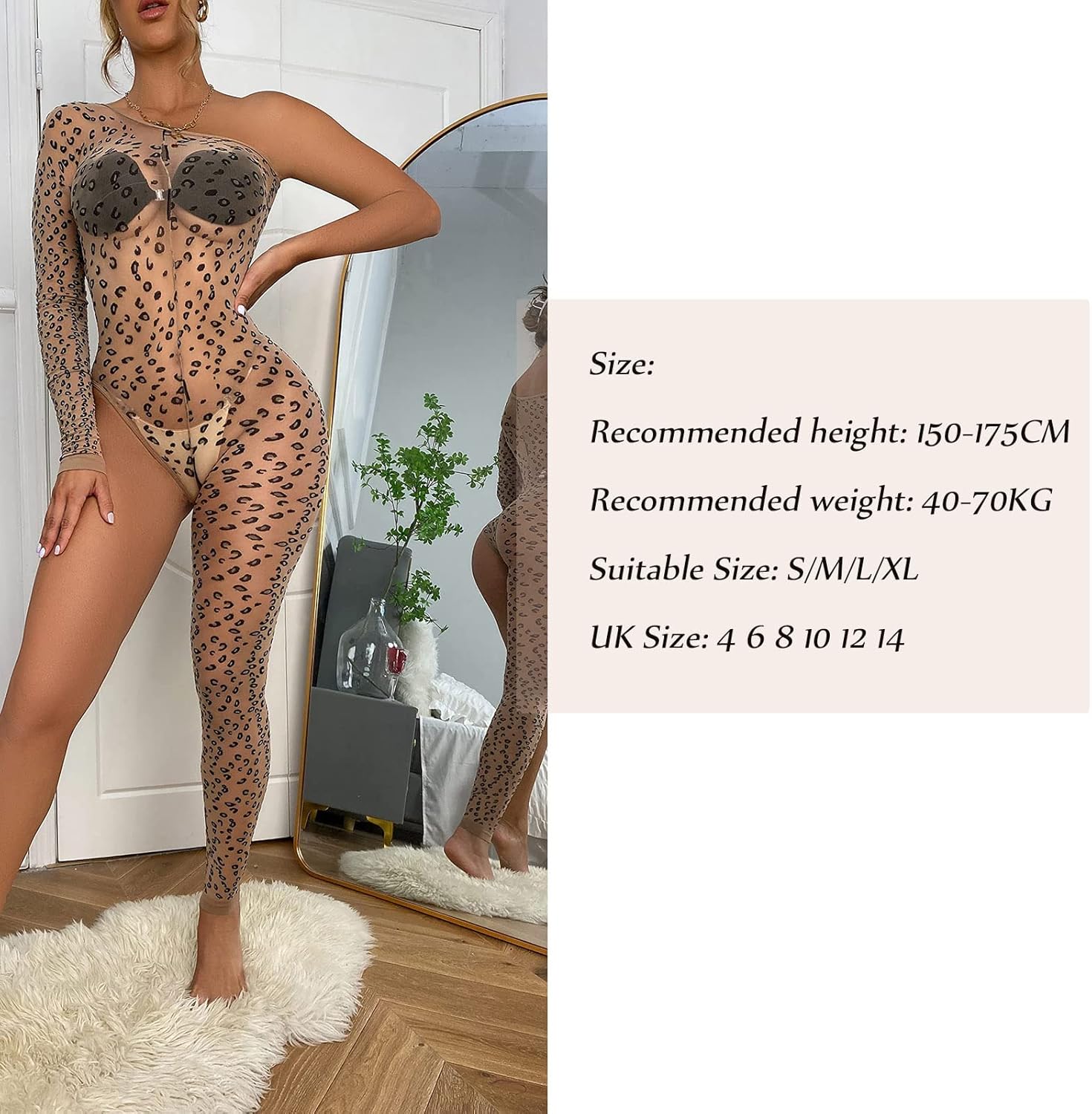 Leopard Bodystockings See-Through Teddy Bodysuit One Piece Jumpsuit Single Long Sleeve Leg Stretch Babydoll Bodycon Leotard Fishnet Nightwear Tights for Party Clubwear