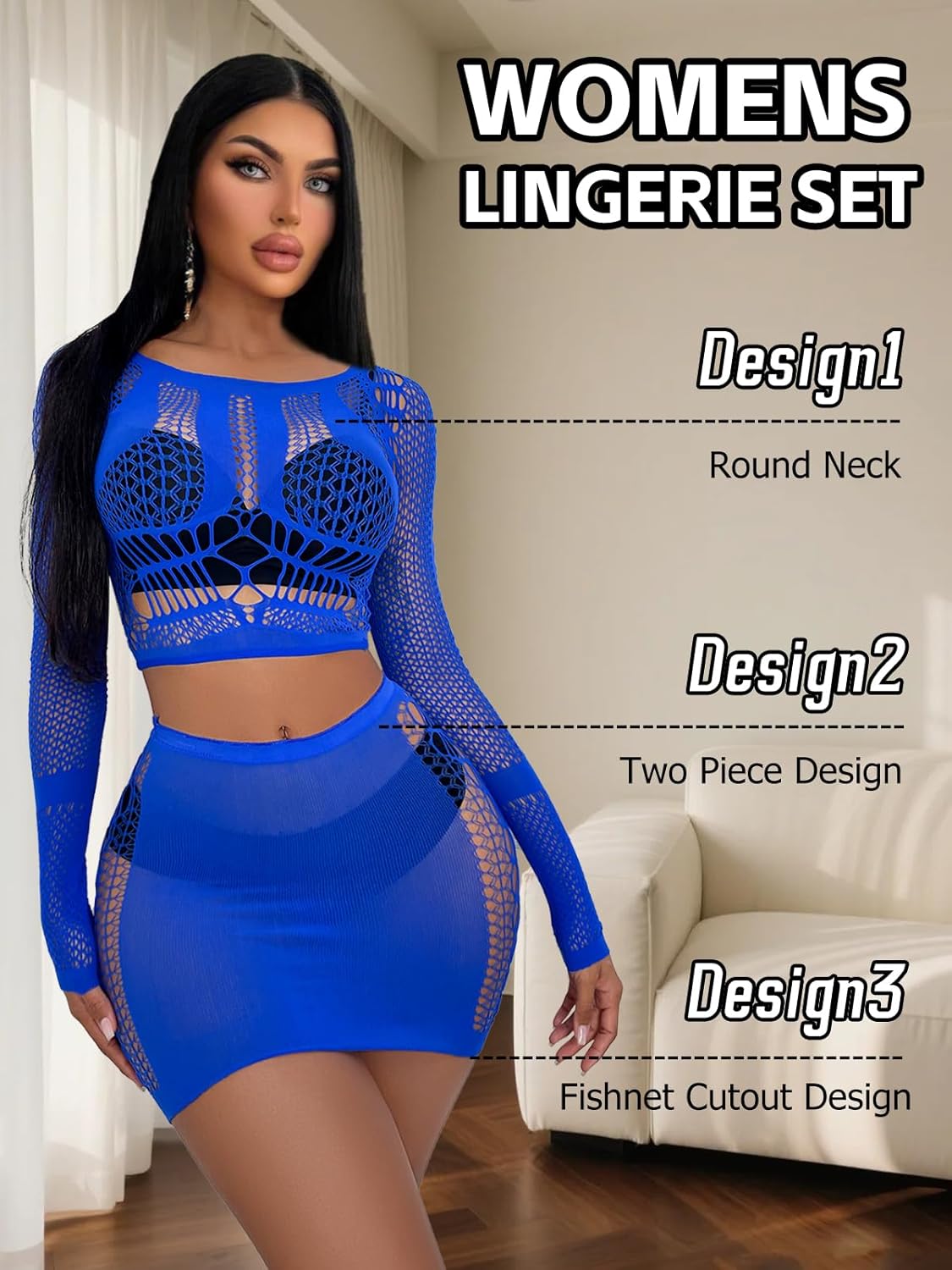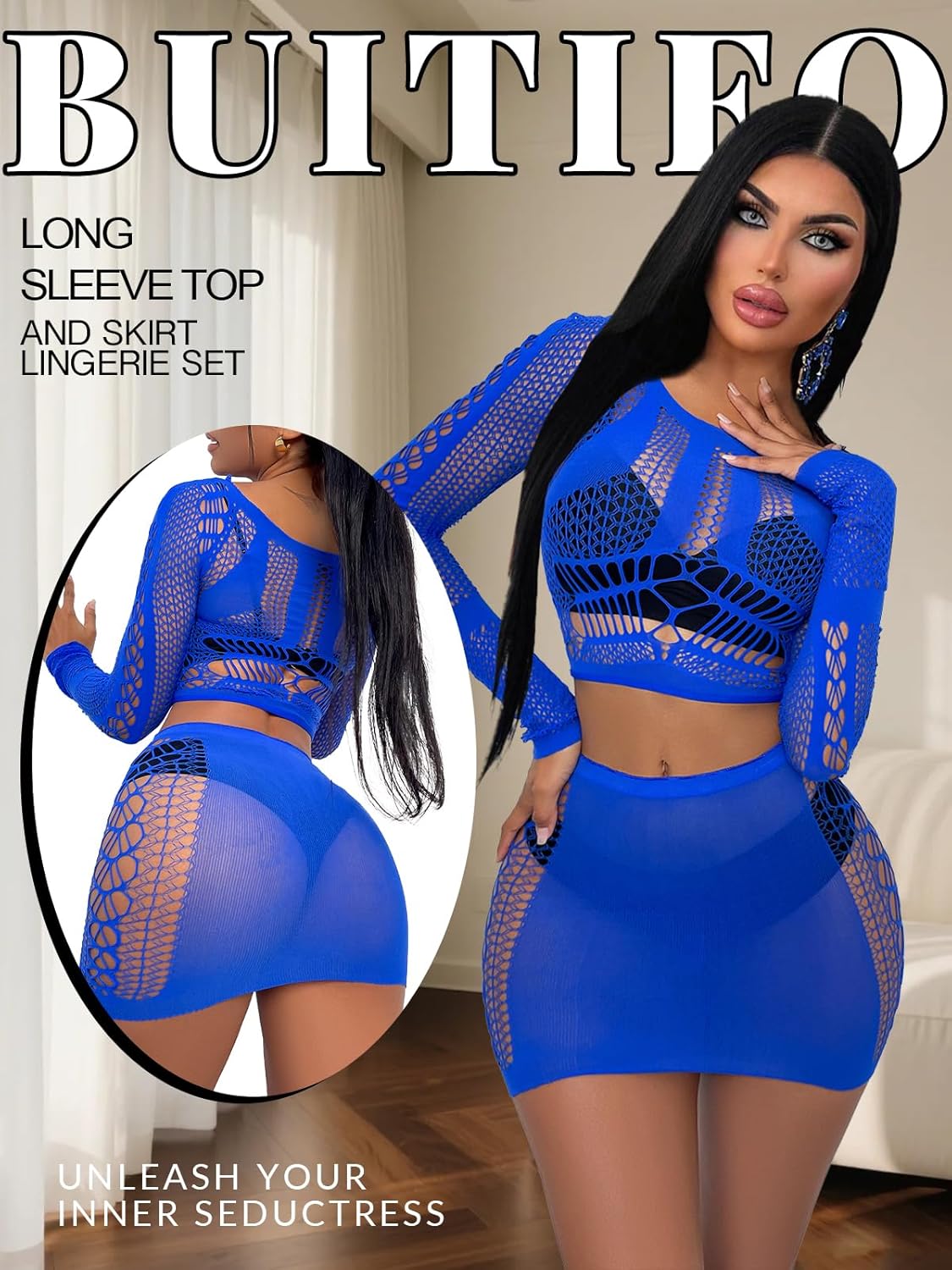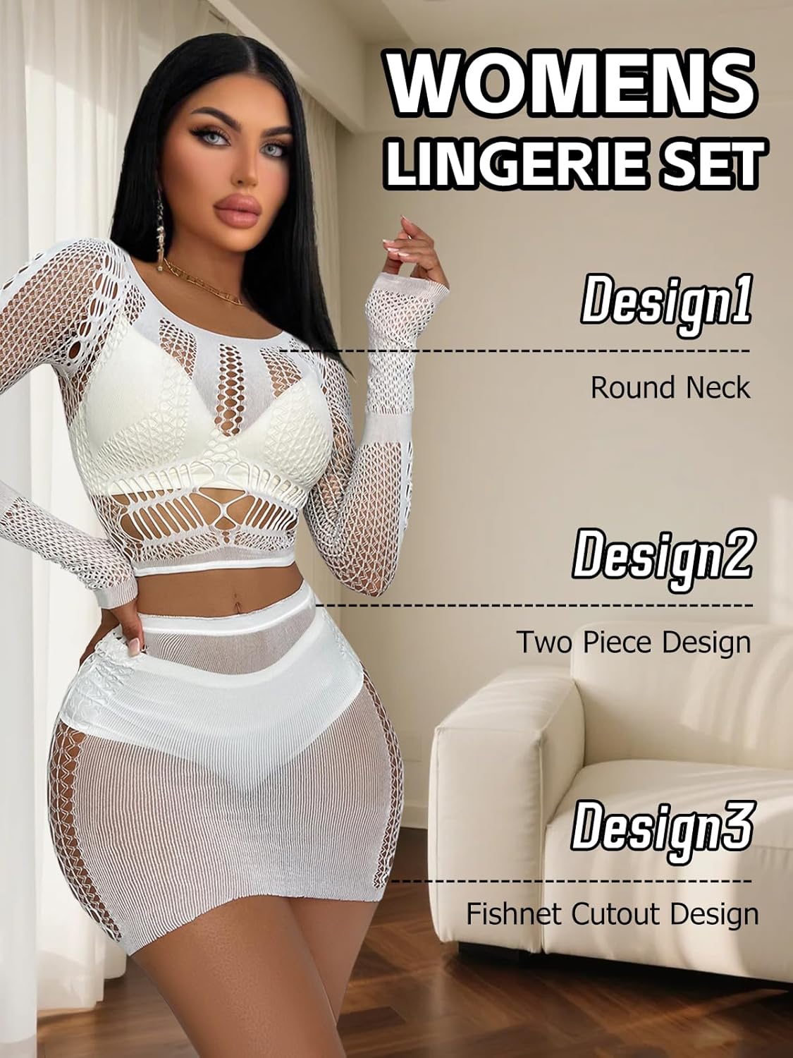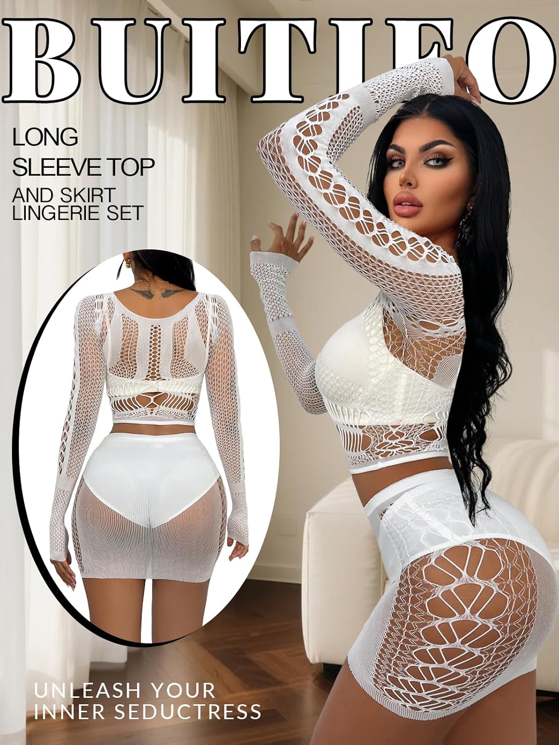 Lingerie Set Sexy Mesh Two Piece Sets Long Sleeve Tops and Bodycon Skirts Sleepwear Nightwear Set