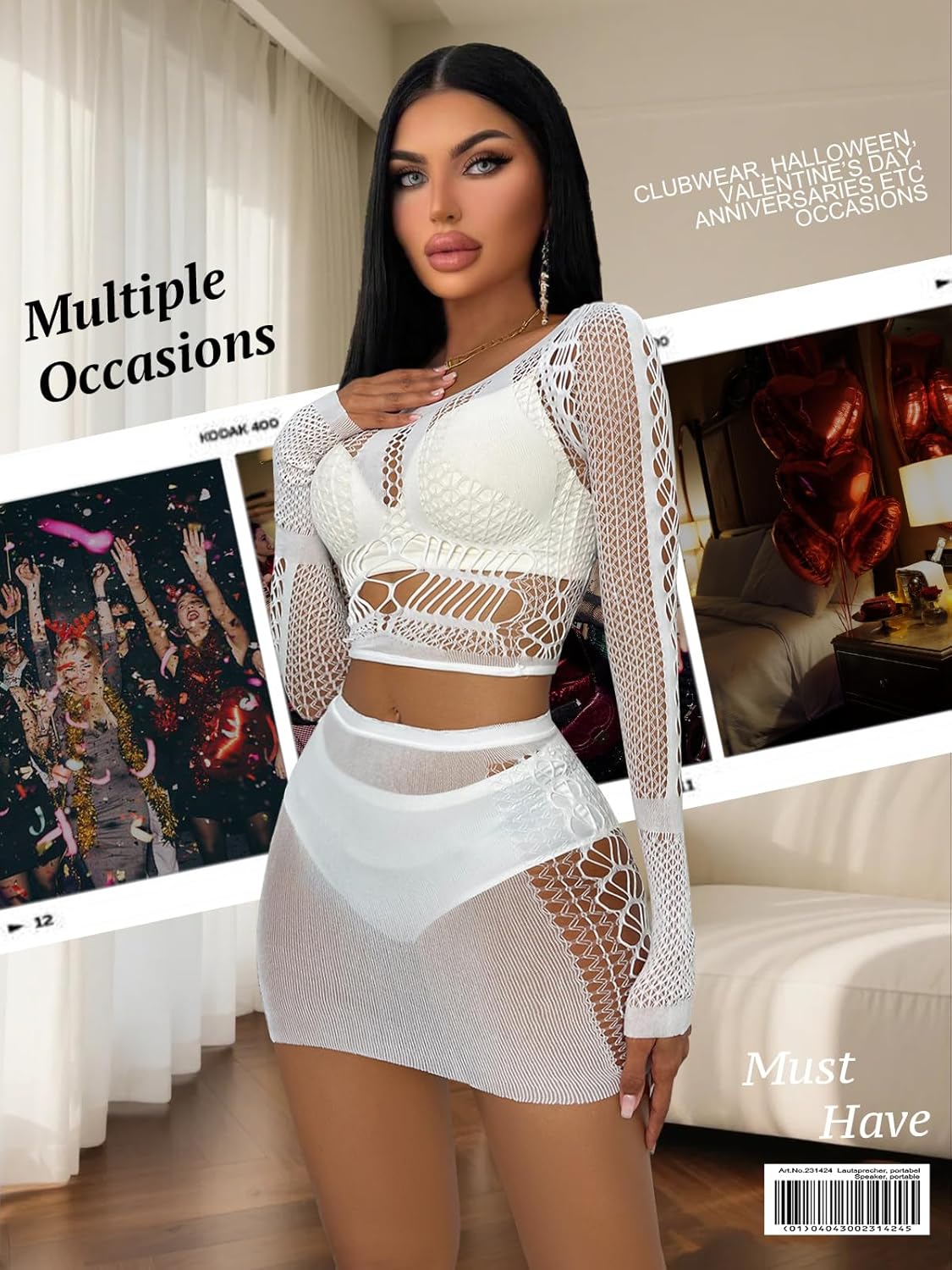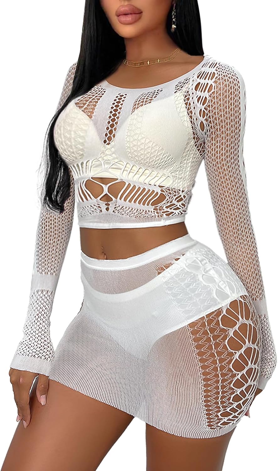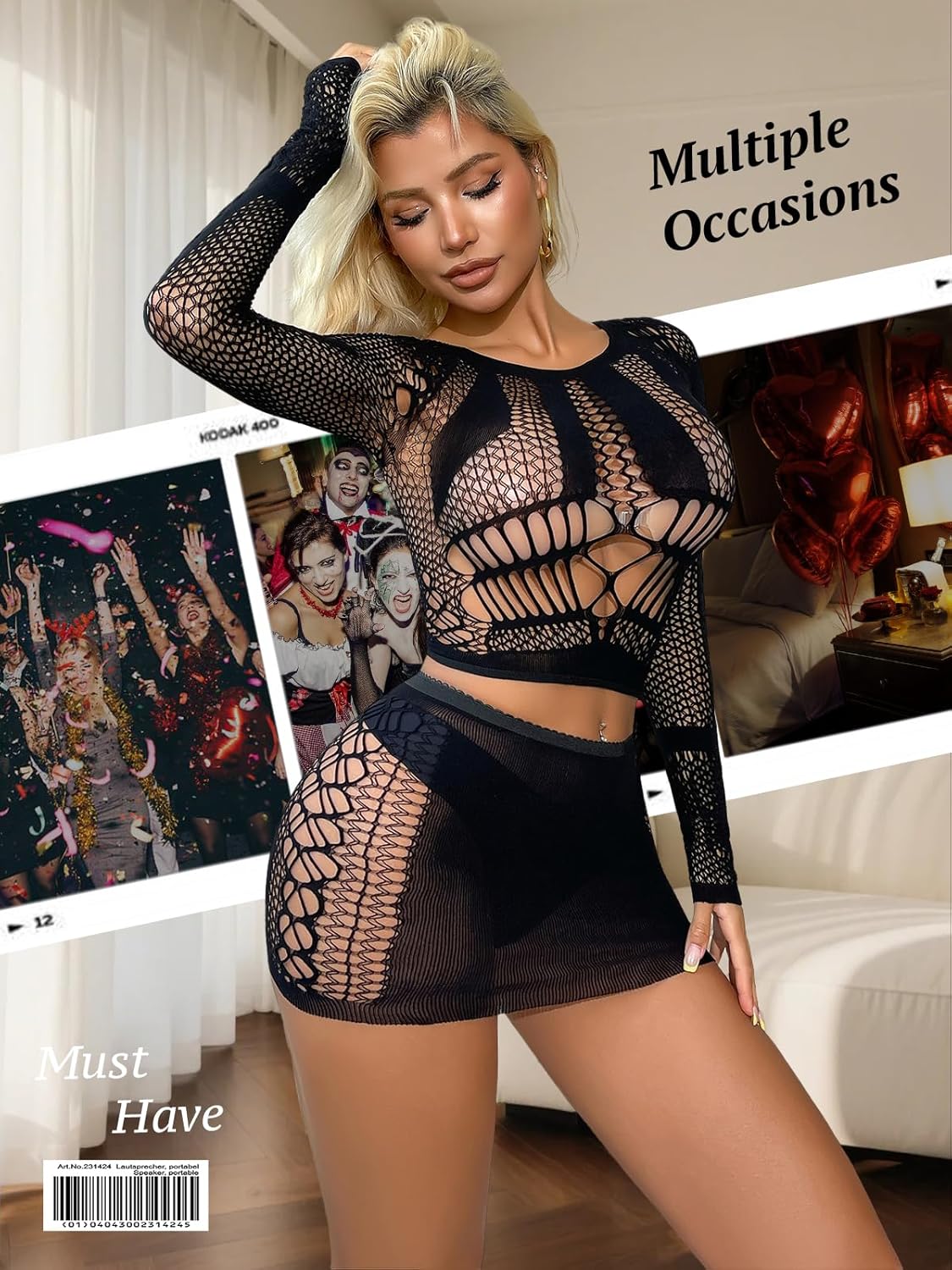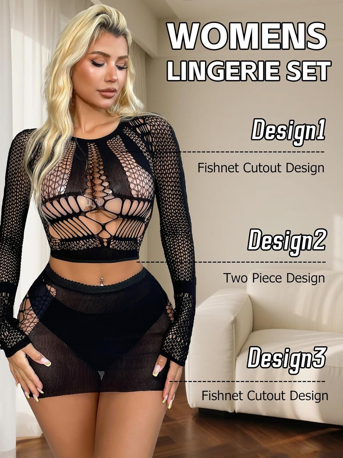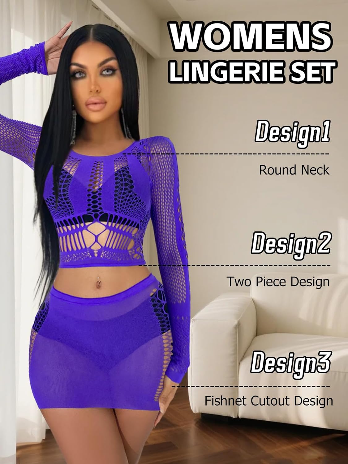 Lingerie Set Sexy Mesh Two Piece Sets Long Sleeve Tops and Bodycon Skirts Sleepwear Nightwear Set