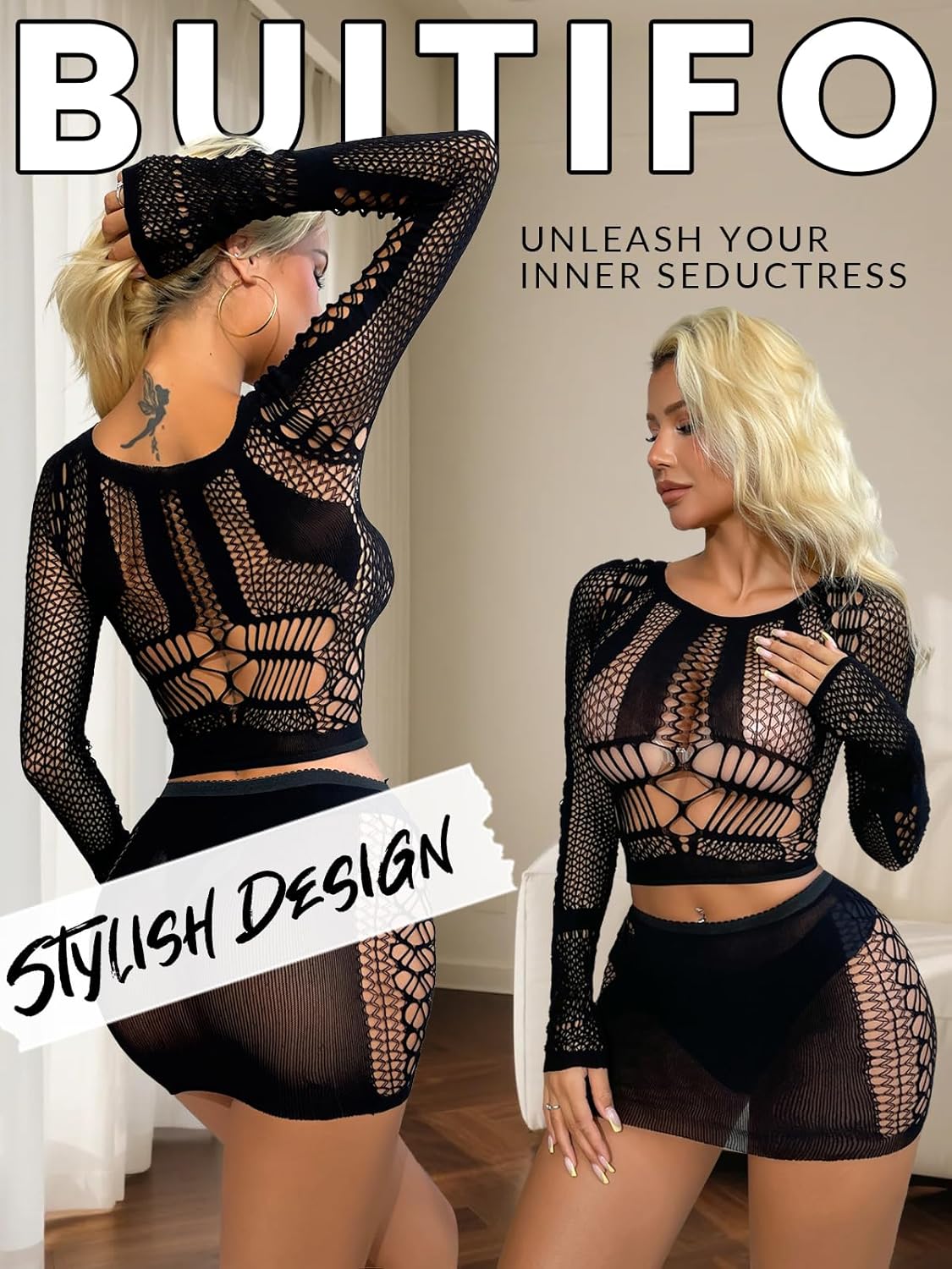 Lingerie Set Sexy Mesh Two Piece Sets Long Sleeve Tops and Bodycon Skirts Sleepwear Nightwear Set - M / Black is backordered. It will be shipped when back in stock.