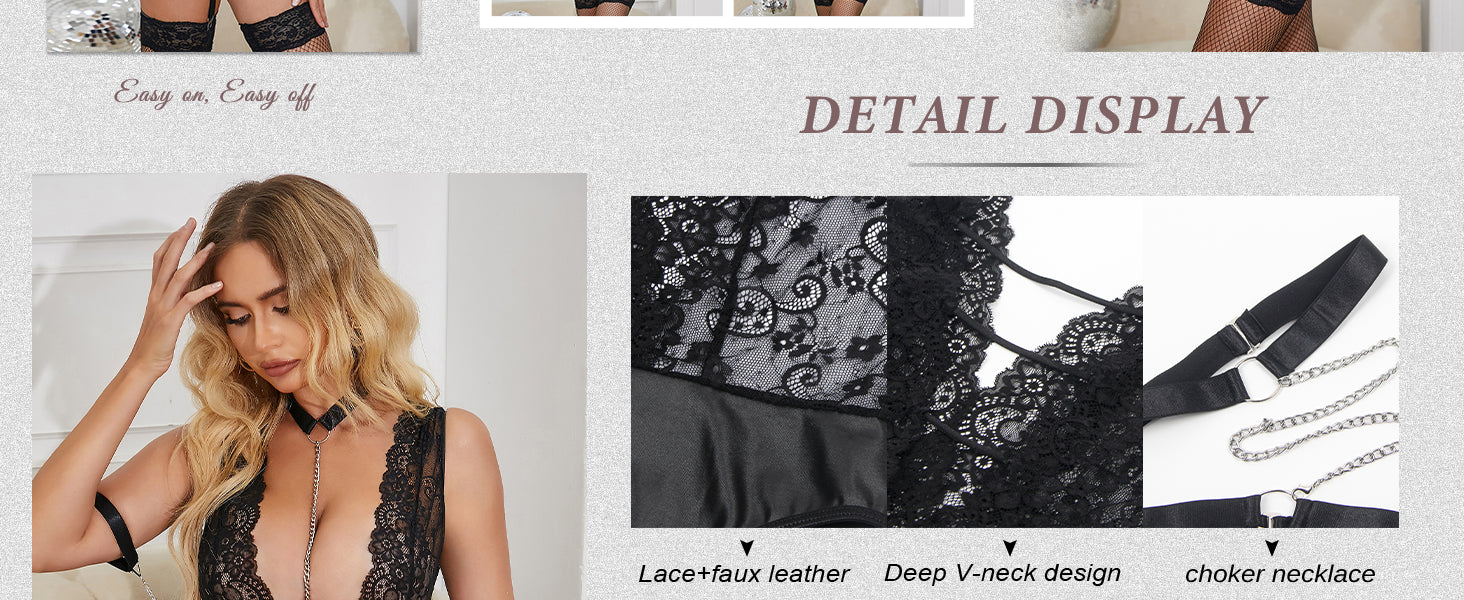 Garter Belt: The lingerie set includes separate garter belt. The garter straps are adorned with detachable metal chain handcuffs and choker,adding a touch of playfulness to your ensemble