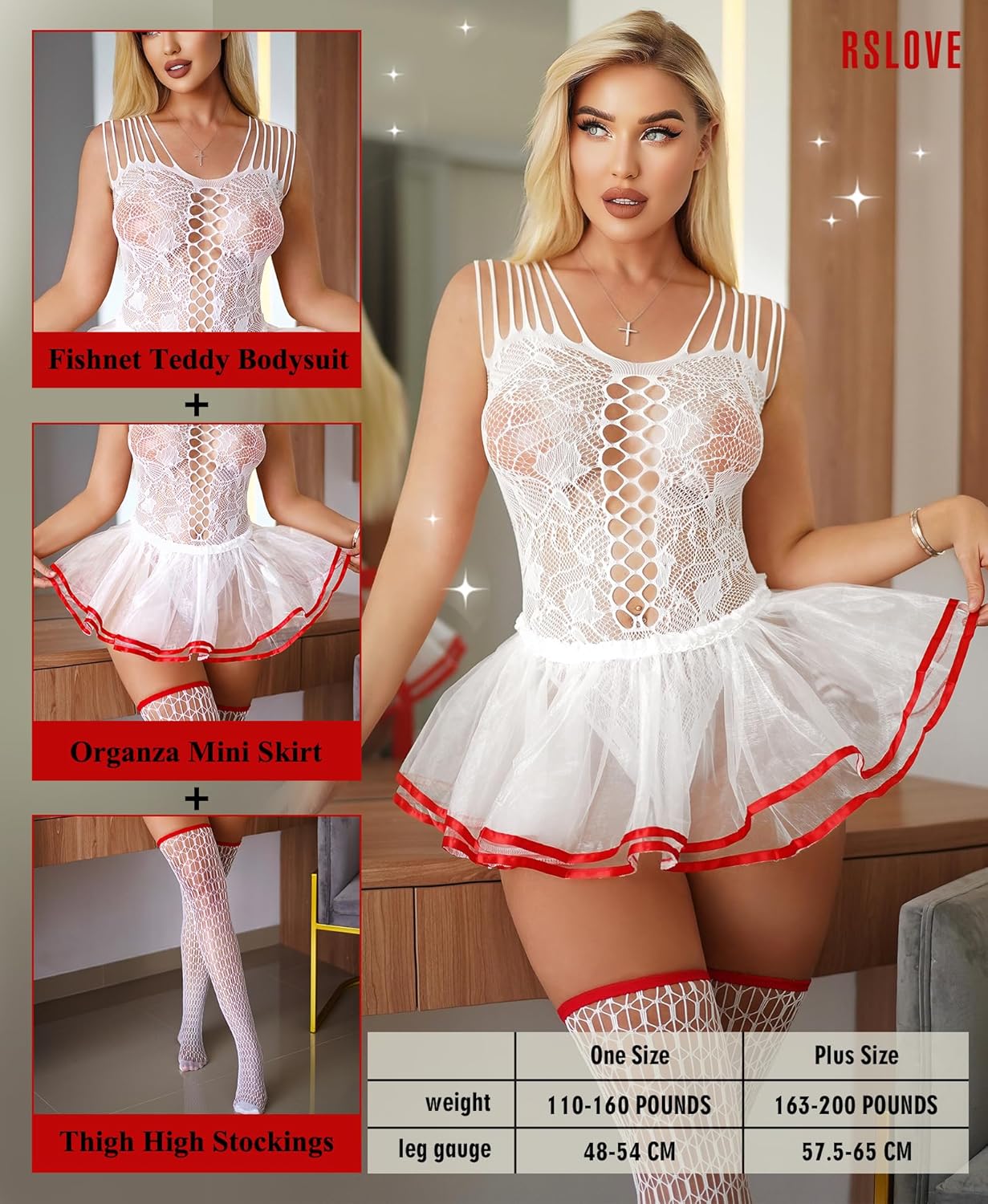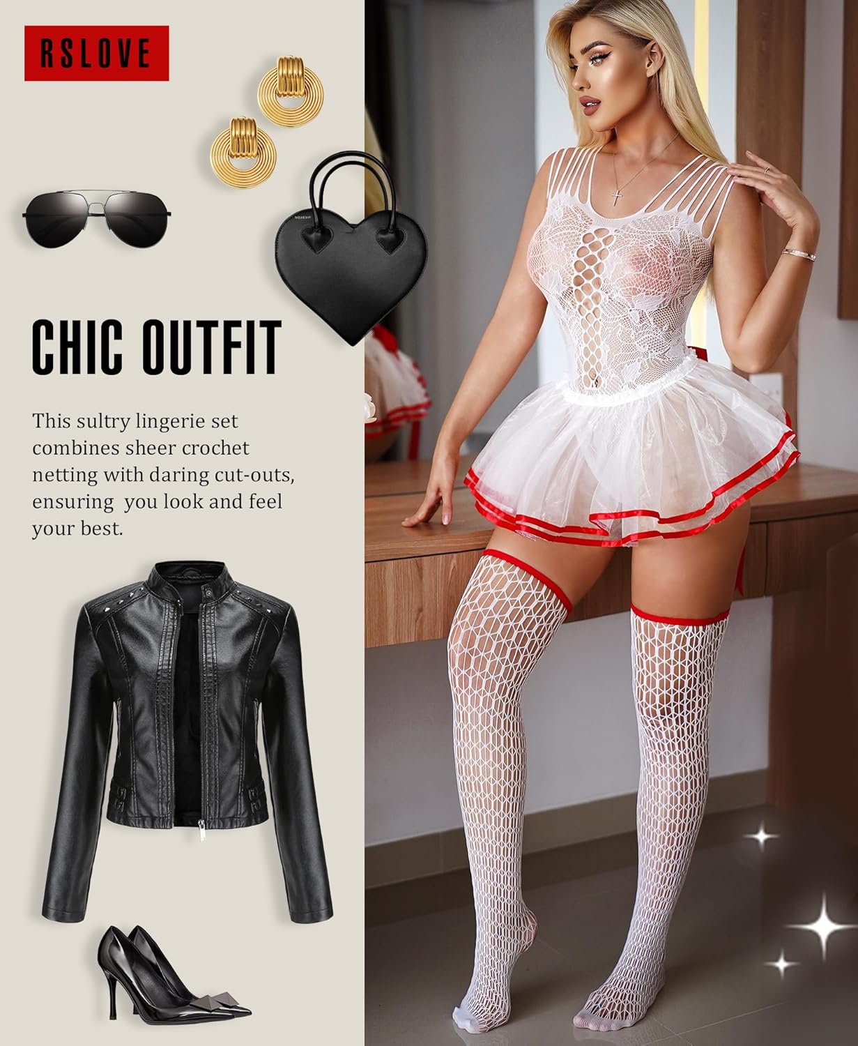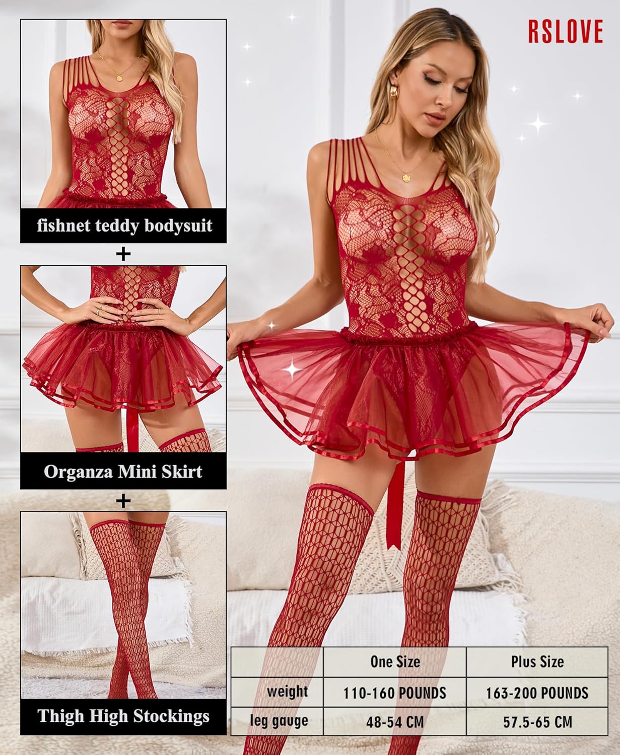 Package and Care: This sexy lingerie set includes 1 lace bodysuit top, 1 ruffled mini skirt, and 1 pair of fishnet stockings. For best results, hand wash and air dry to maintain the quality and longevity of the set.
