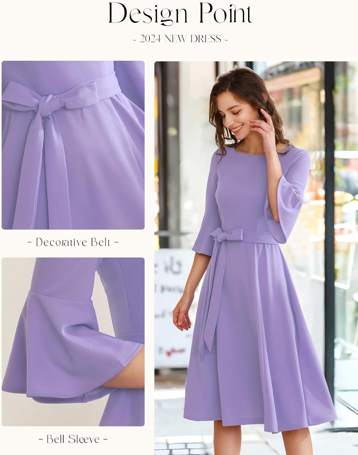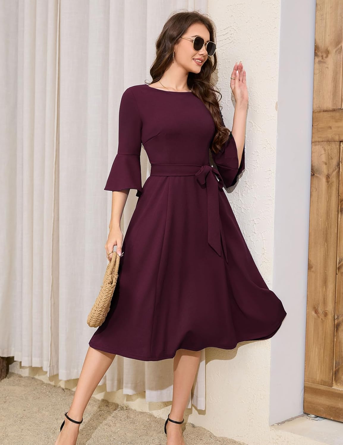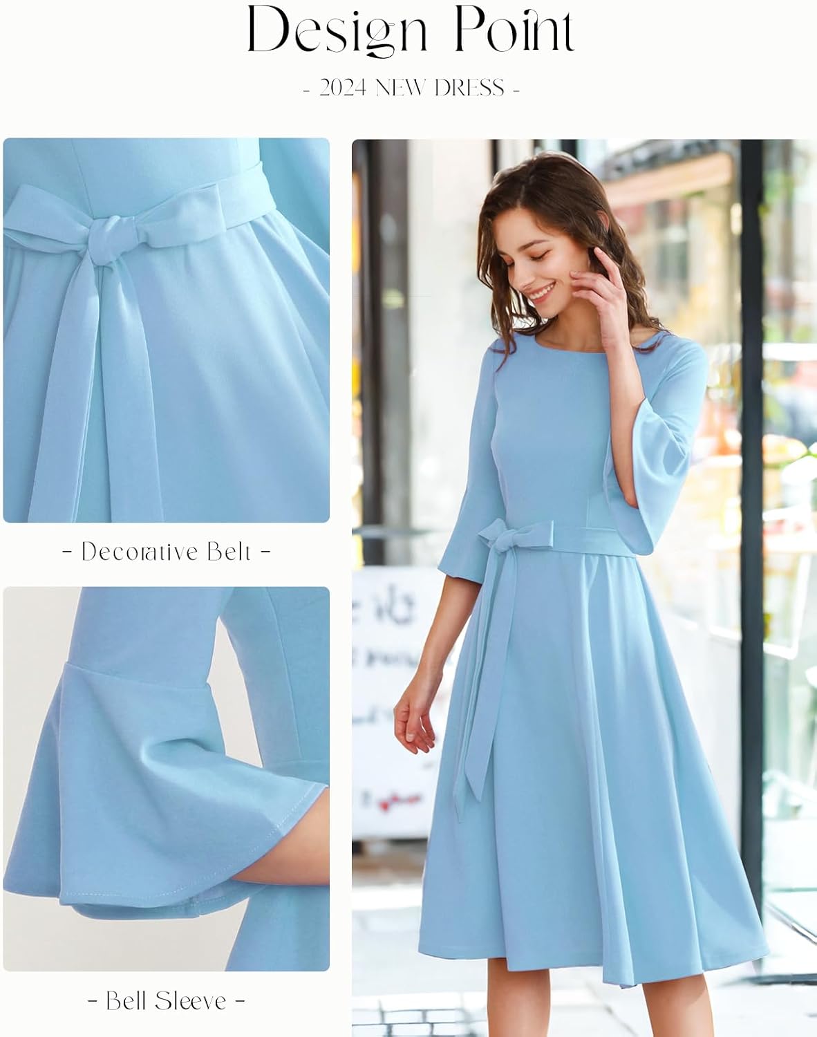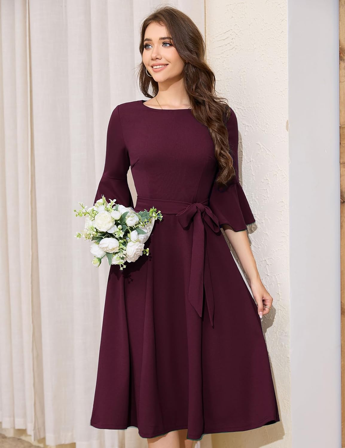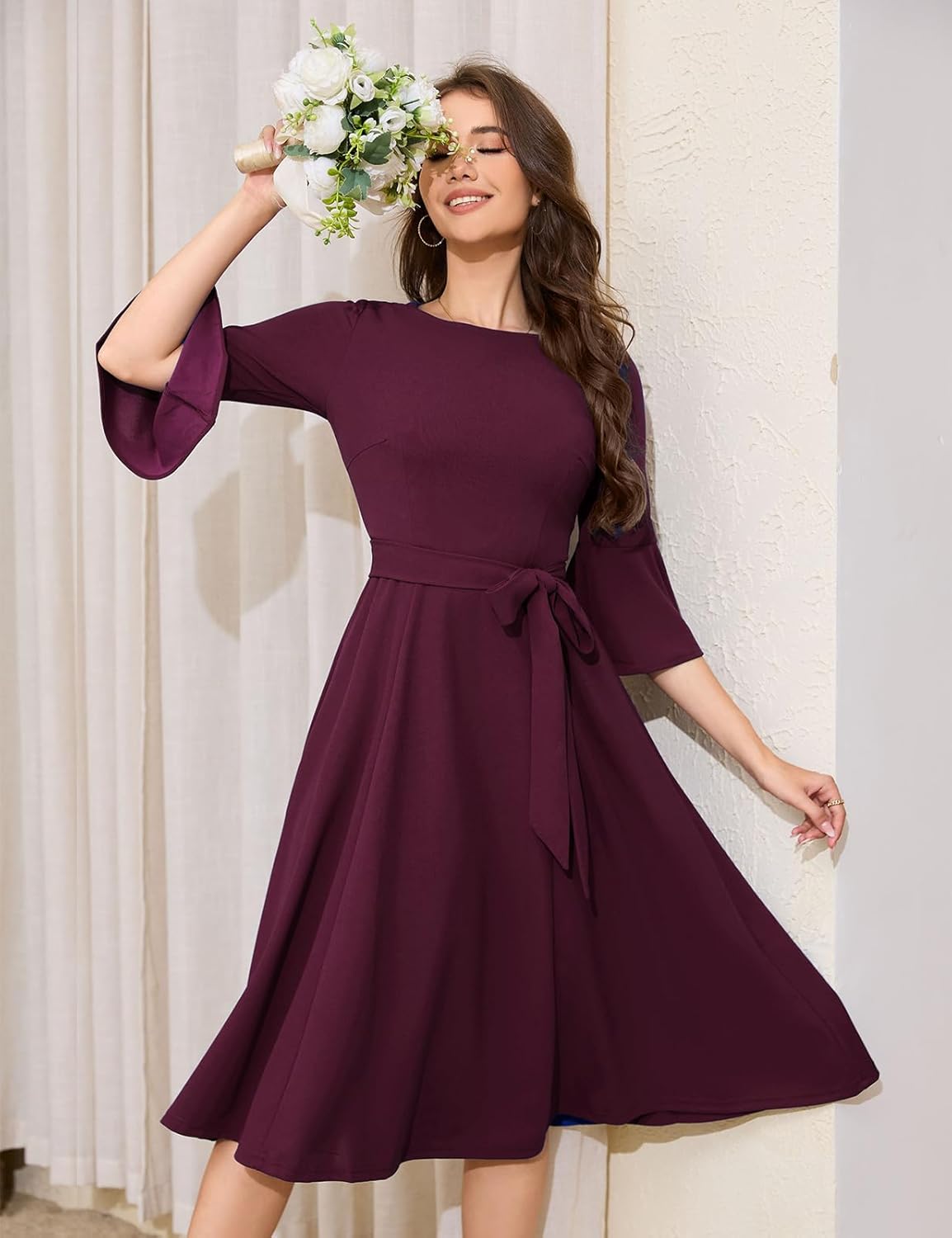 Features:Round Neck, Flare Bell Sleeve, 3/4 Sleeve, Decorative Belt, Three Quarter Sleeve, Midi Knee Length, Flared Swing, Above knee length, Concealed zipper back, Unlined but not see-through. Perfect Wedding Guest Dress for Autumn,Winter and Early Spring Seasons