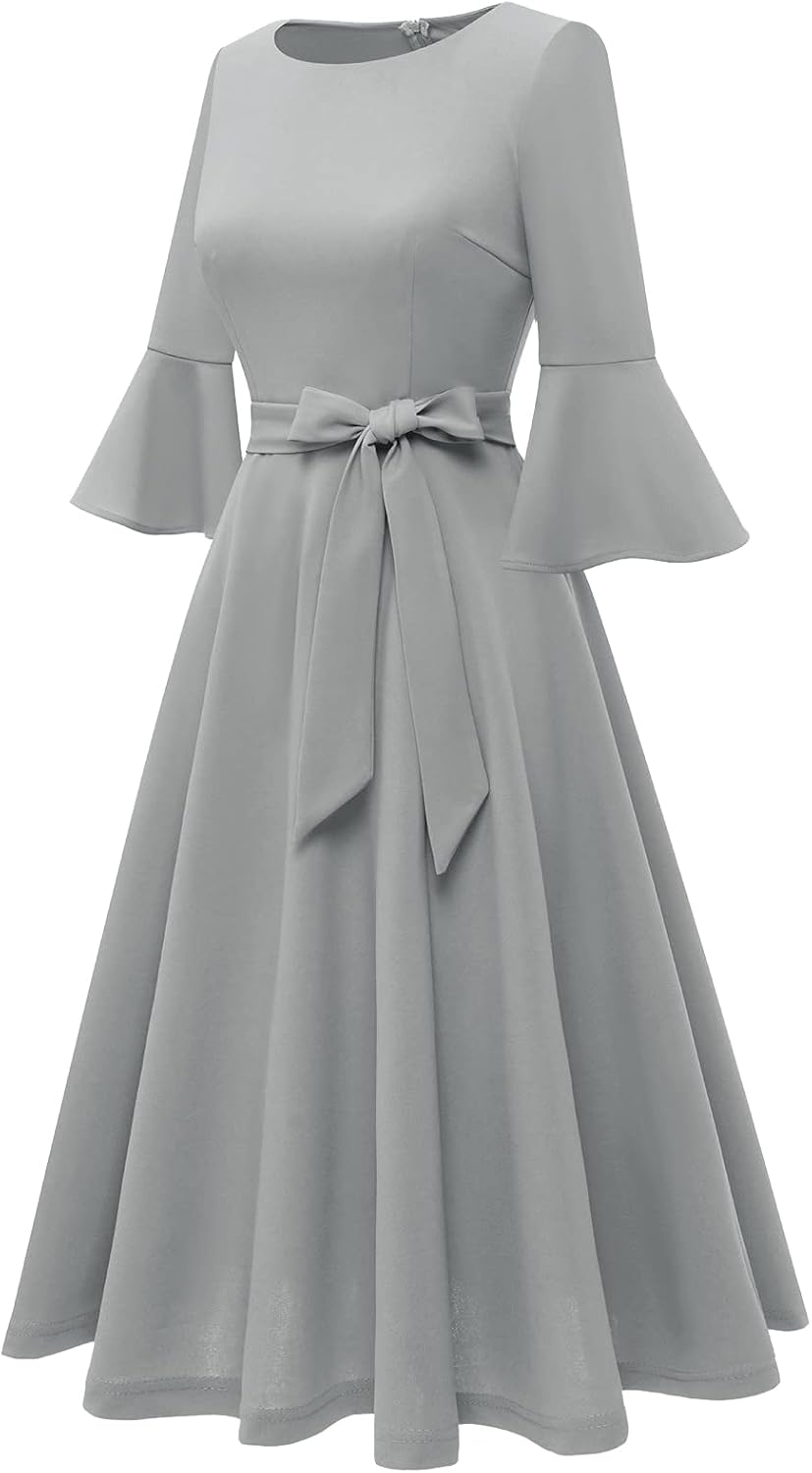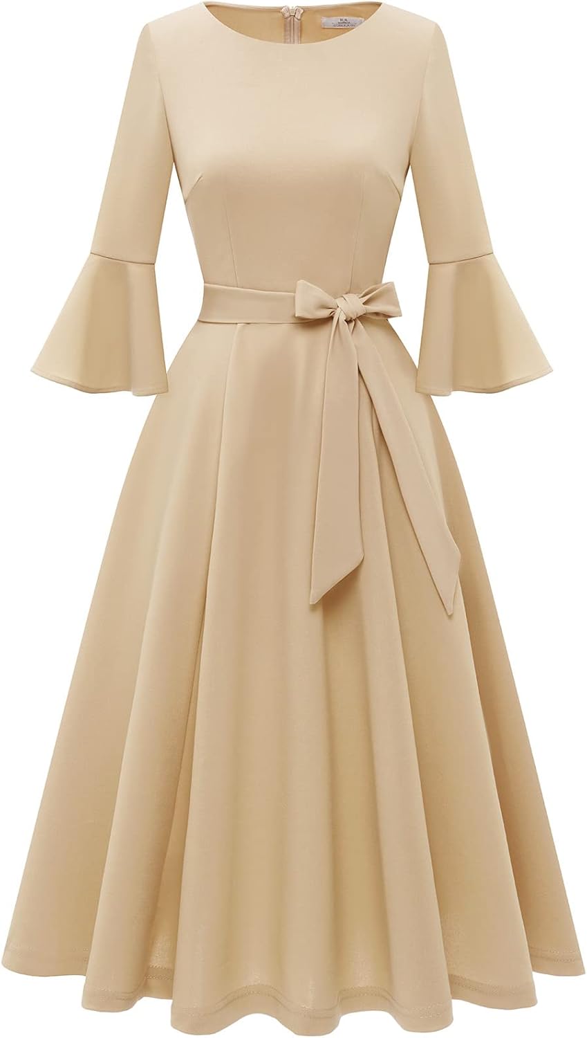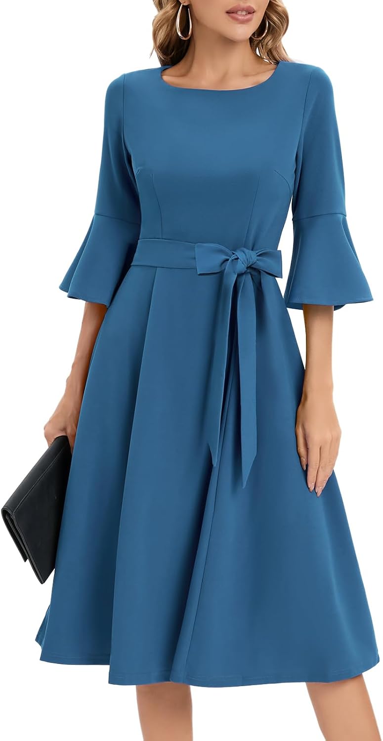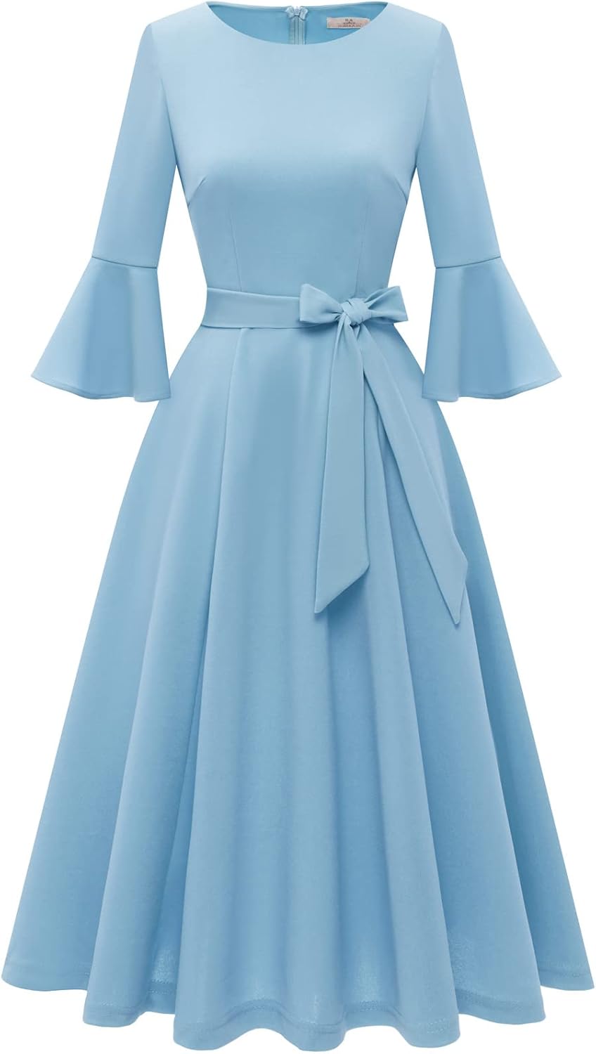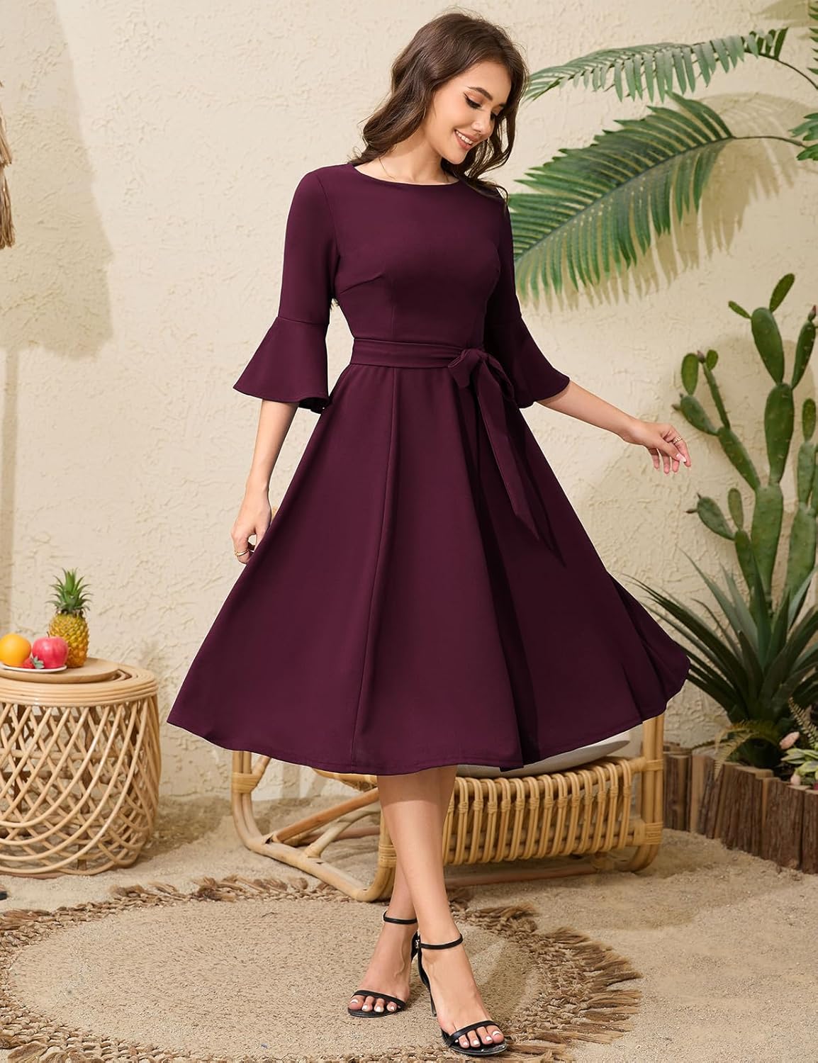 Features:Round Neck, Flare Bell Sleeve, 3/4 Sleeve, Decorative Belt, Three Quarter Sleeve, Midi Knee Length, Flared Swing, Above knee length, Concealed zipper back, Unlined but not see-through. Perfect Wedding Guest Dress for Autumn,Winter and Early Spring Seasons