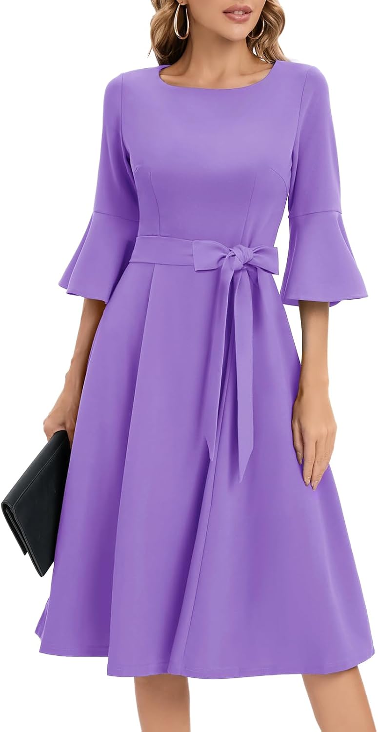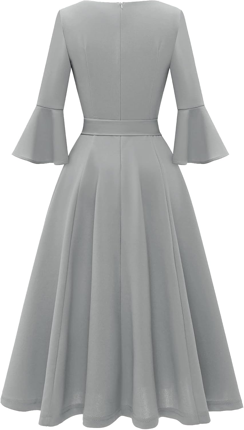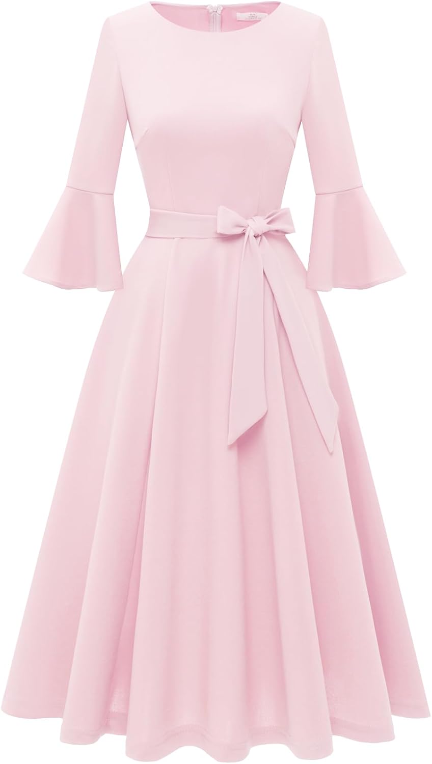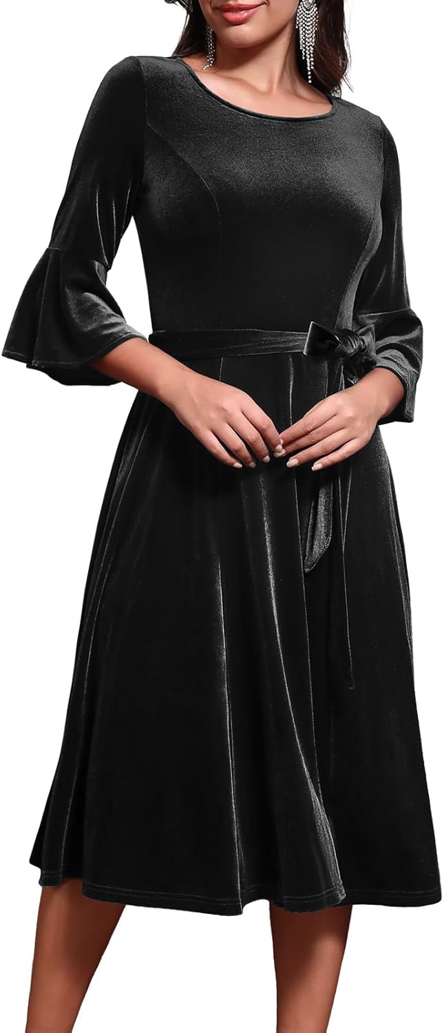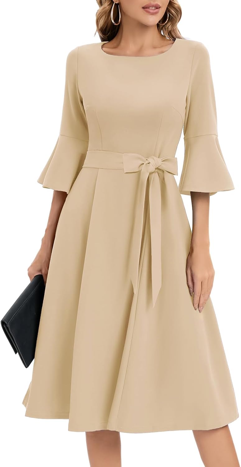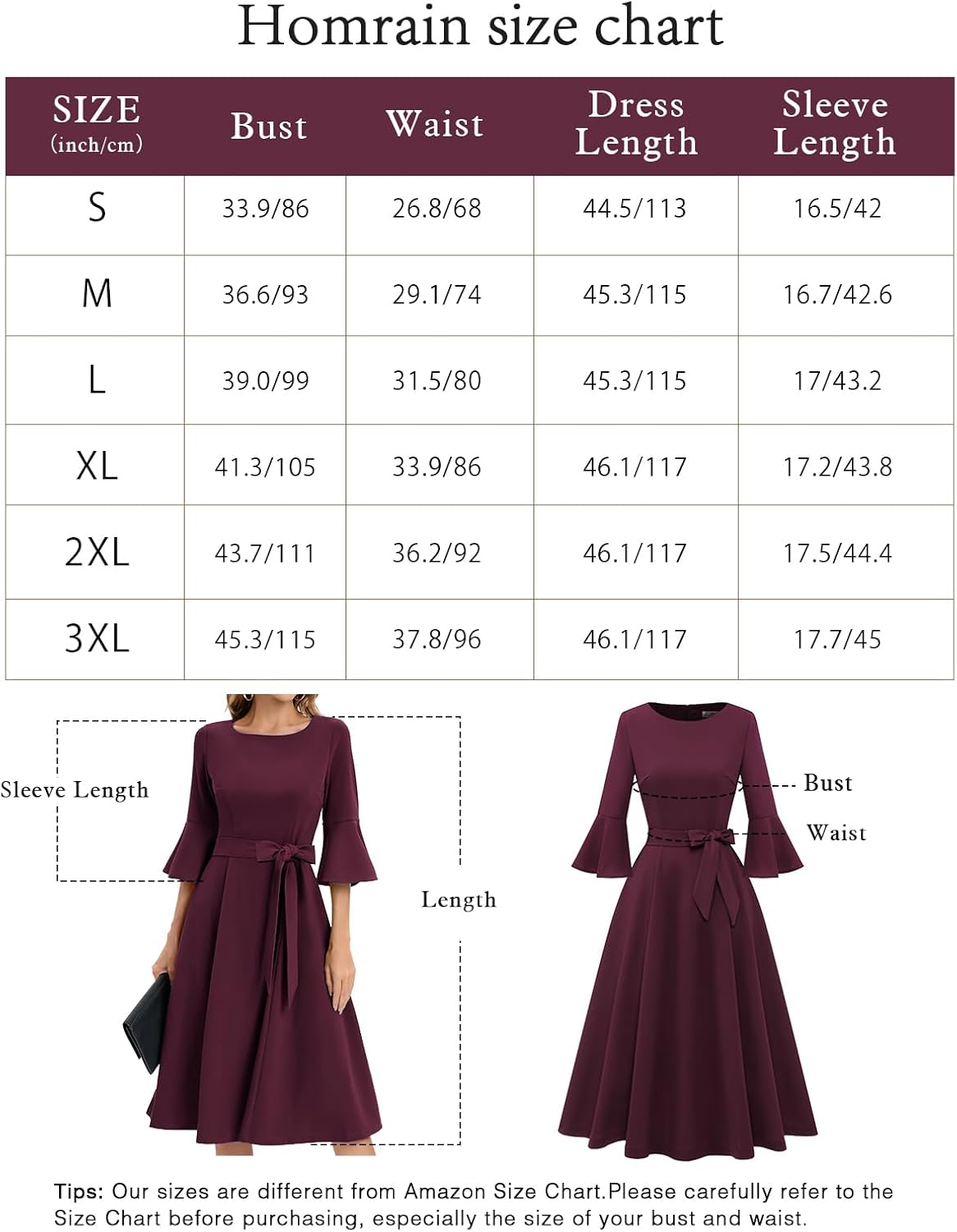 Features:Round Neck, Flare Bell Sleeve, 3/4 Sleeve, Decorative Belt, Three Quarter Sleeve, Midi Knee Length, Flared Swing, Above knee length, Concealed zipper back, Unlined but not see-through. Perfect Wedding Guest Dress for Autumn,Winter and Early Spring Seasons