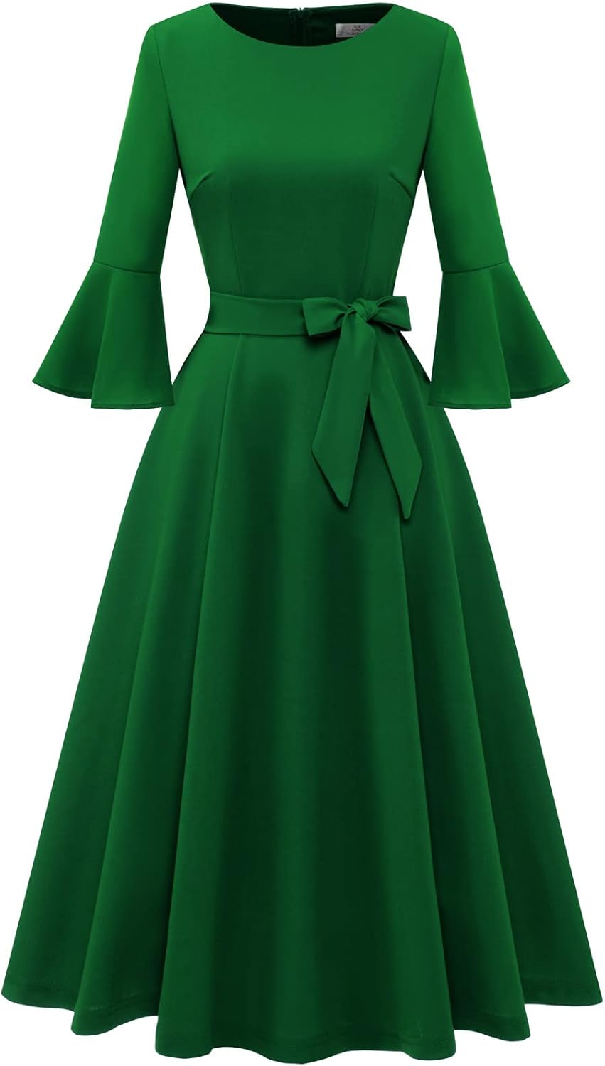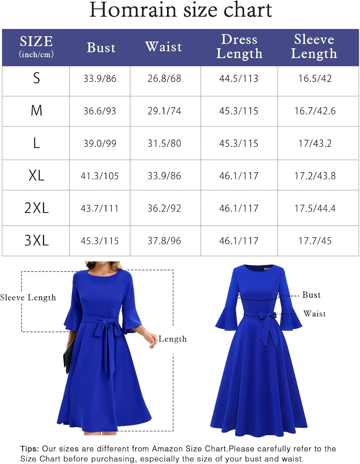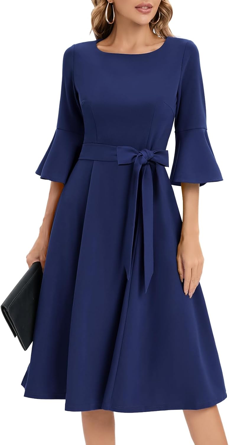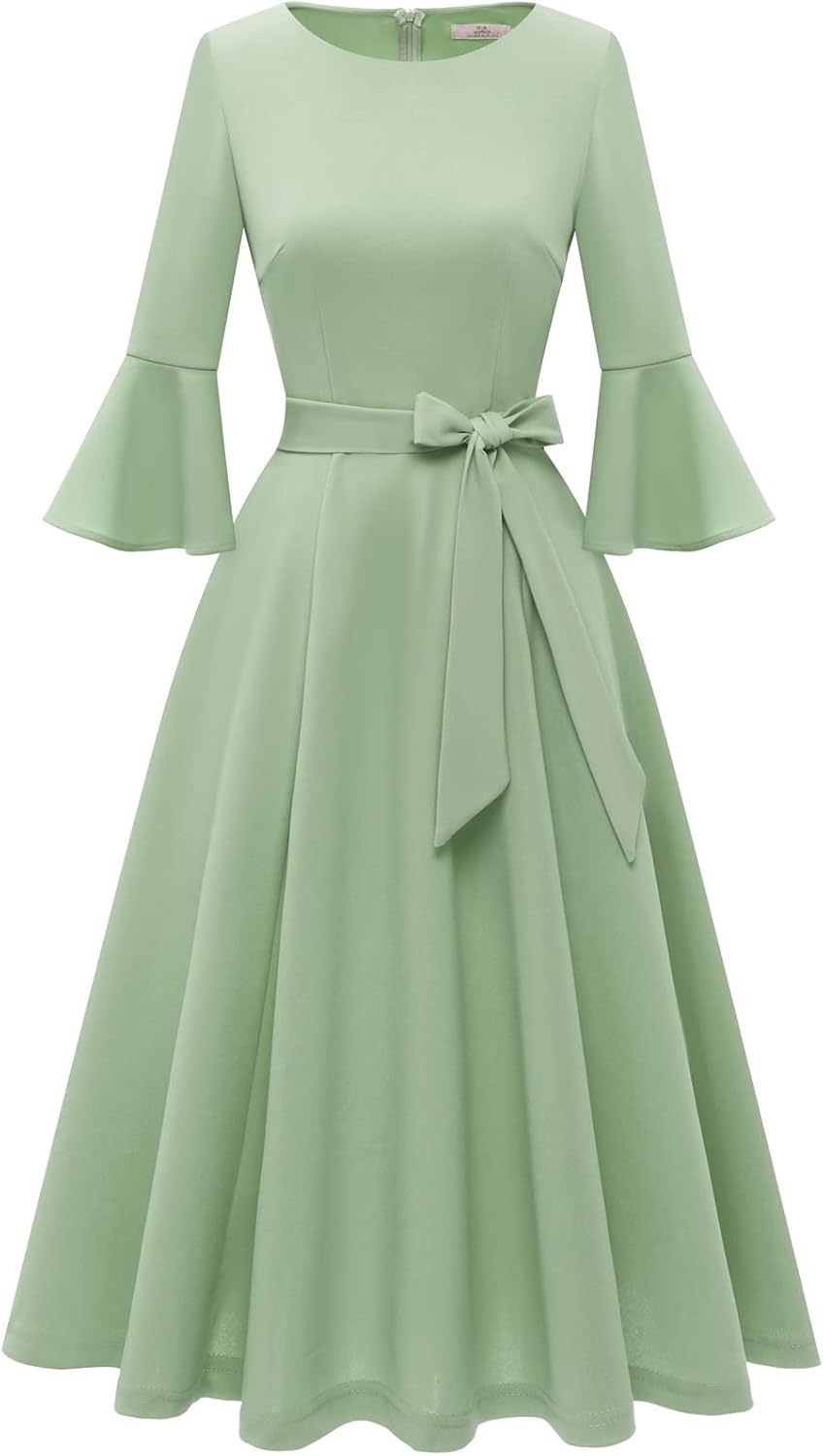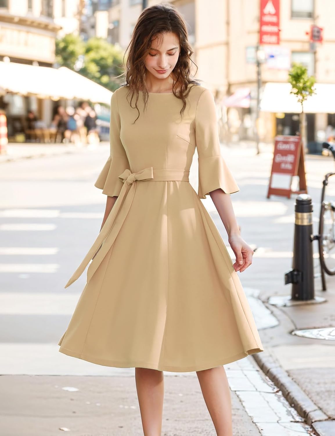 Features:Round Neck, Flare Bell Sleeve, 3/4 Sleeve, Decorative Belt, Three Quarter Sleeve, Midi Knee Length, Flared Swing, Above knee length, Concealed zipper back, Unlined but not see-through. Perfect Wedding Guest Dress for Autumn,Winter and Early Spring Seasons