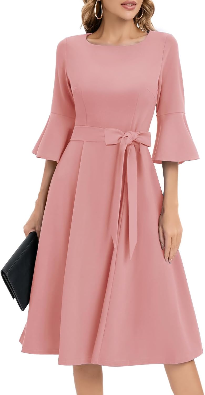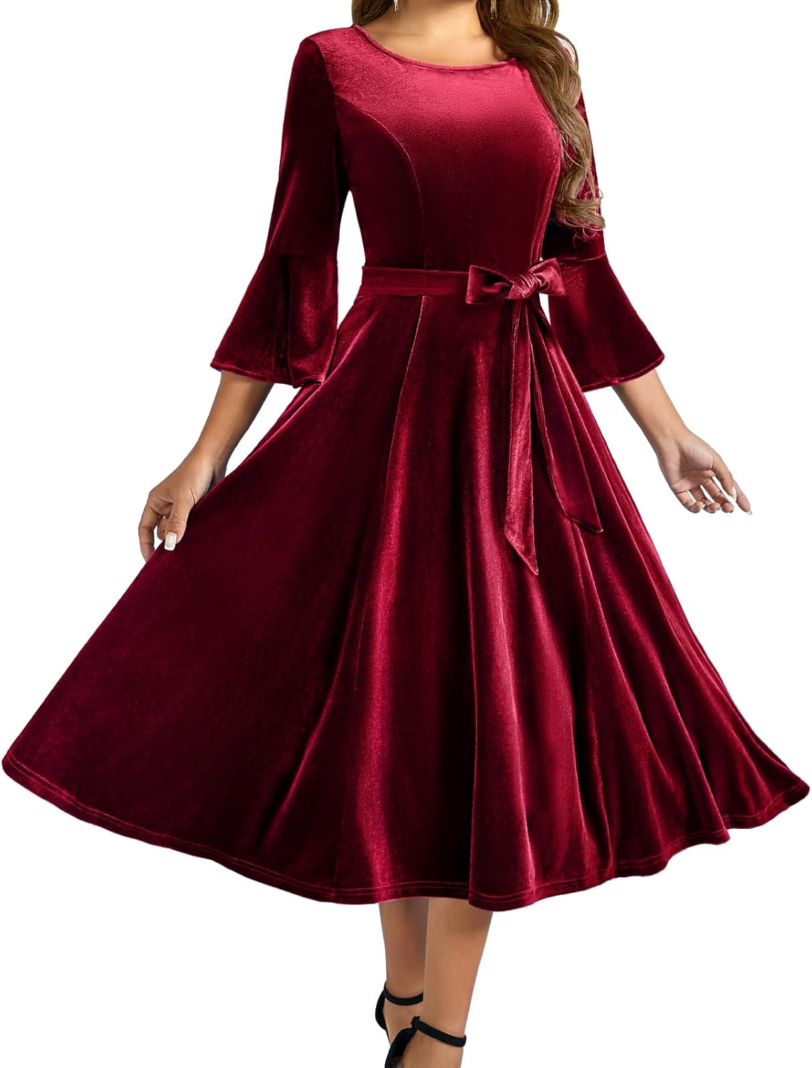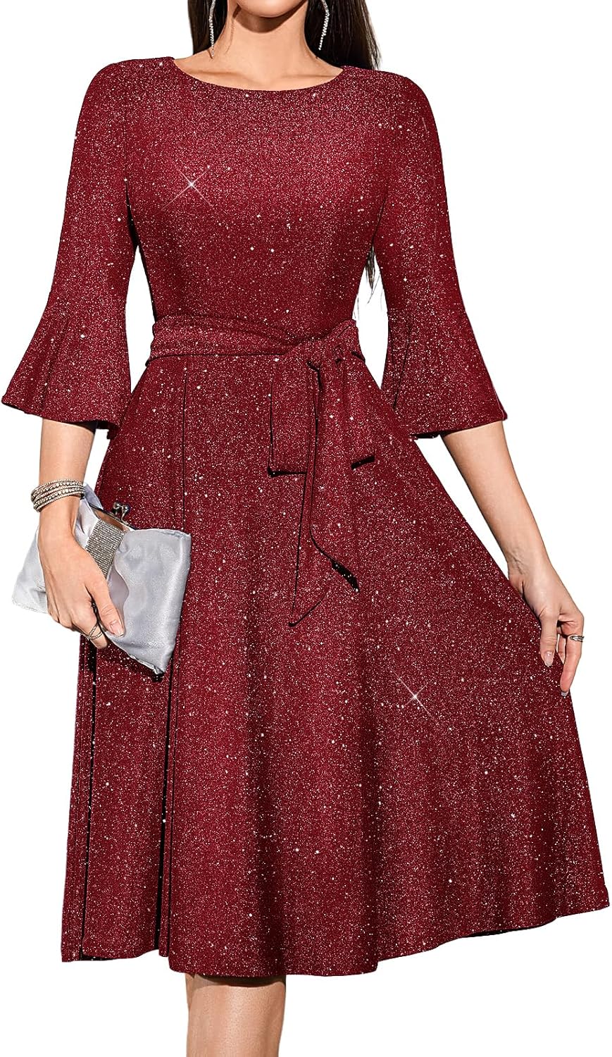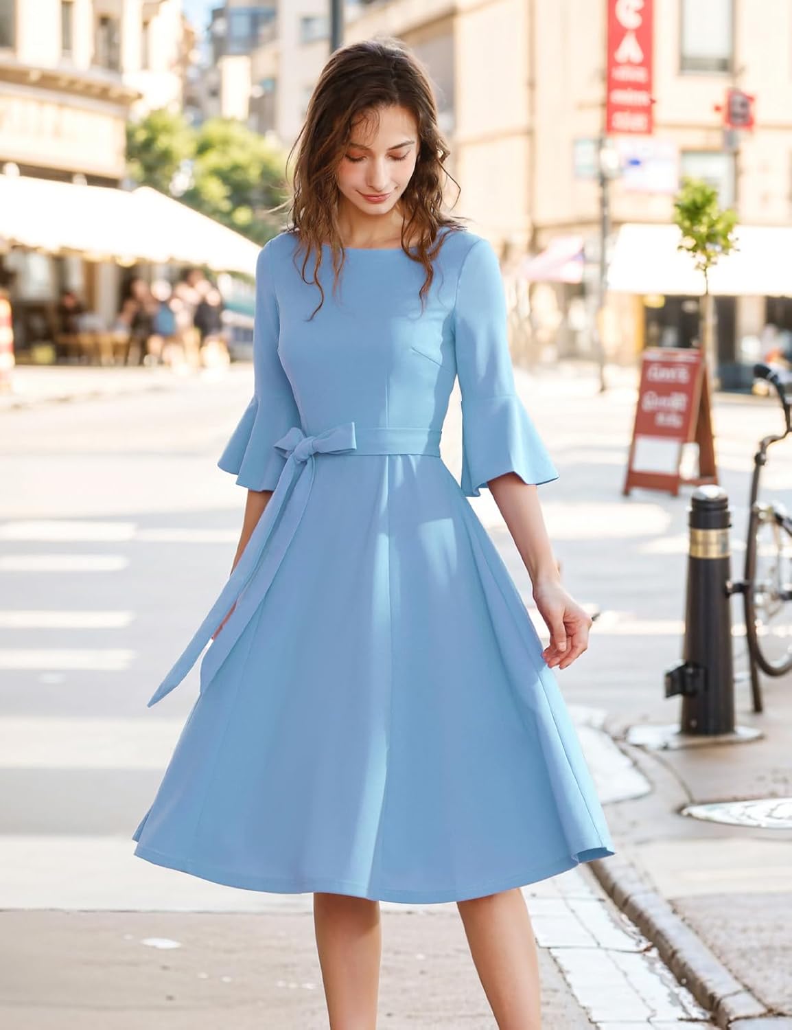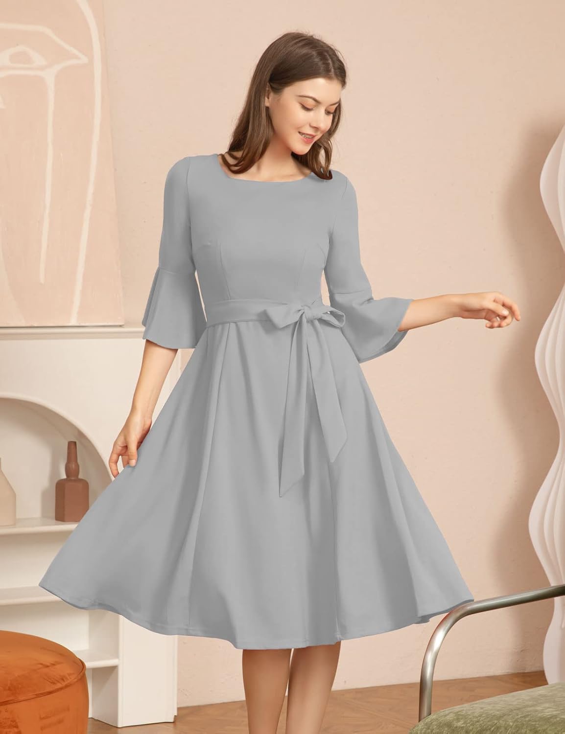 Features:Round Neck, Flare Bell Sleeve, 3/4 Sleeve, Decorative Belt, Three Quarter Sleeve, Midi Knee Length, Flared Swing, Above knee length, Concealed zipper back, Unlined but not see-through. Perfect Wedding Guest Dress for Autumn,Winter and Early Spring Seasons