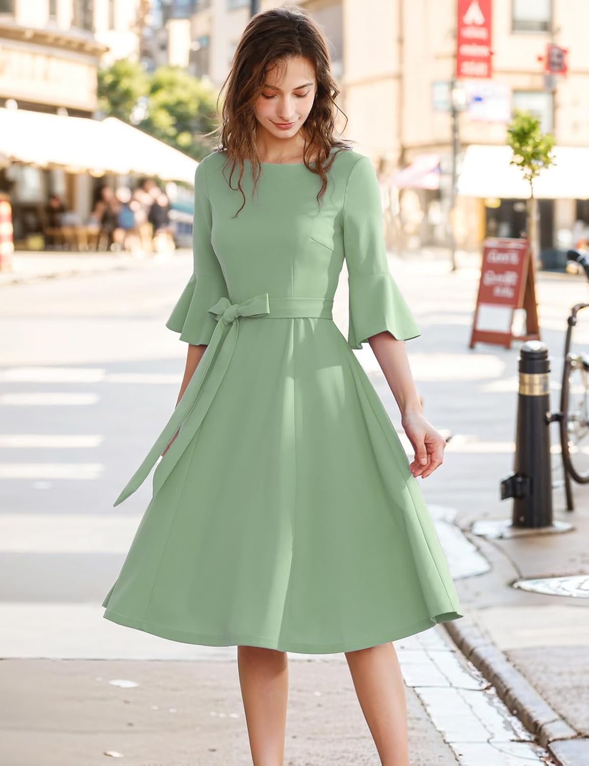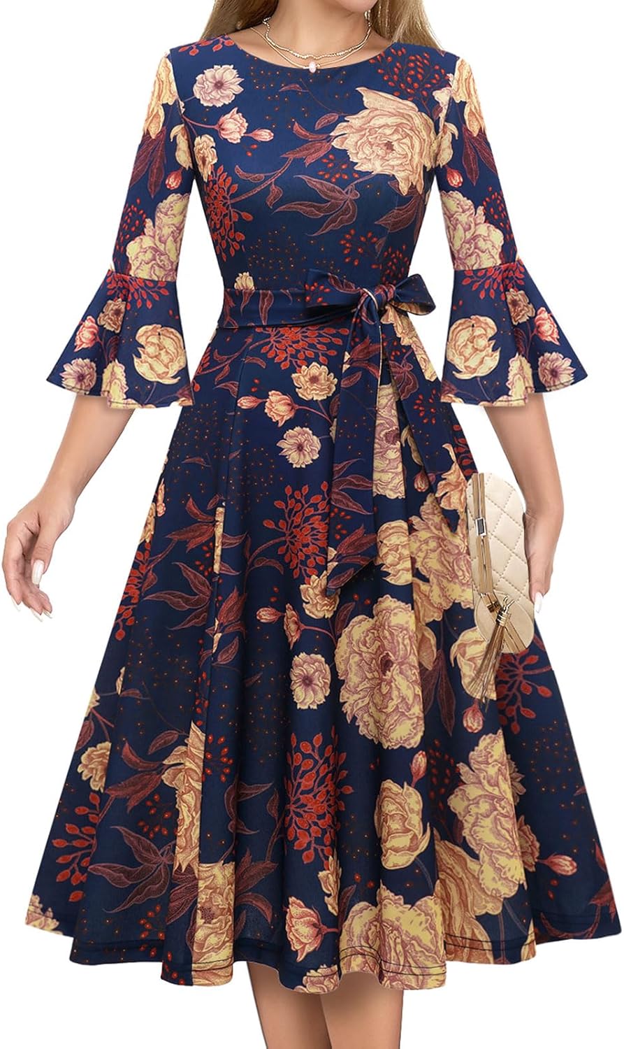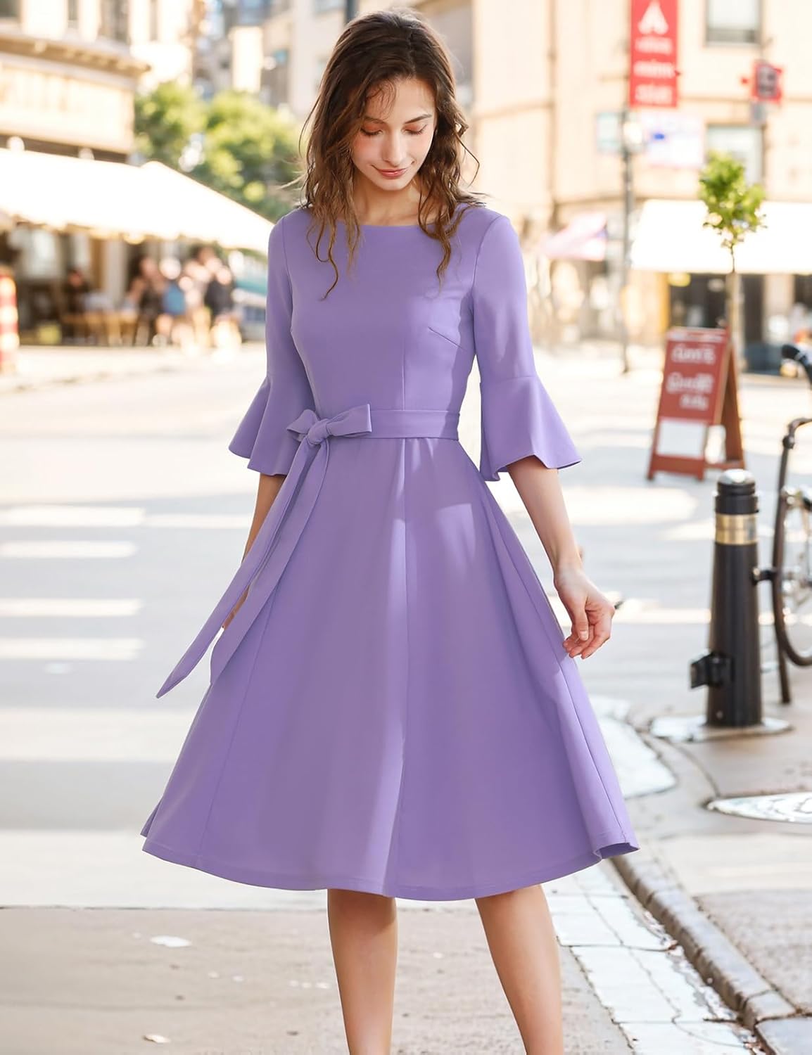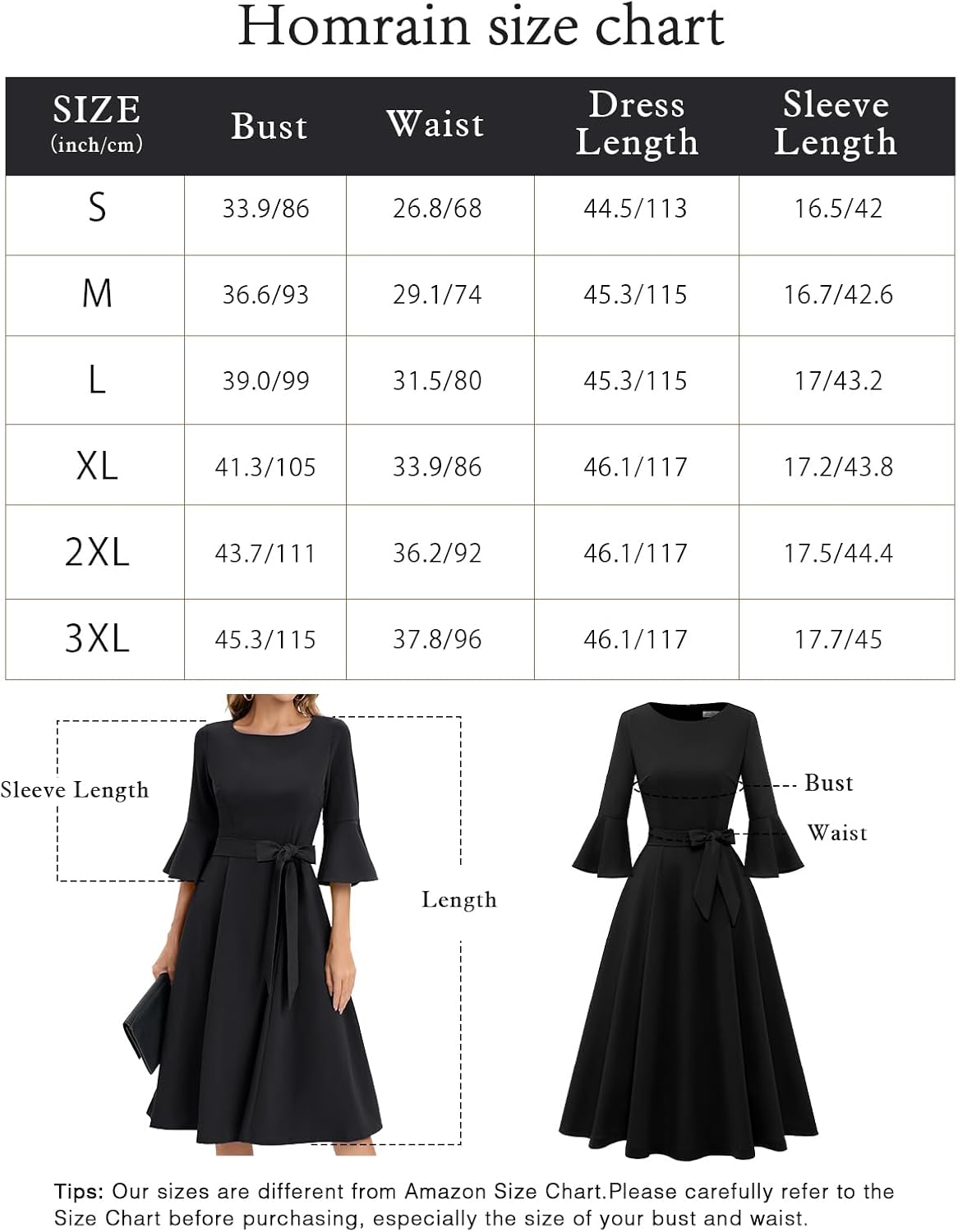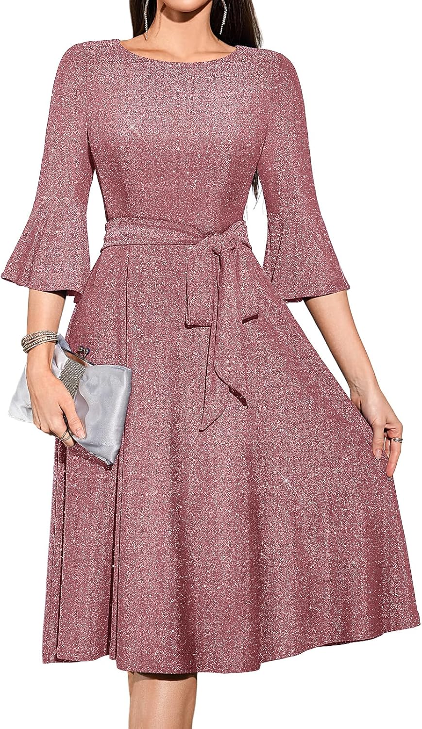 Features:Round Neck, Flare Bell Sleeve, 3/4 Sleeve, Decorative Belt, Three Quarter Sleeve, Midi Knee Length, Flared Swing, Above knee length, Concealed zipper back, Unlined but not see-through. Perfect Wedding Guest Dress for Autumn,Winter and Early Spring Seasons