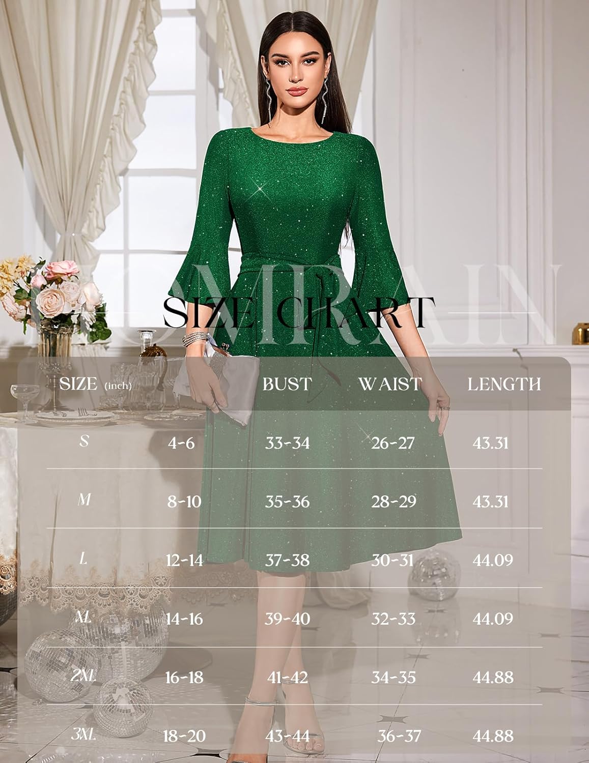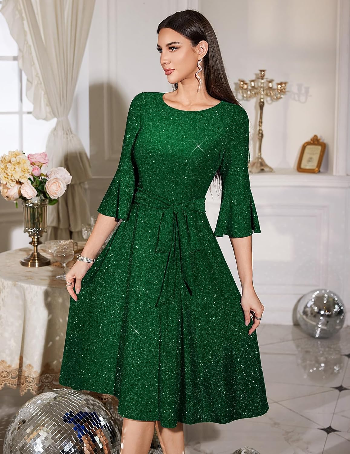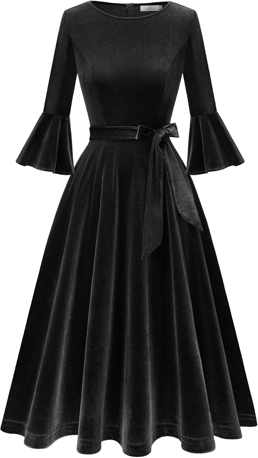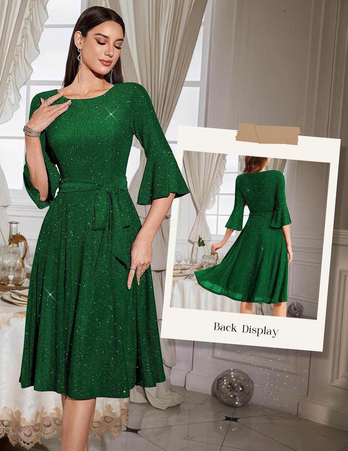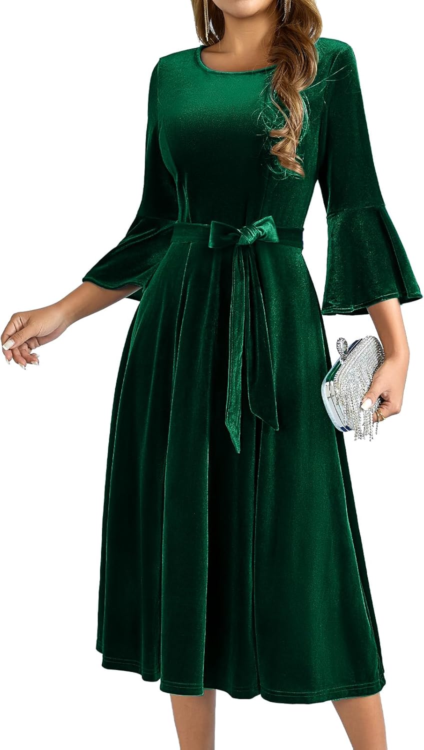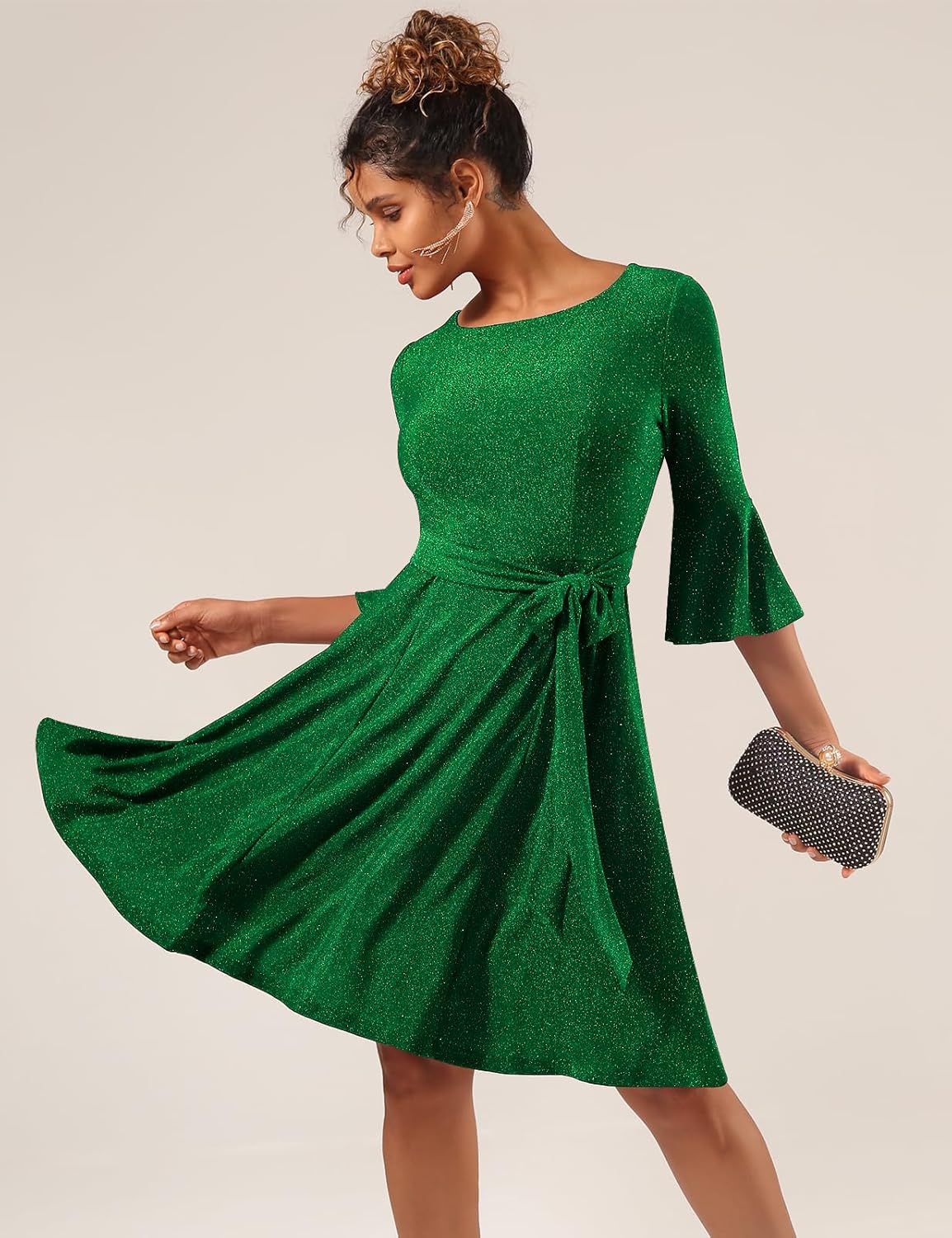 Features:Round Neck, Flare Bell Sleeve, 3/4 Sleeve, Decorative Belt, Three Quarter Sleeve, Midi Knee Length, Flared Swing, Above knee length, Concealed zipper back, Unlined but not see-through. Perfect Wedding Guest Dress for Autumn,Winter and Early Spring Seasons