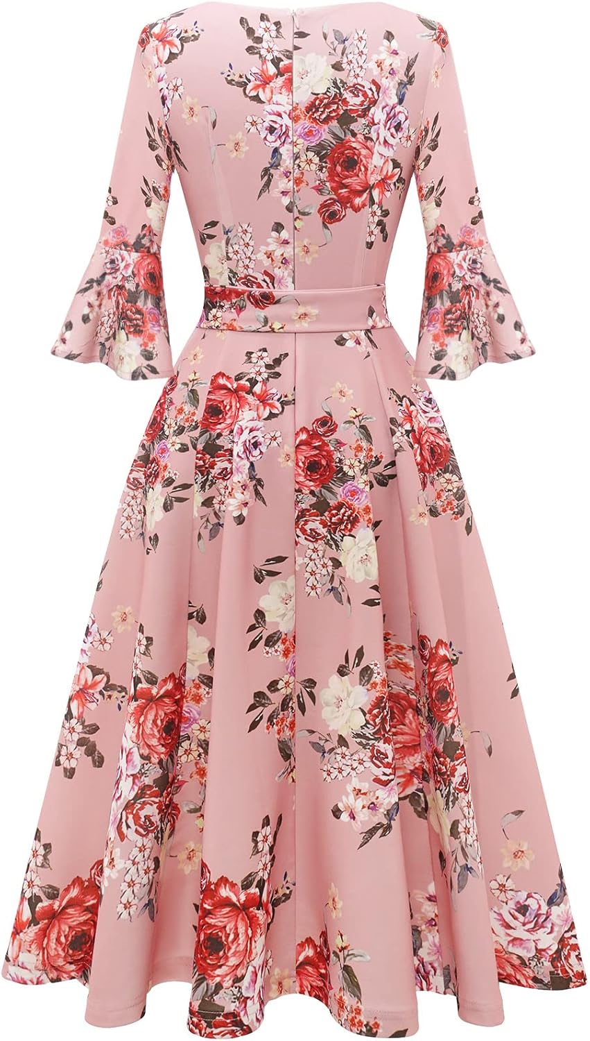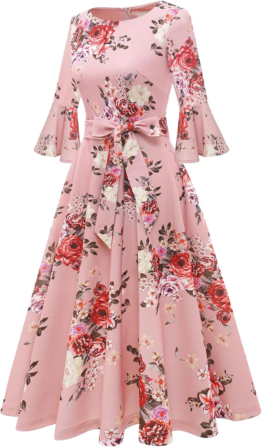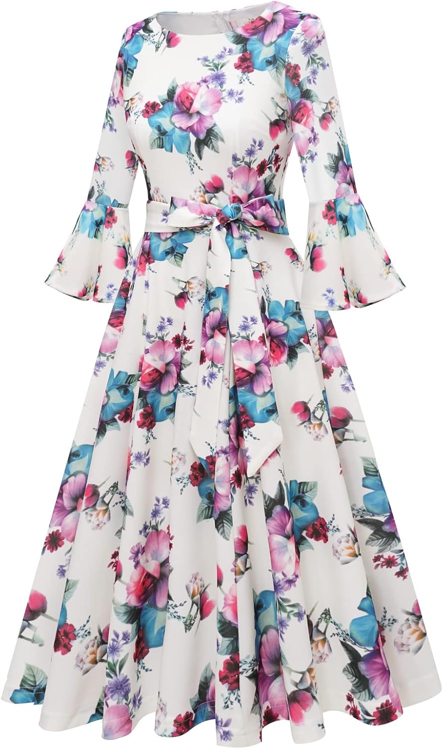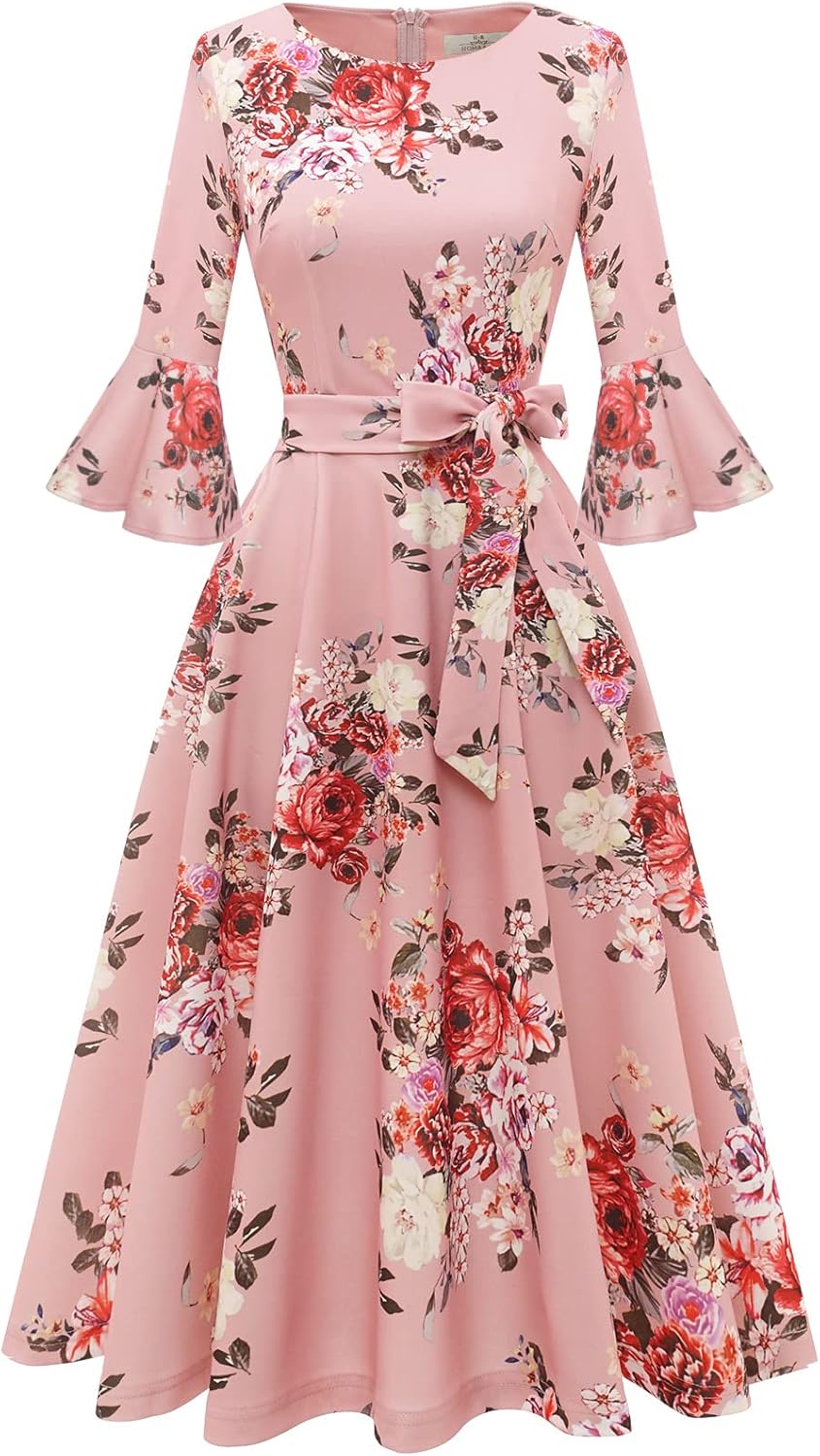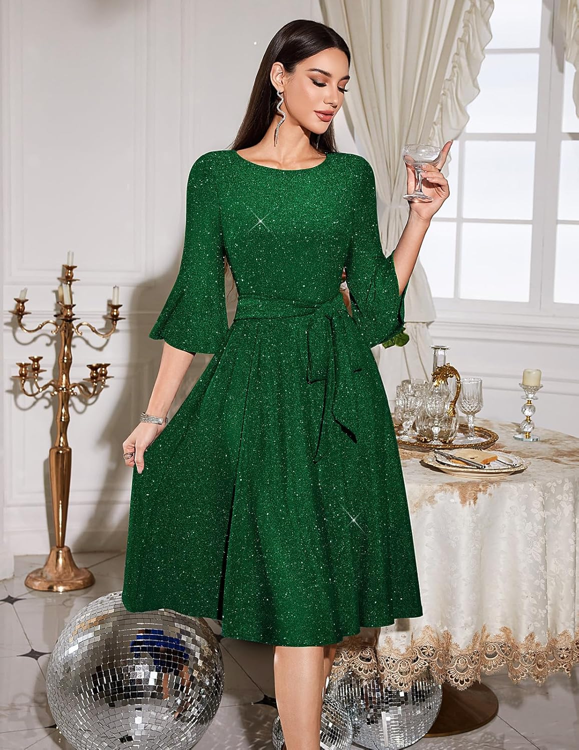 Features:Round Neck, Flare Bell Sleeve, 3/4 Sleeve, Decorative Belt, Three Quarter Sleeve, Midi Knee Length, Flared Swing, Above knee length, Concealed zipper back, Unlined but not see-through. Perfect Wedding Guest Dress for Autumn,Winter and Early Spring Seasons