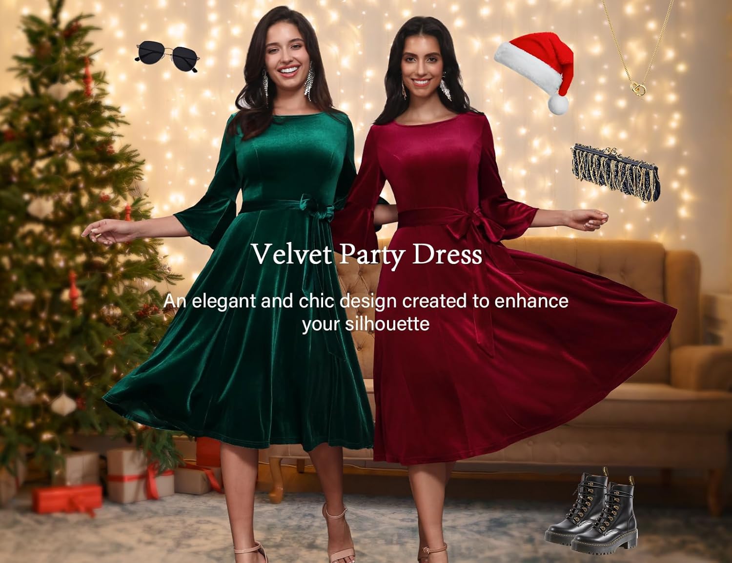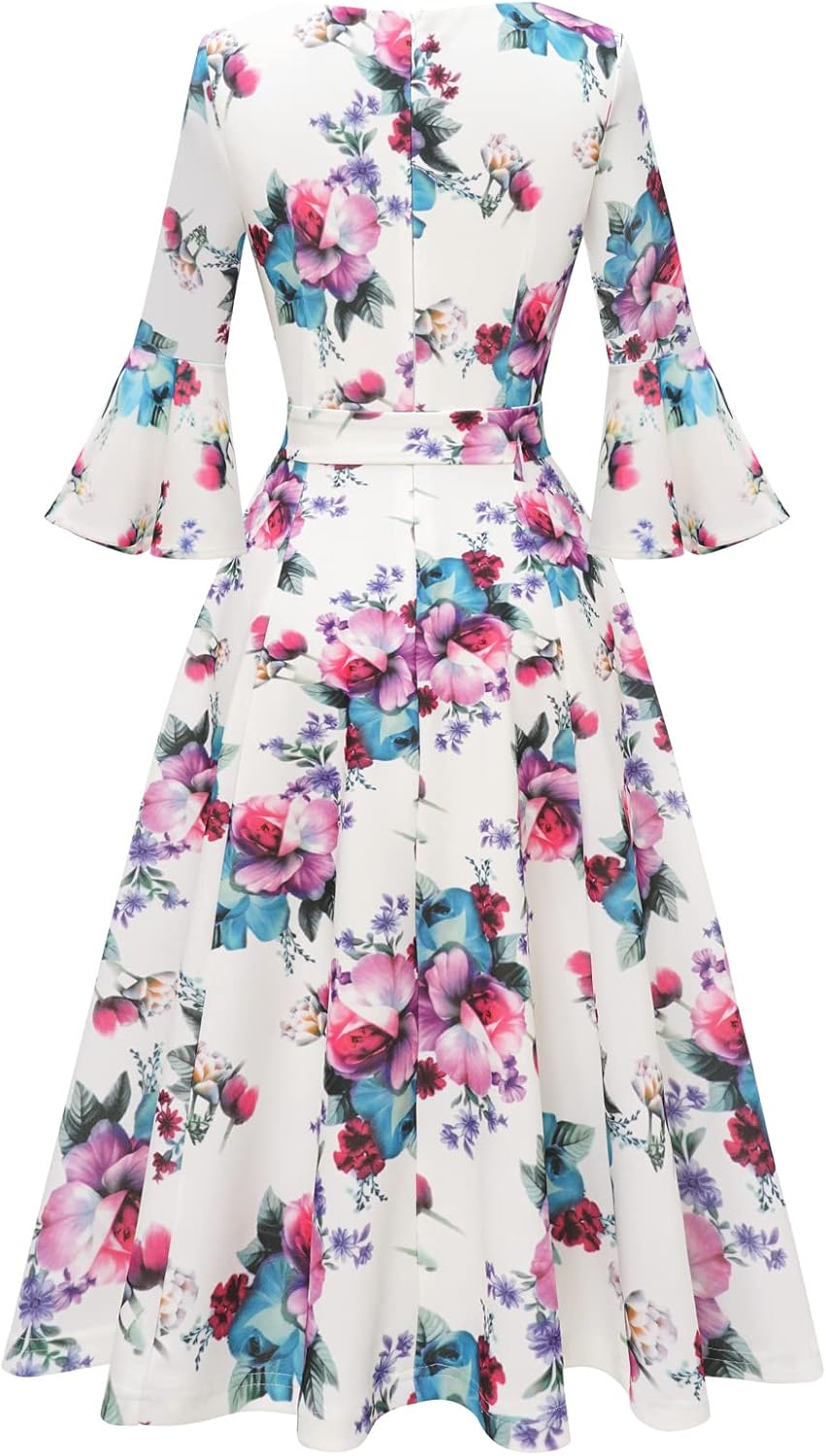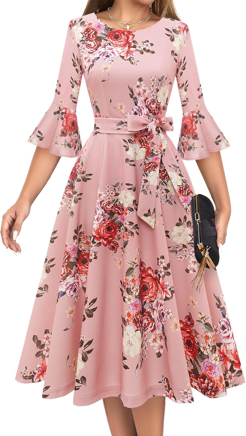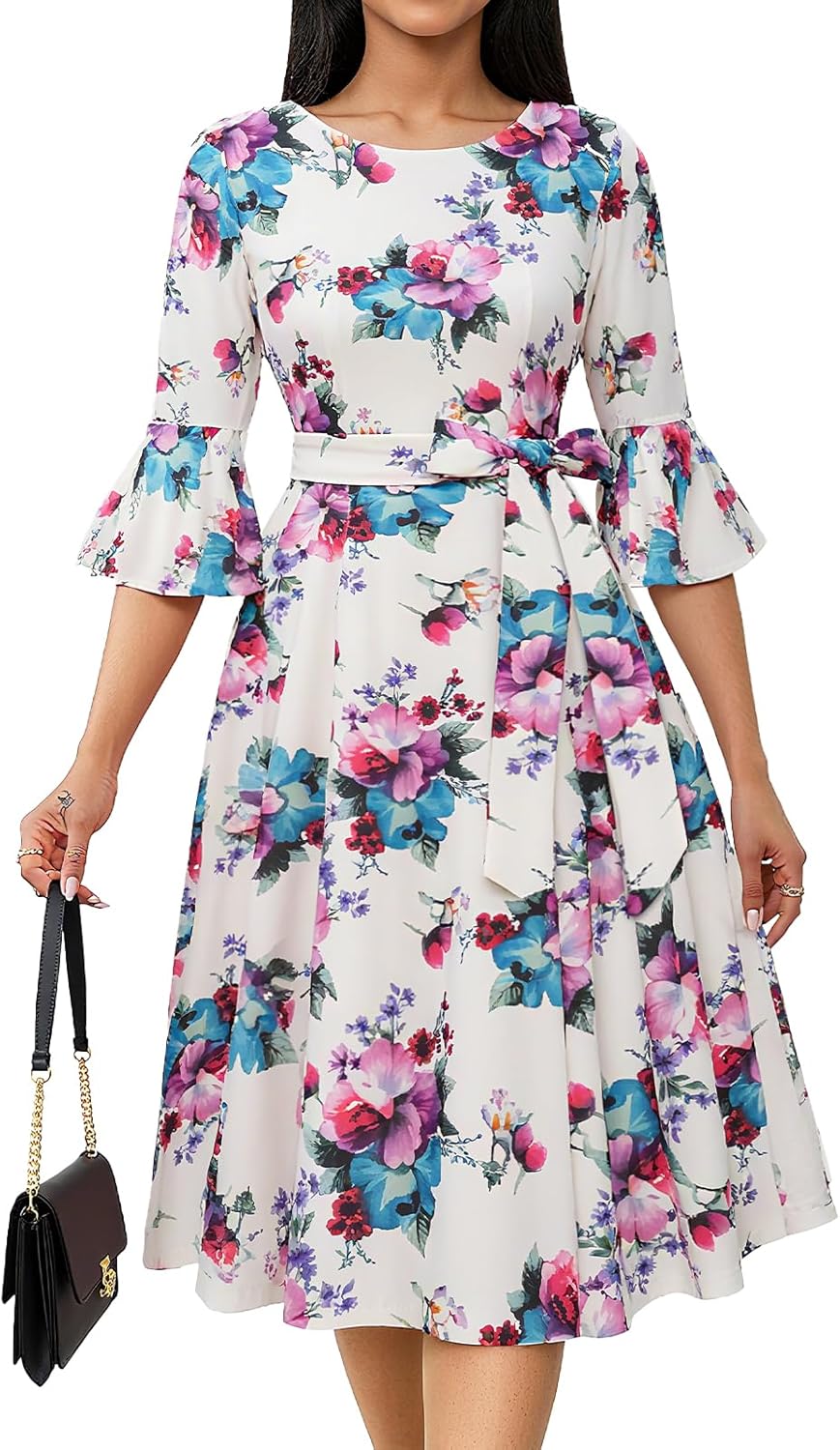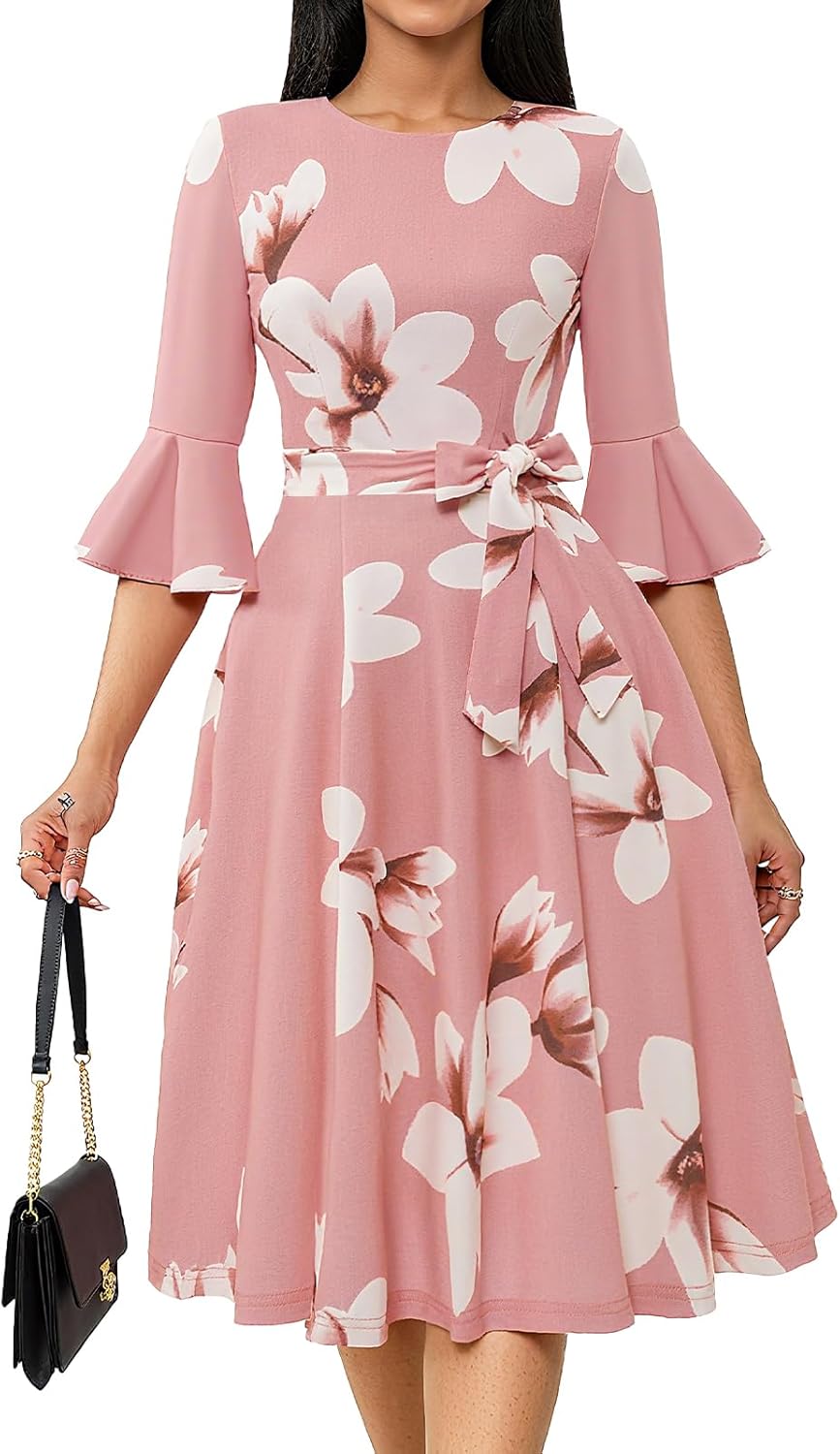 Features:Round Neck, Flare Bell Sleeve, 3/4 Sleeve, Decorative Belt, Three Quarter Sleeve, Midi Knee Length, Flared Swing, Above knee length, Concealed zipper back, Unlined but not see-through. Perfect Wedding Guest Dress for Autumn,Winter and Early Spring Seasons