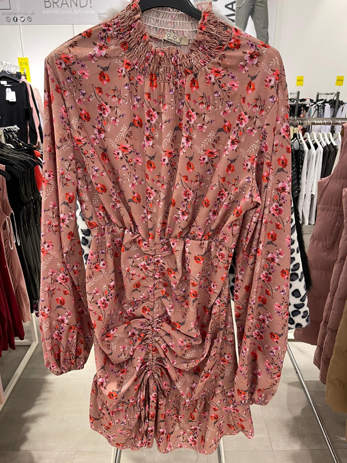 Mocha Floral Print Elastic Round Neck Full Sleeve Ruched Dress