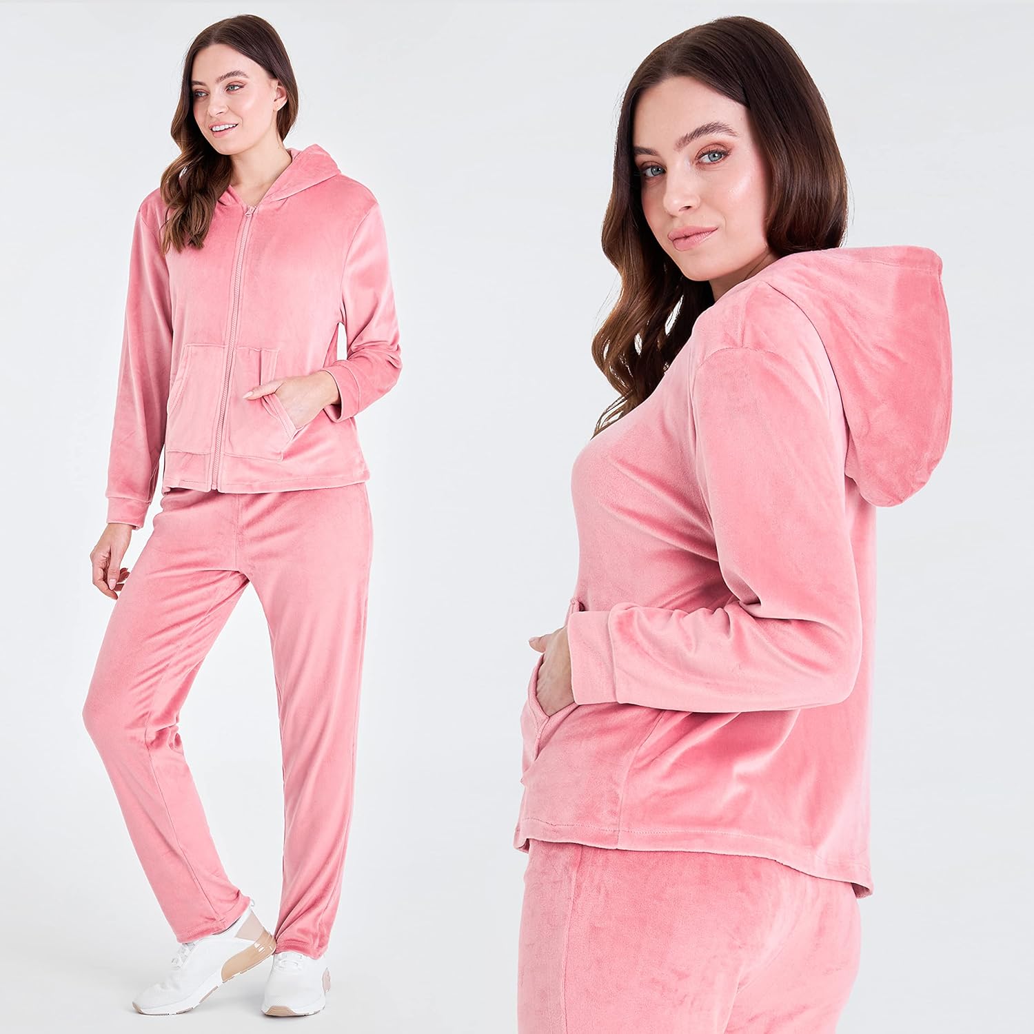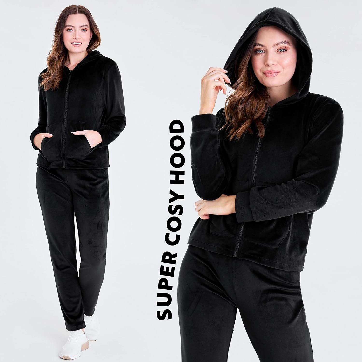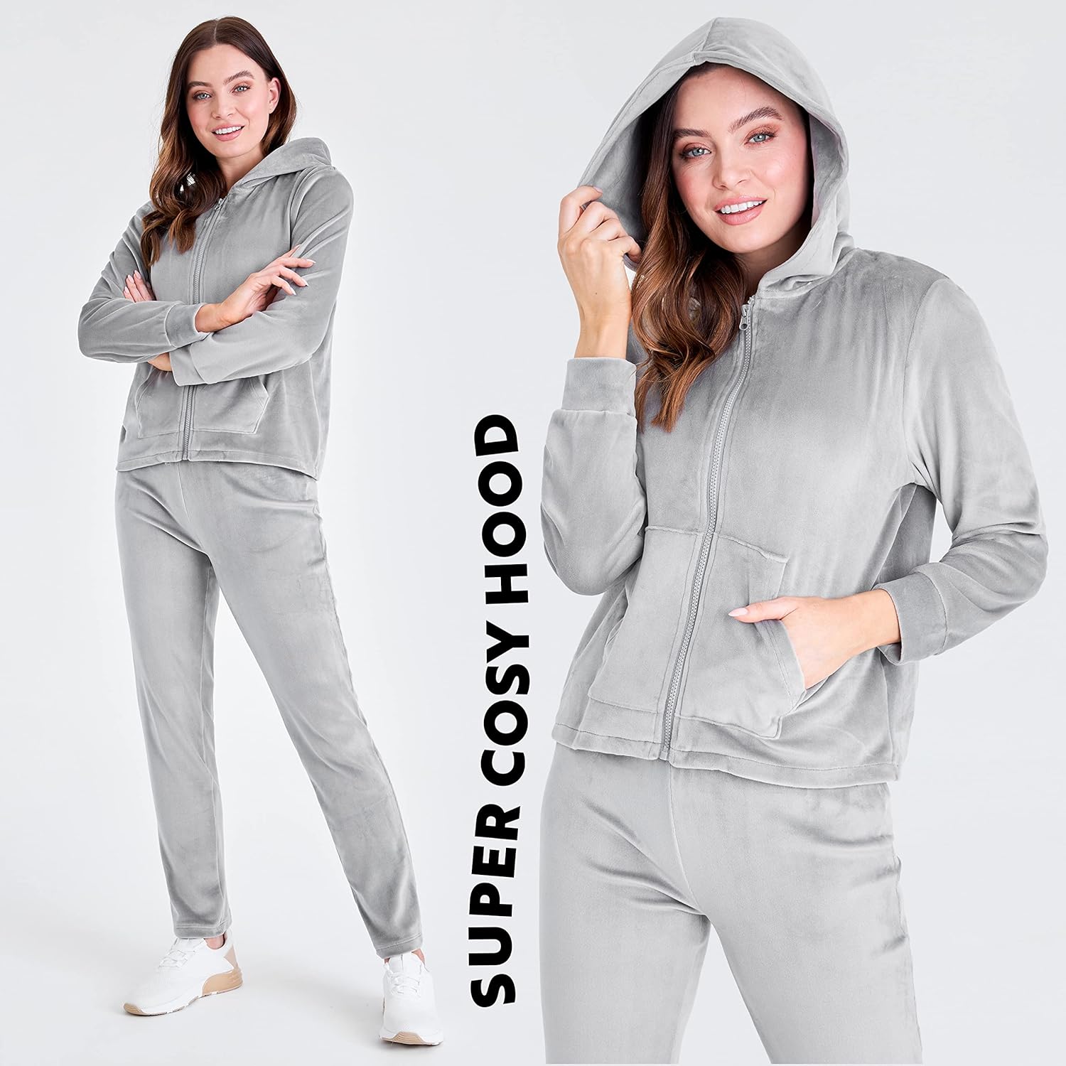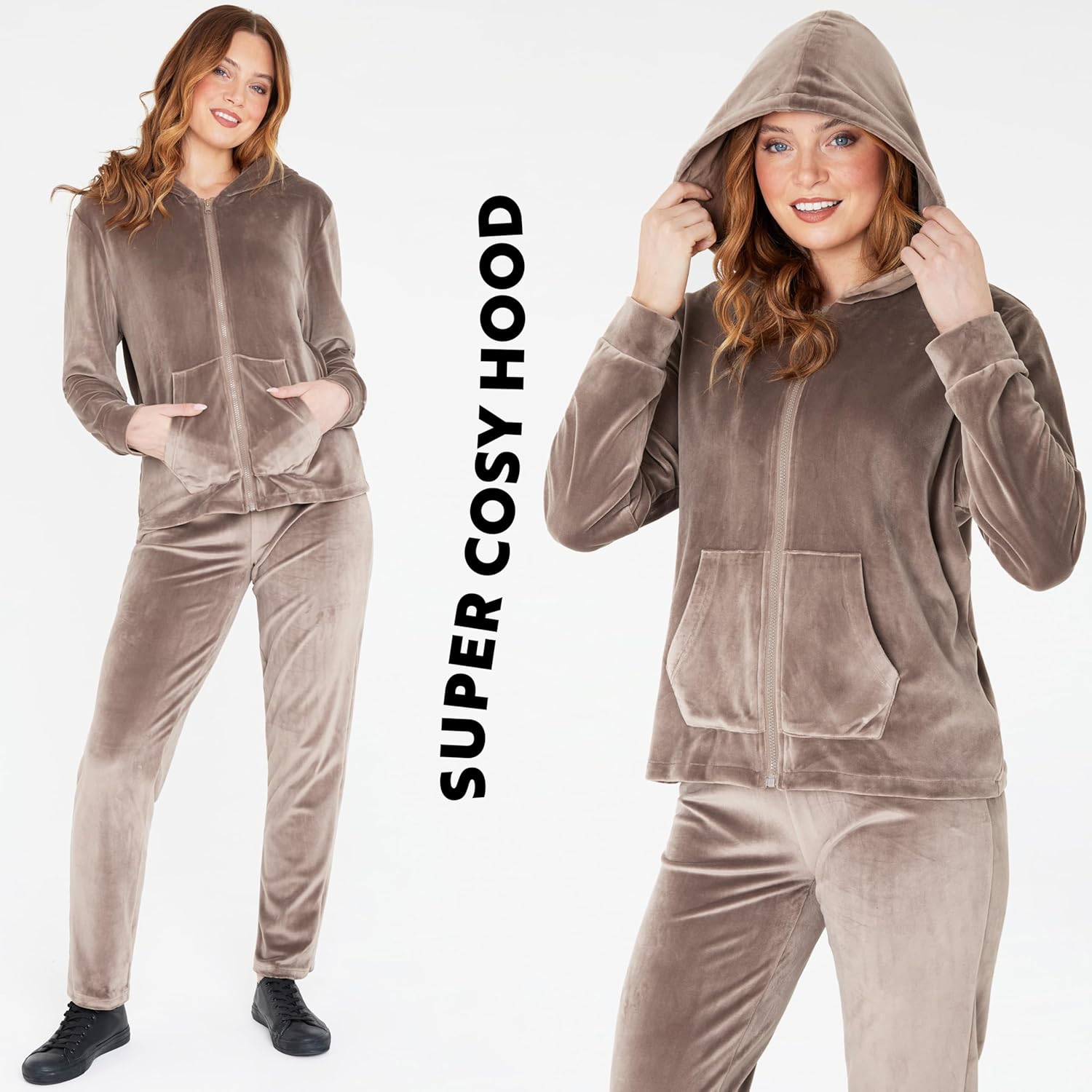 Velour womens tracksuit set with hoodie and joggers, in a range of stylish colours
