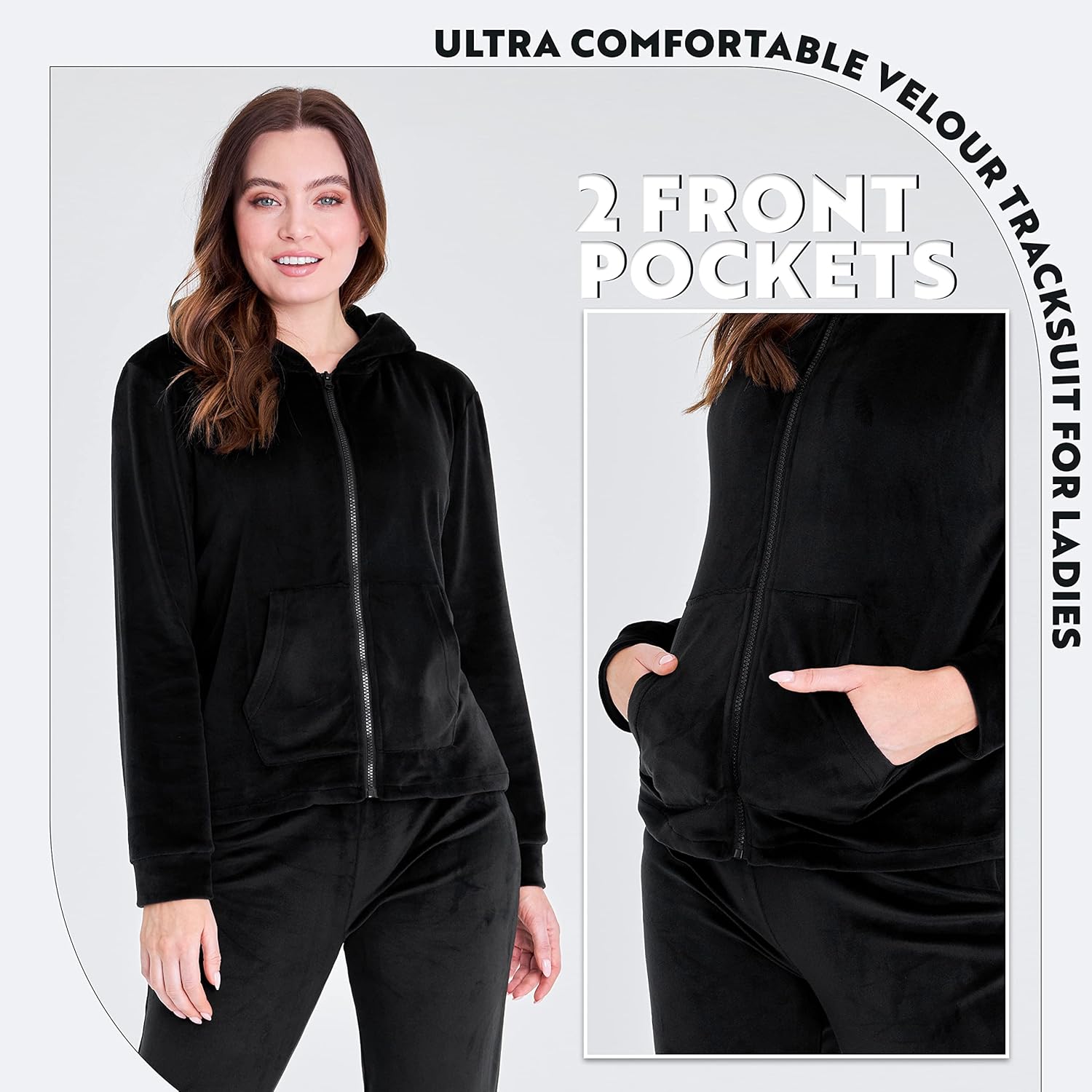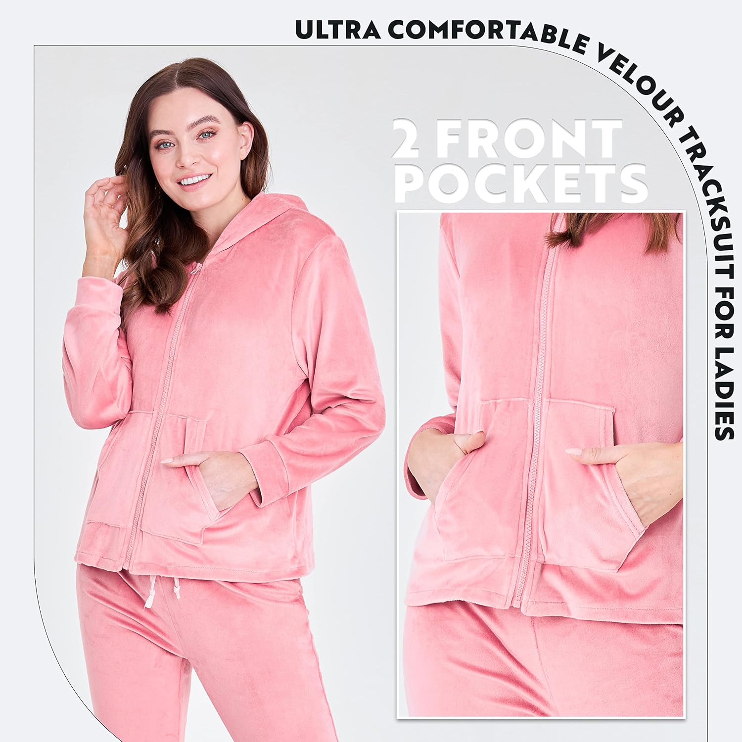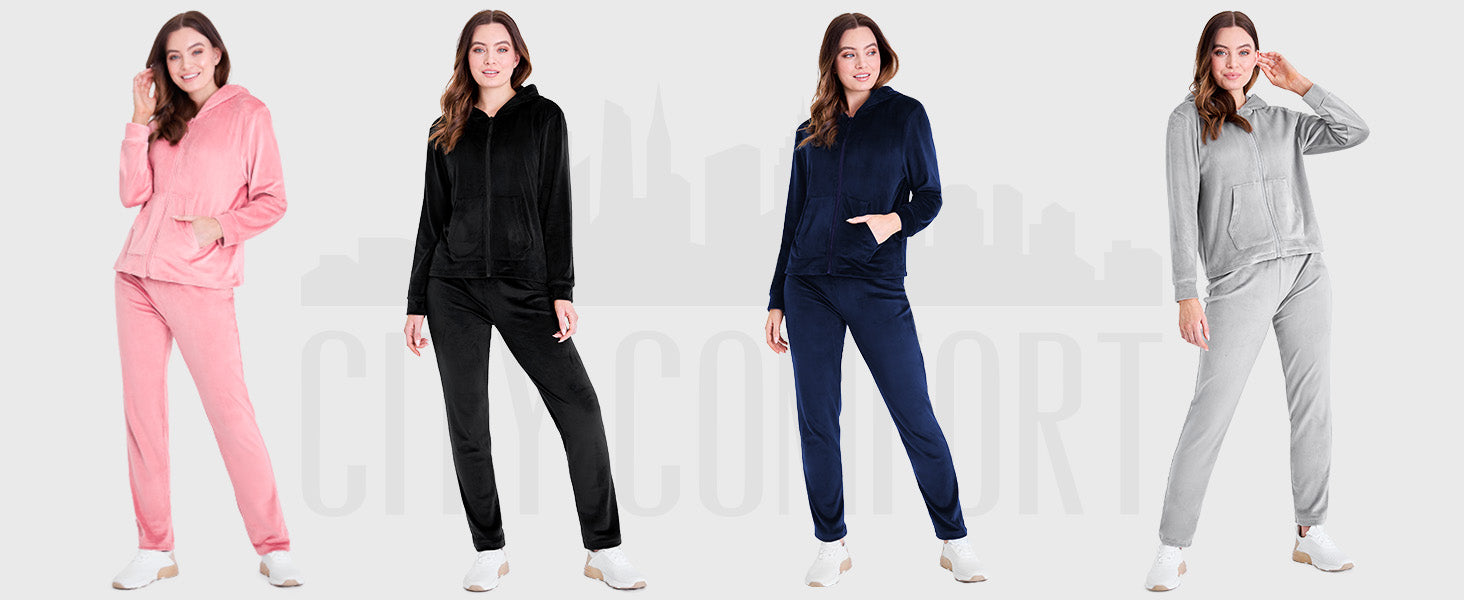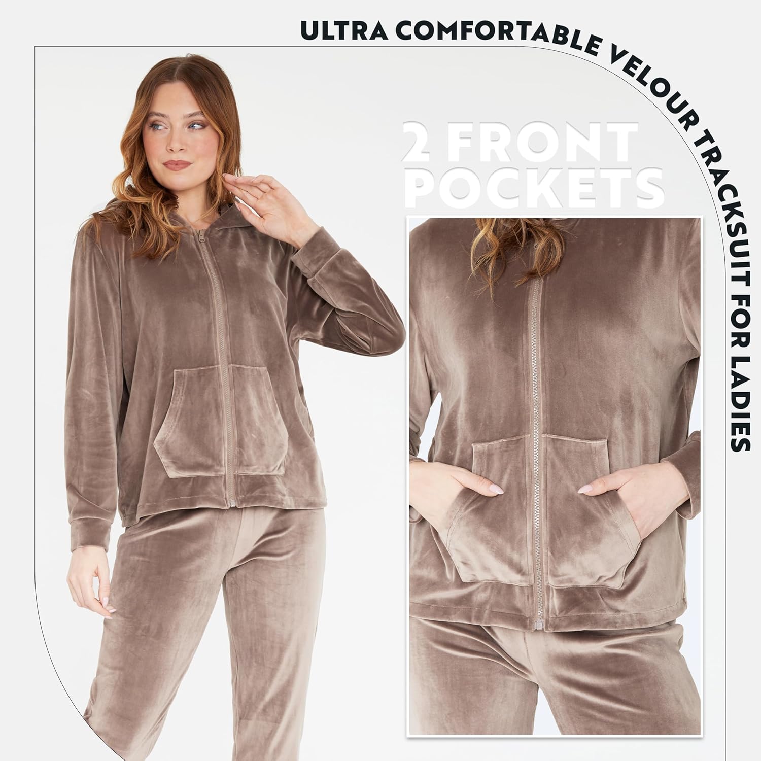 Velour womens tracksuit set with hoodie and joggers, in a range of stylish colours