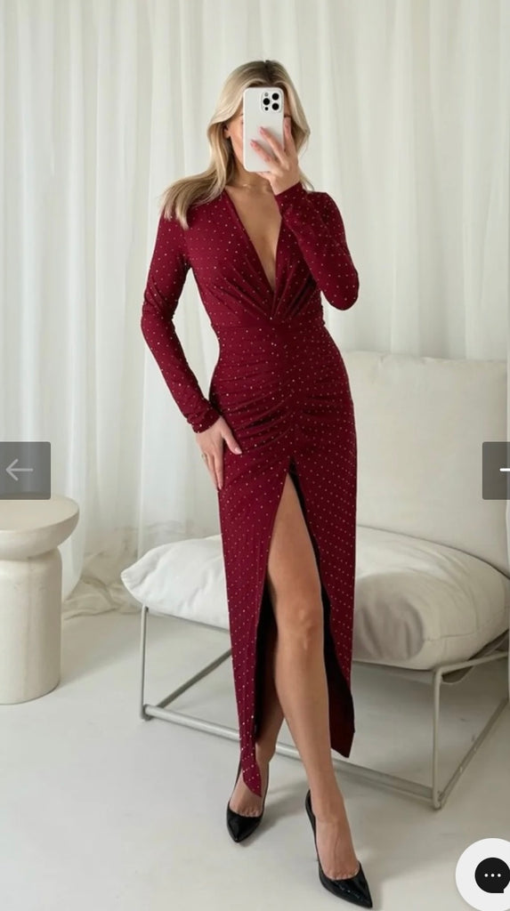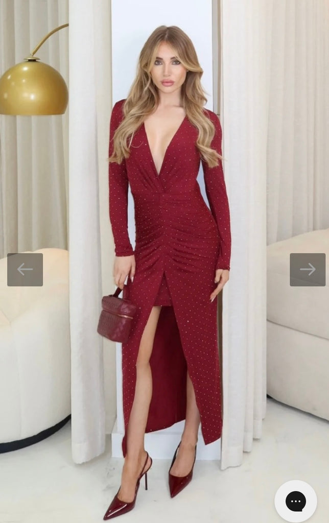 burgundy diamante split front dress