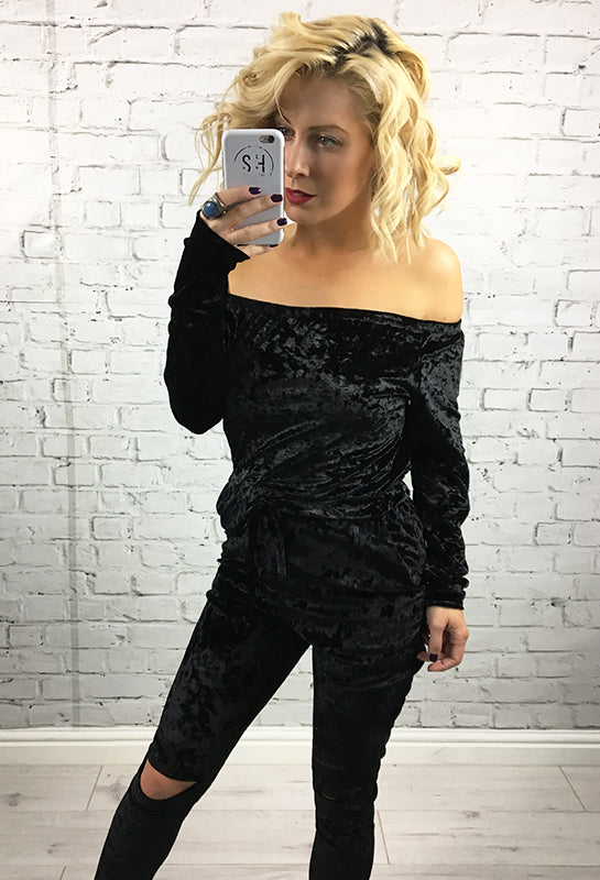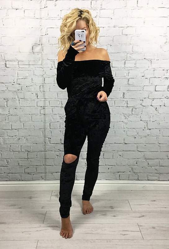 Black Crushed Velvet Off The Shoulder Split Knee Elle Jumpsuit - M/L 12-14 is backordered. It will be shipped when back in stock.