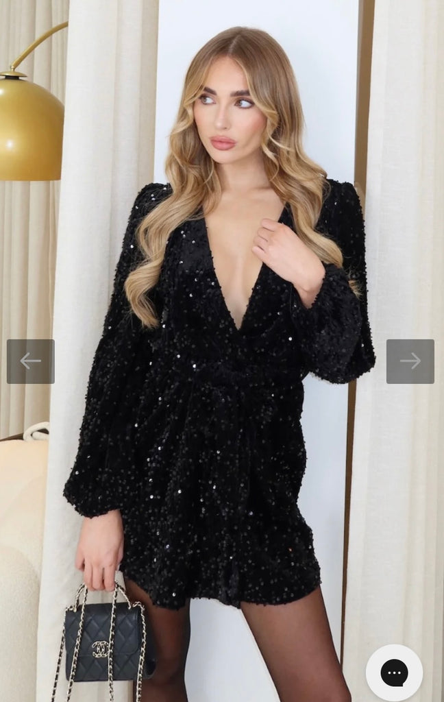 black sequin wrap dress