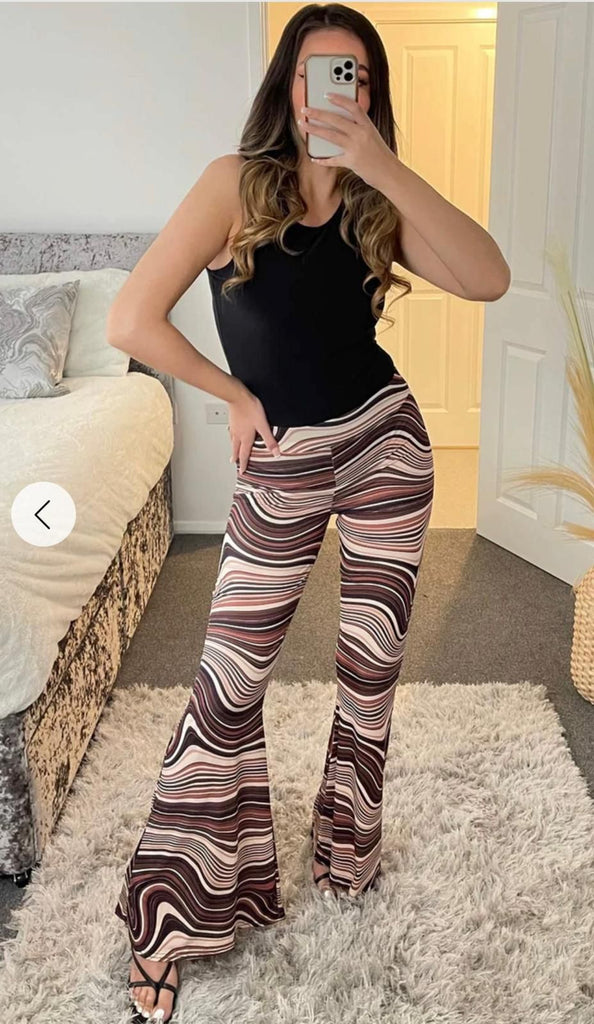 Trending RN, flare trousers. Featuring a swirl print with a ruched detailing perfect for accentuating those curves with a...