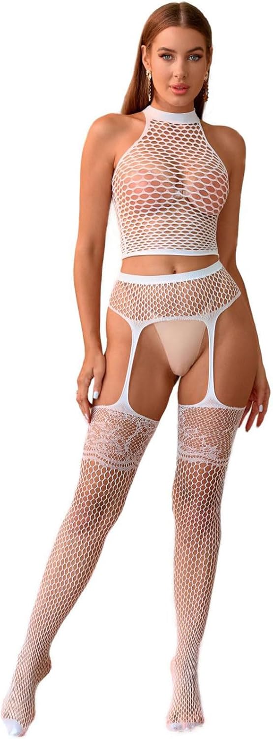 Fishnet Lingerie Set,Women's Sexy Lingerie Set Lace Garter + Top Hollow-Out Fishnet Mesh Sleepwear Party Base Free Size