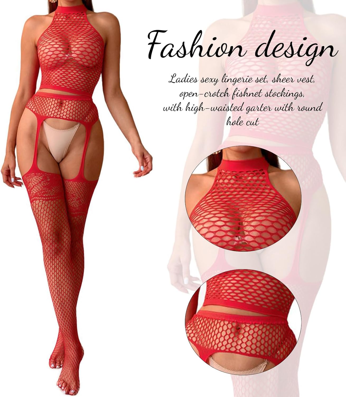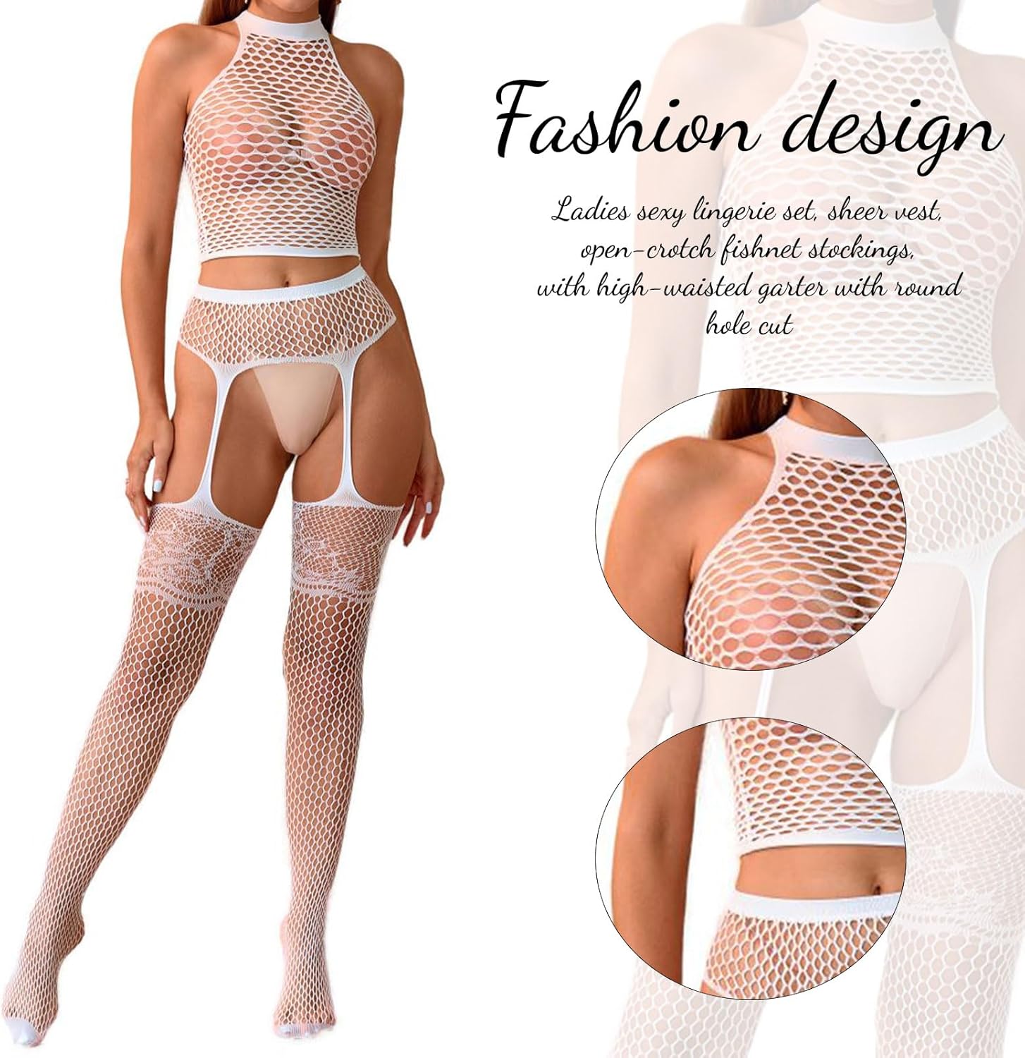 FASHION DESIGN:Women Sexy lingerie set with transparent vest open crotch fishnet socks A matching high waisted garter with round hole cutout,making you attractive and charming.