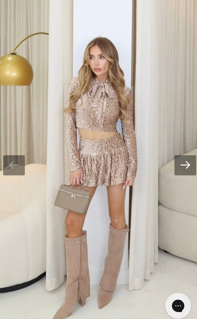 nude sequin top and puffball skirt co-ord