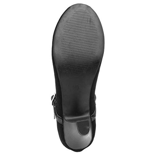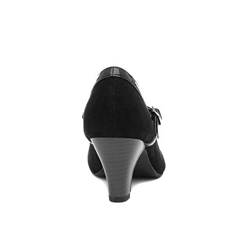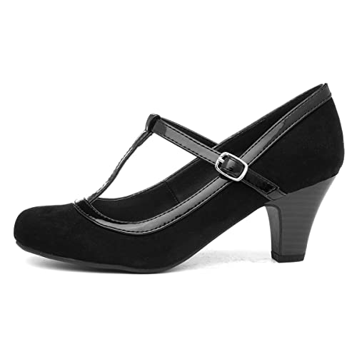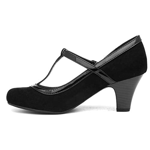 Invest in a pair of womens black faux suede T-Bar court shoes. These shoes are sure to become your new go-to pair for everything from work to evenings outs. Featuring faux suede effect upper with round toe, a T-Bar strap with buckle fastening and patent trim edges, metallic insole and a medium heel just the right height for all day wear.